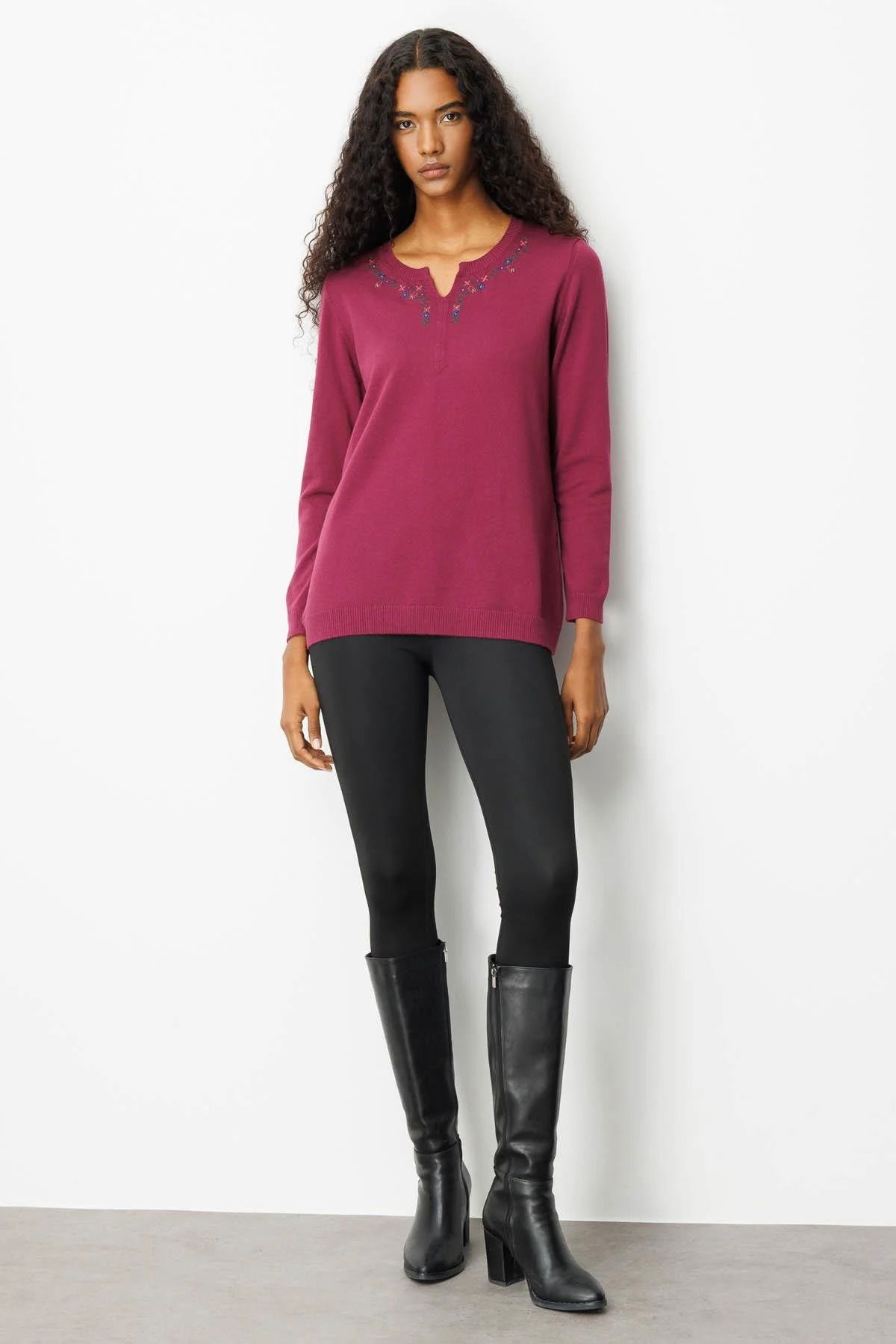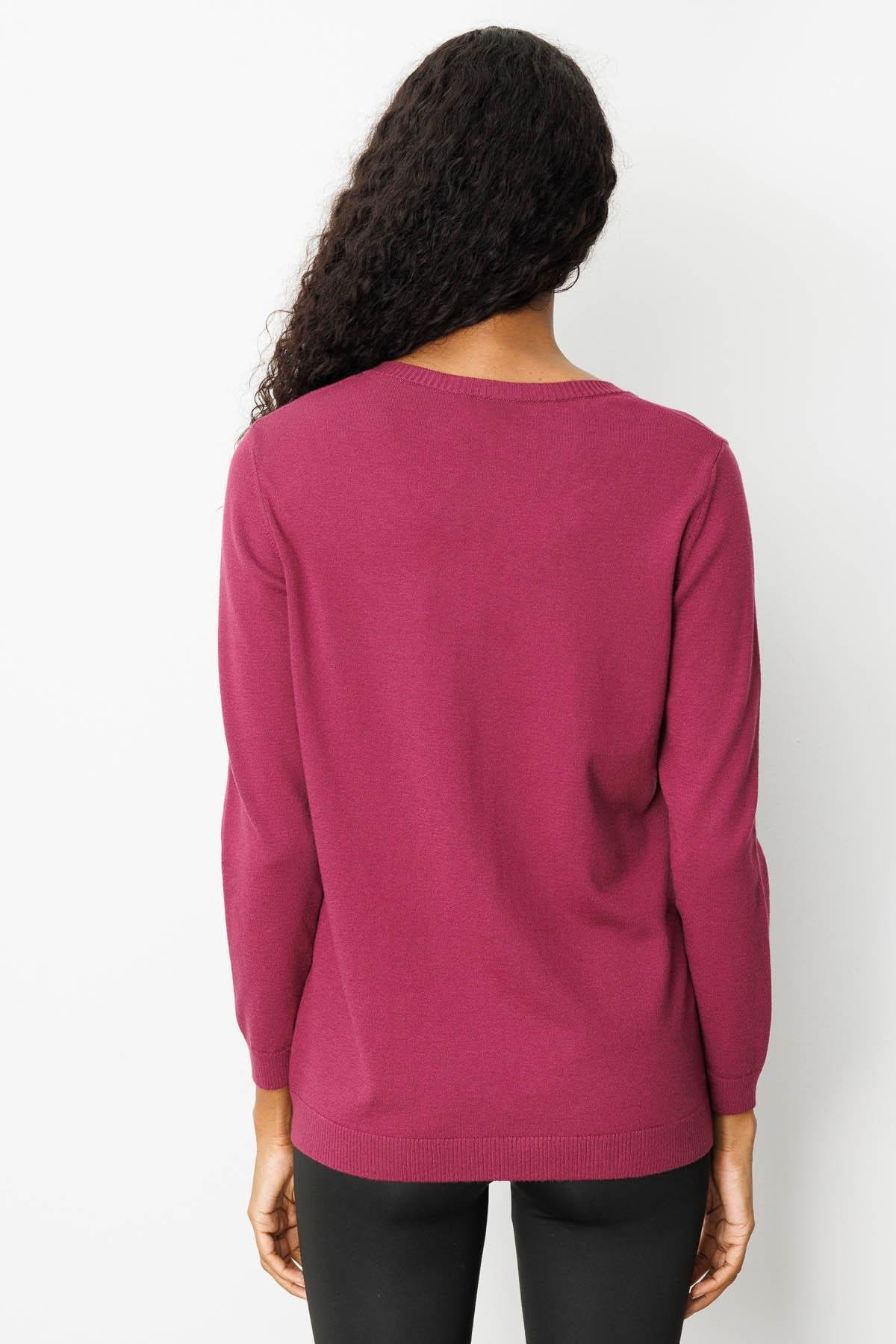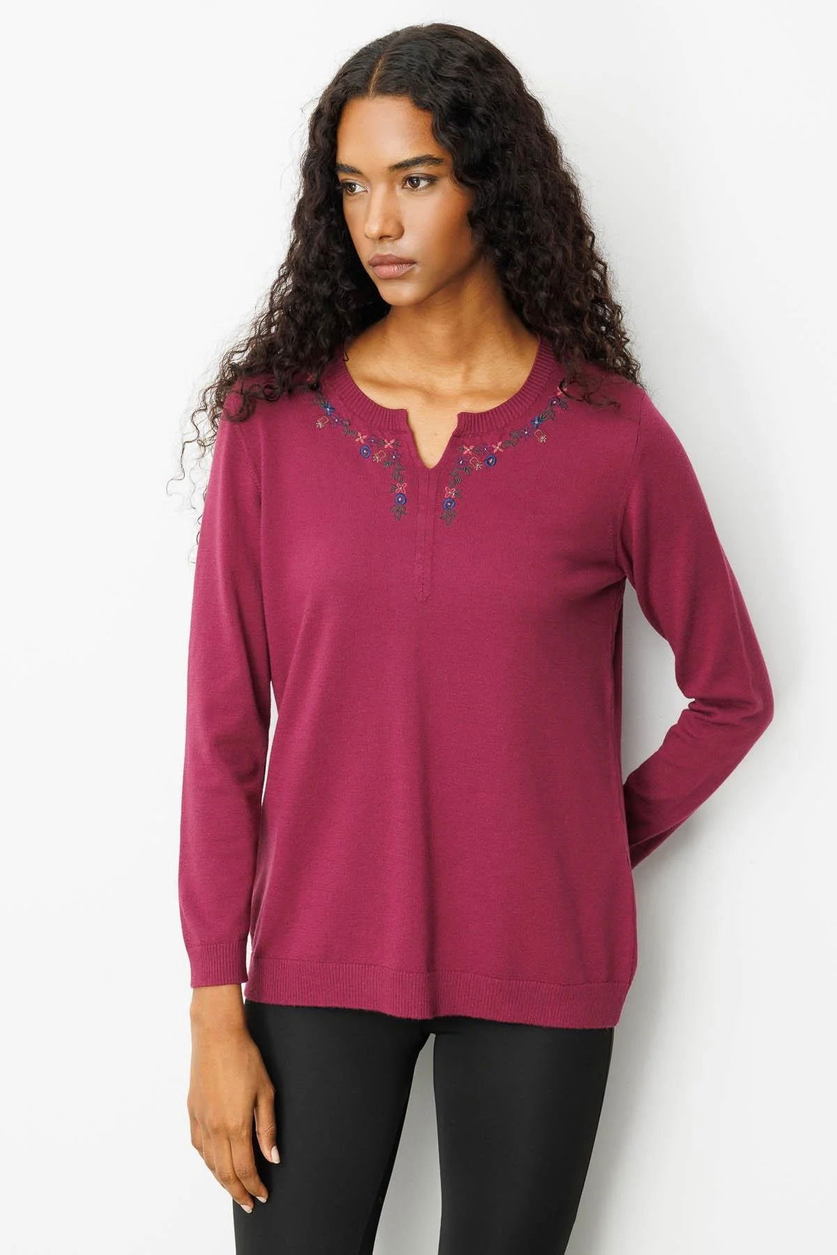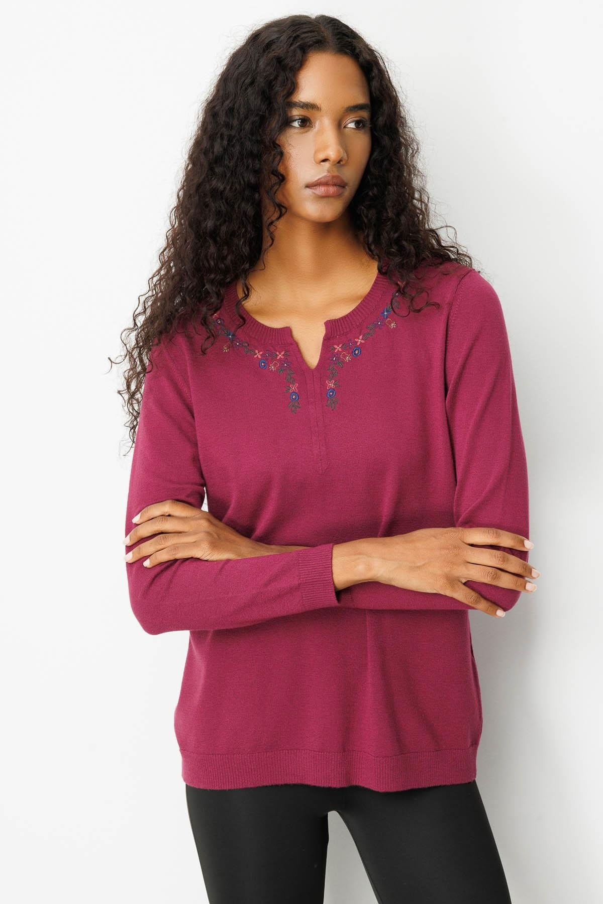 Desen Triko Kadın Sıfır Yaka Yakası Çiçek Nakış İşlemeli Bluz 25094 Mürdüm