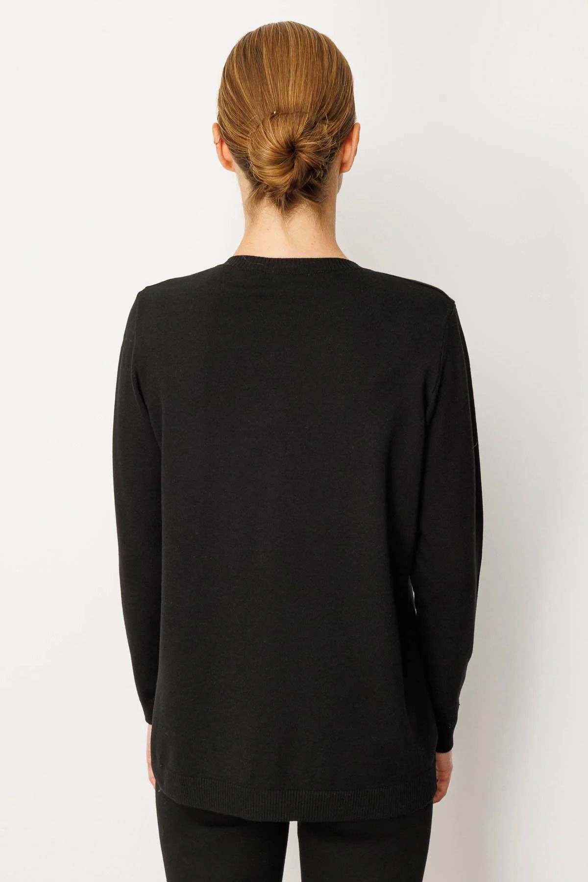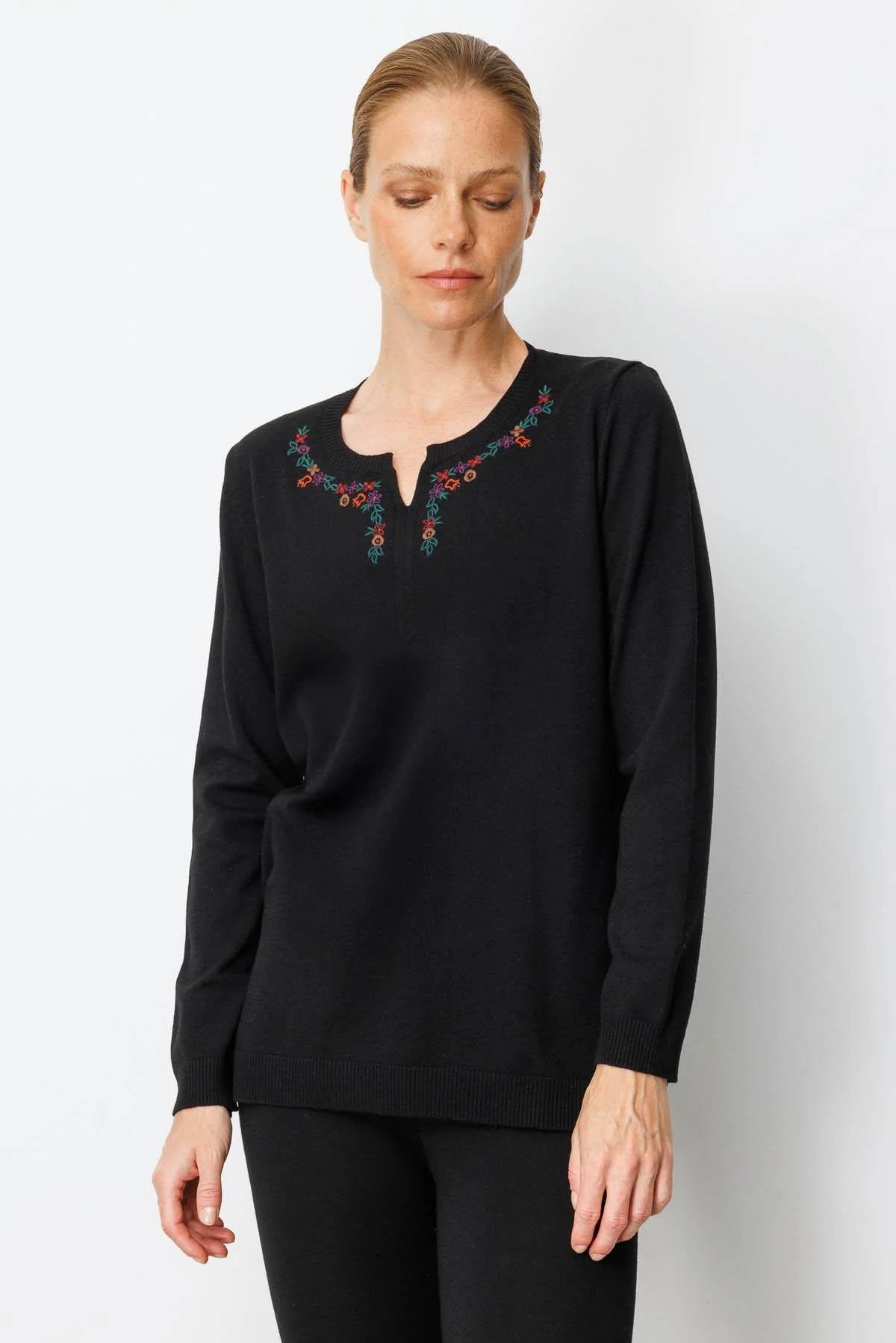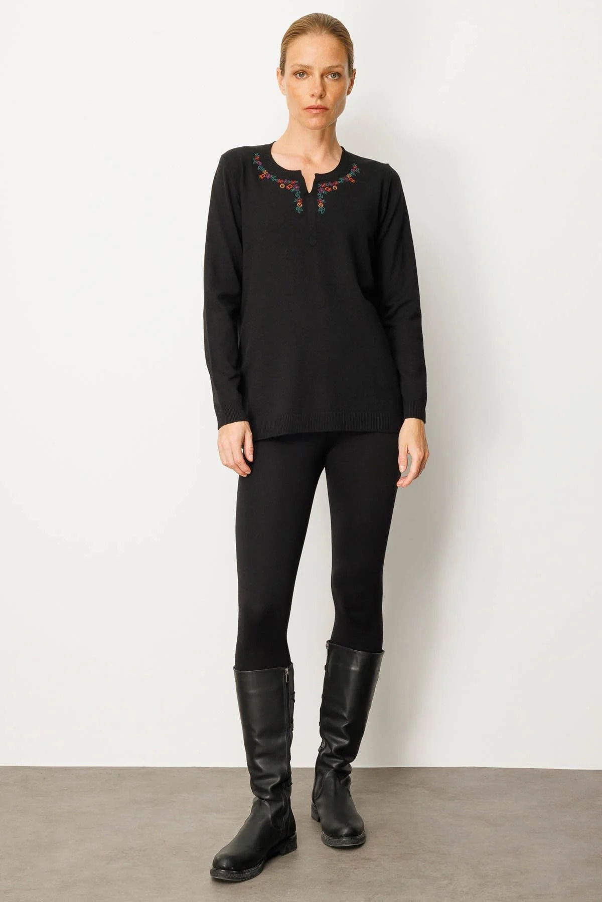 Desen Triko Kadın Sıfır Yaka Yakası Çiçek Nakış İşlemeli Bluz 25094 Siyah