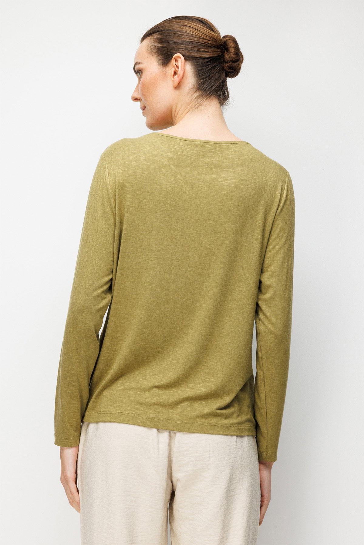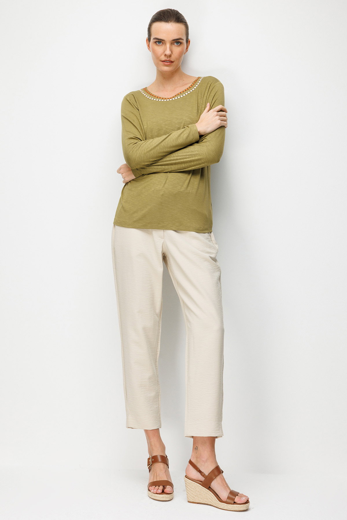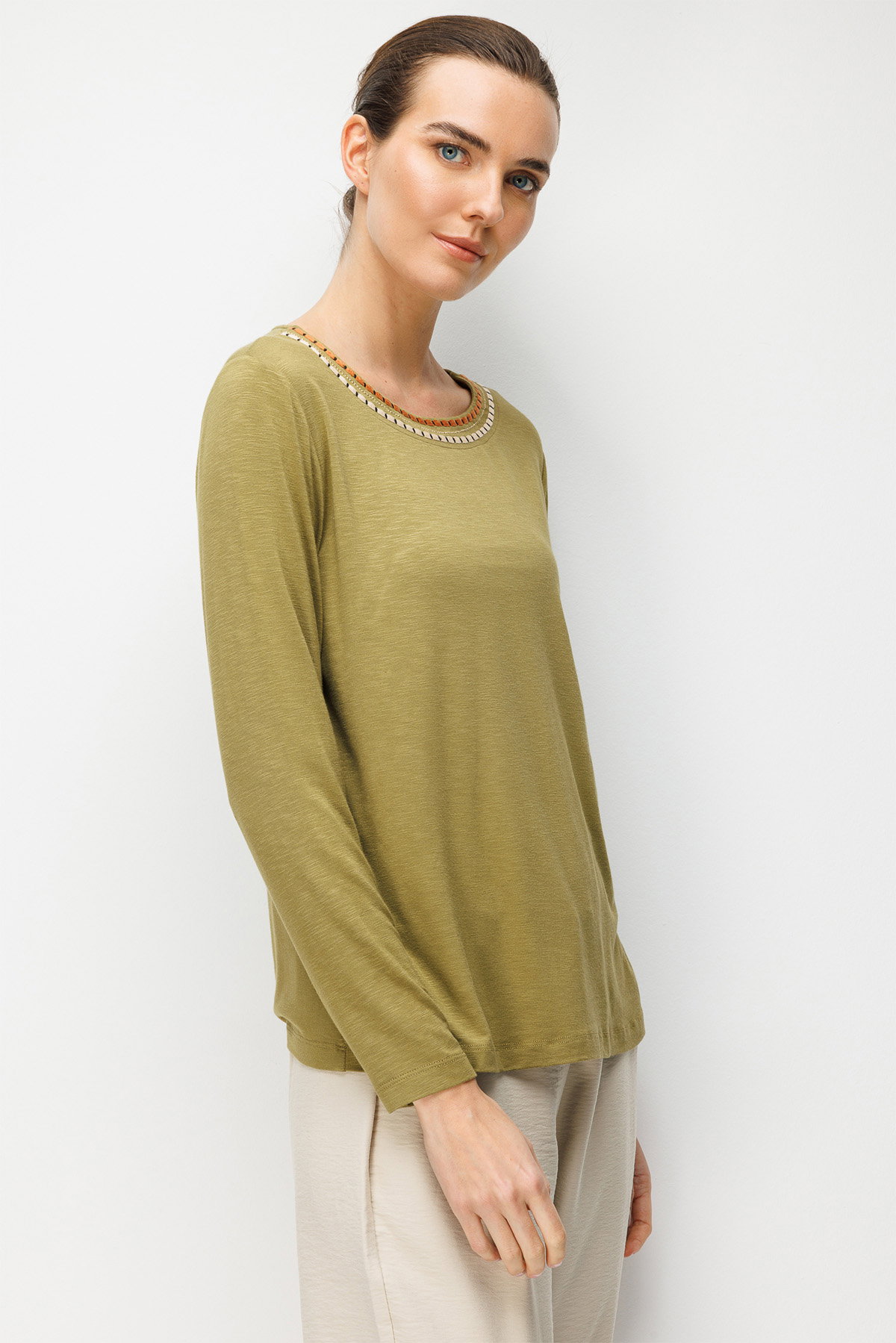 Desen Triko Kadın Sıfır Yaka Yakası İki Renkli İşlemeli Taşlı Penye Bluz 26848 Haki