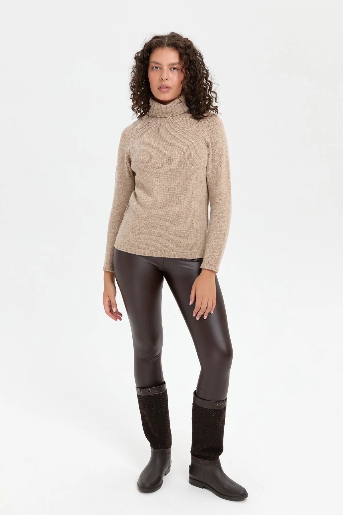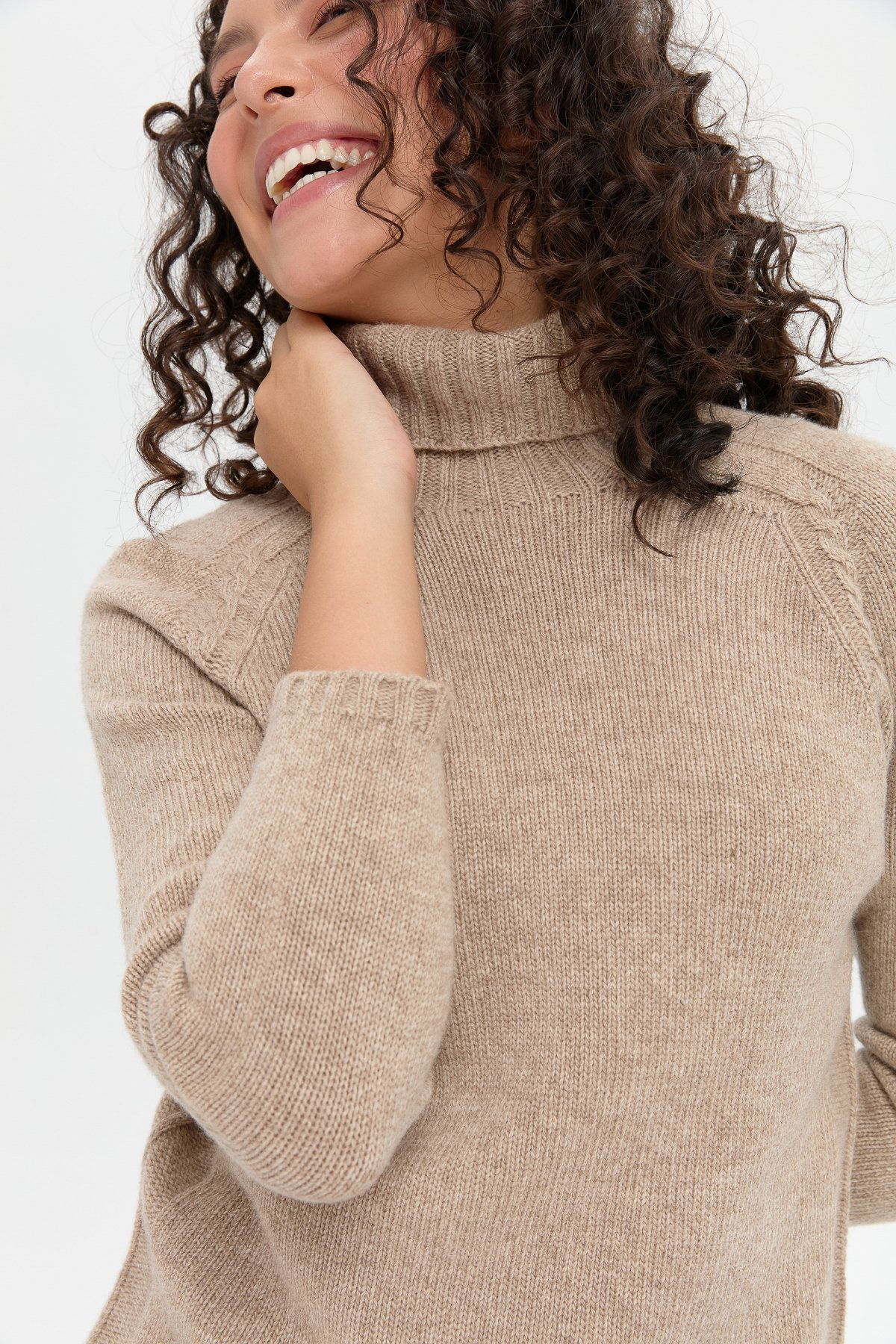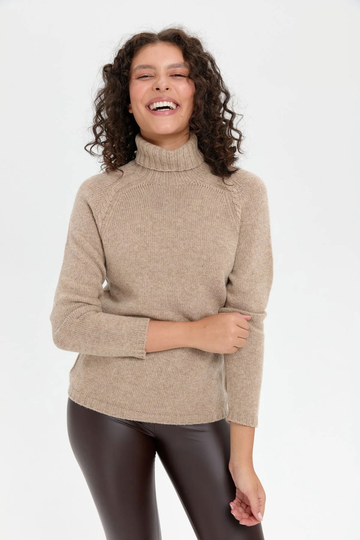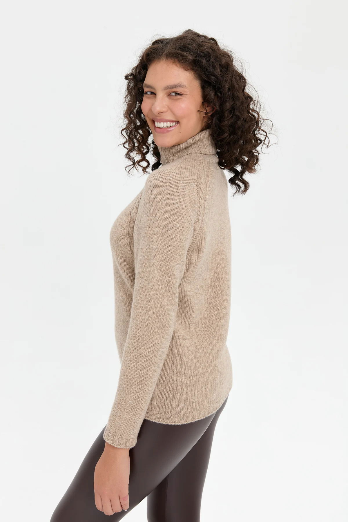 Desen Triko Kadın Tam Balıkçı Yaka Omzu Saç Örgülü Yün Kazak 22097 Bej