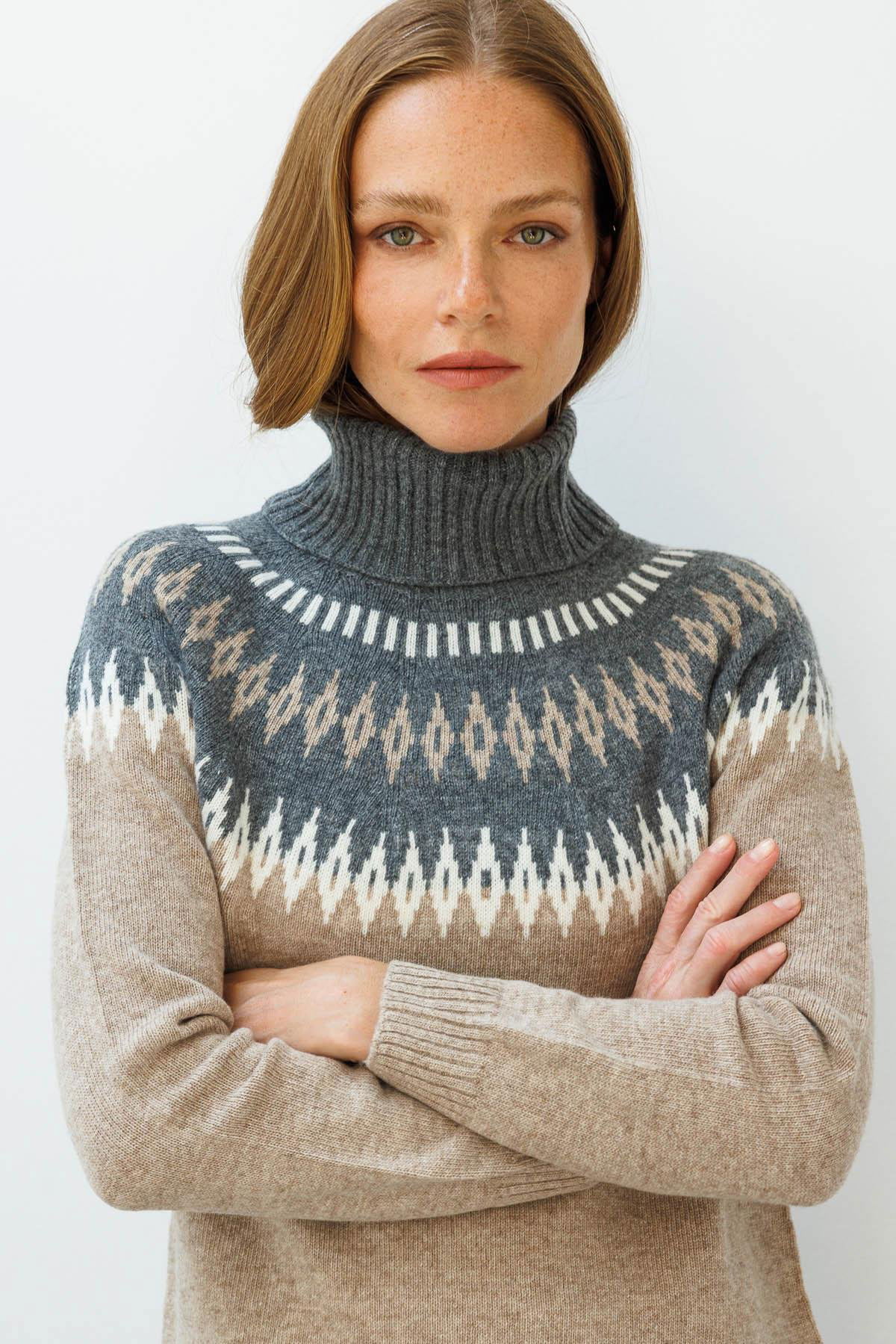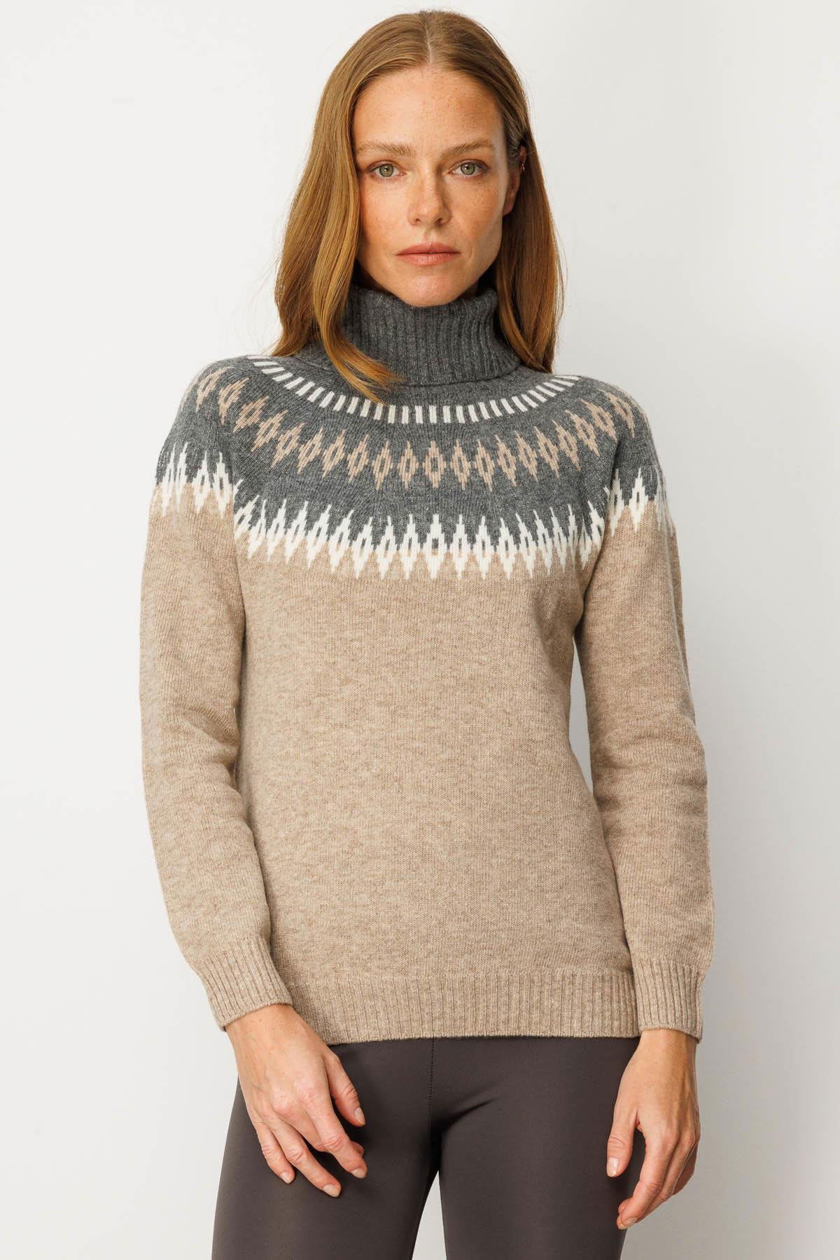 Desen Triko Kadın Tam Balıkçı Yaka Robası Baklavalı Yün Kazak 25219 K. Bej