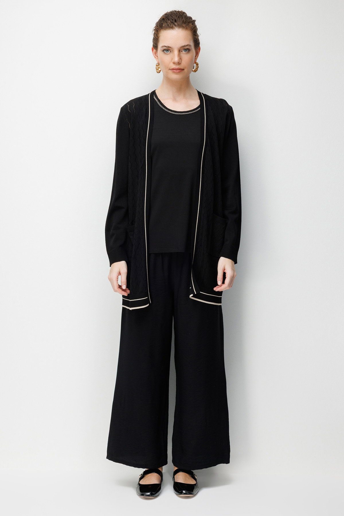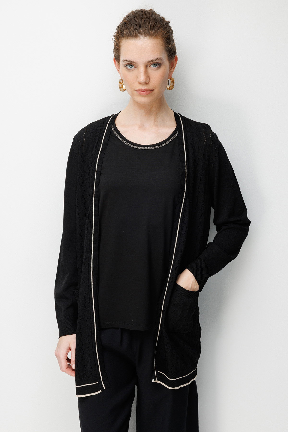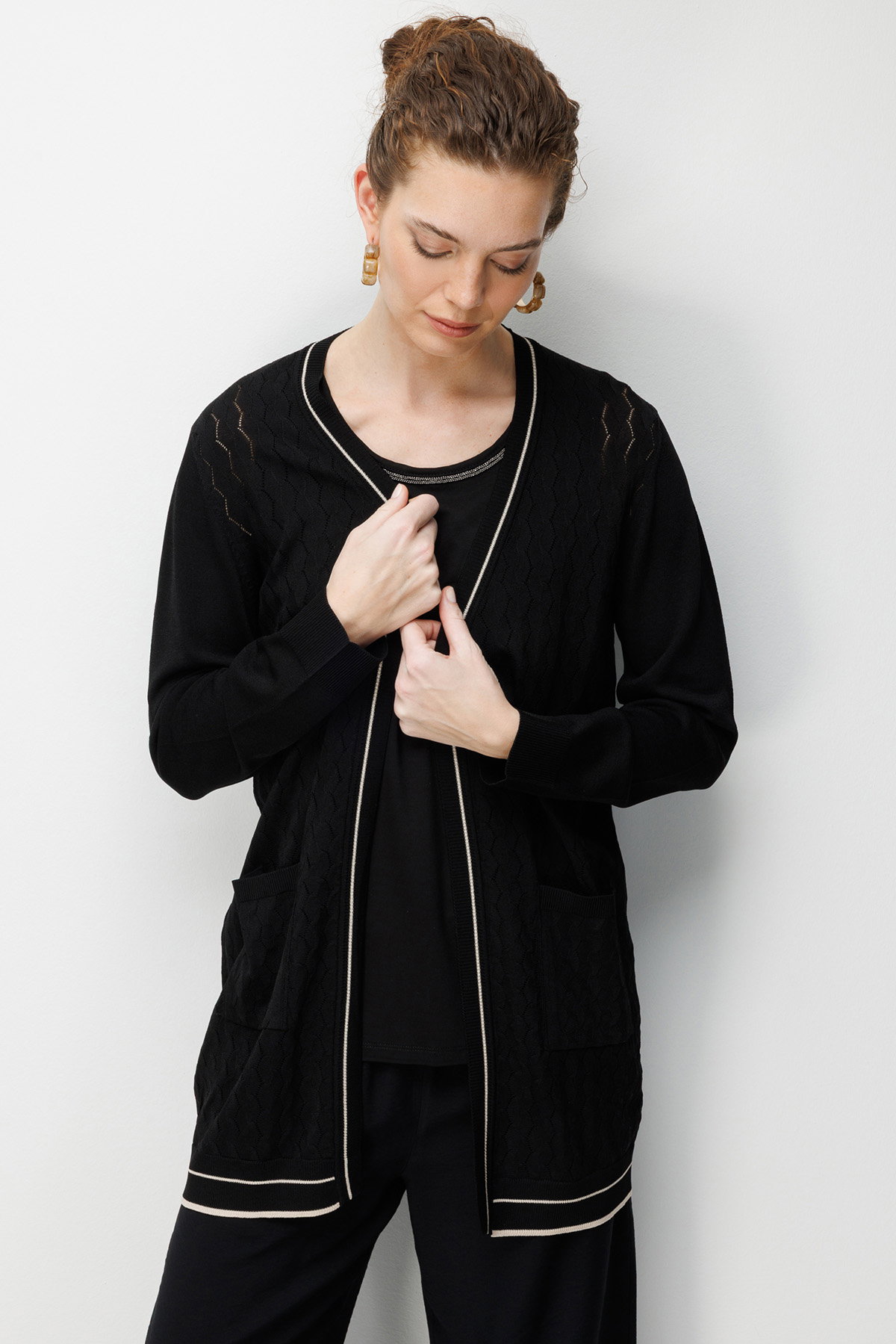 Desen Triko Kadın V Yaka Ajurlu Önü Açık İnce Triko Hırka 26357 Siyah