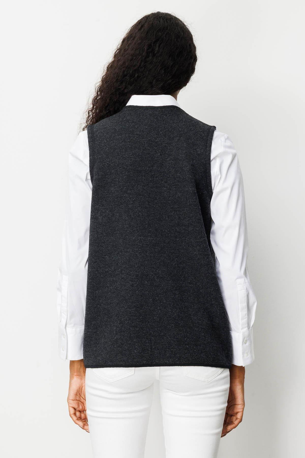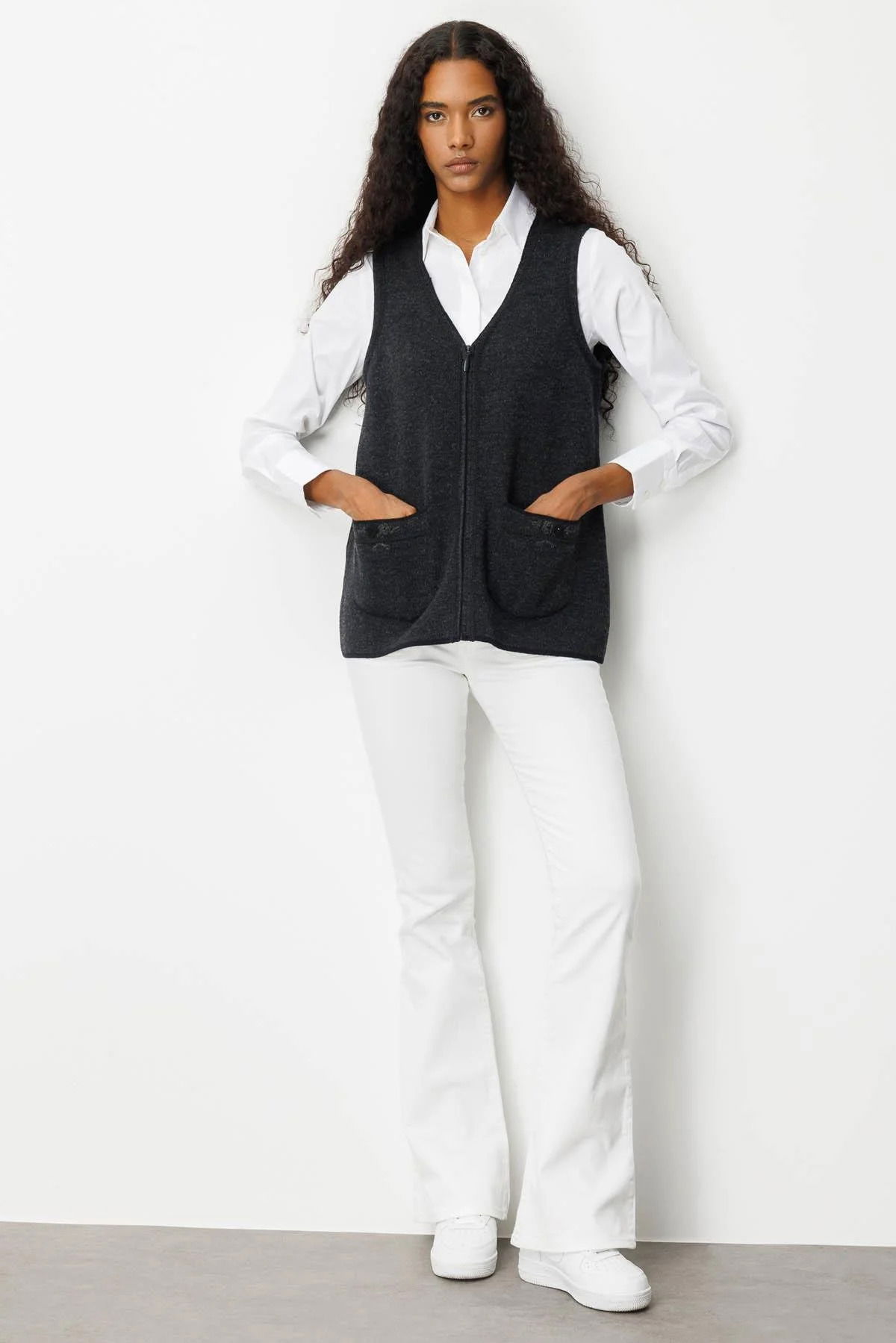 Desen Triko Kadın V Yaka Cebi Nakış İşlemeli Yün Yelek 25030 Siyah