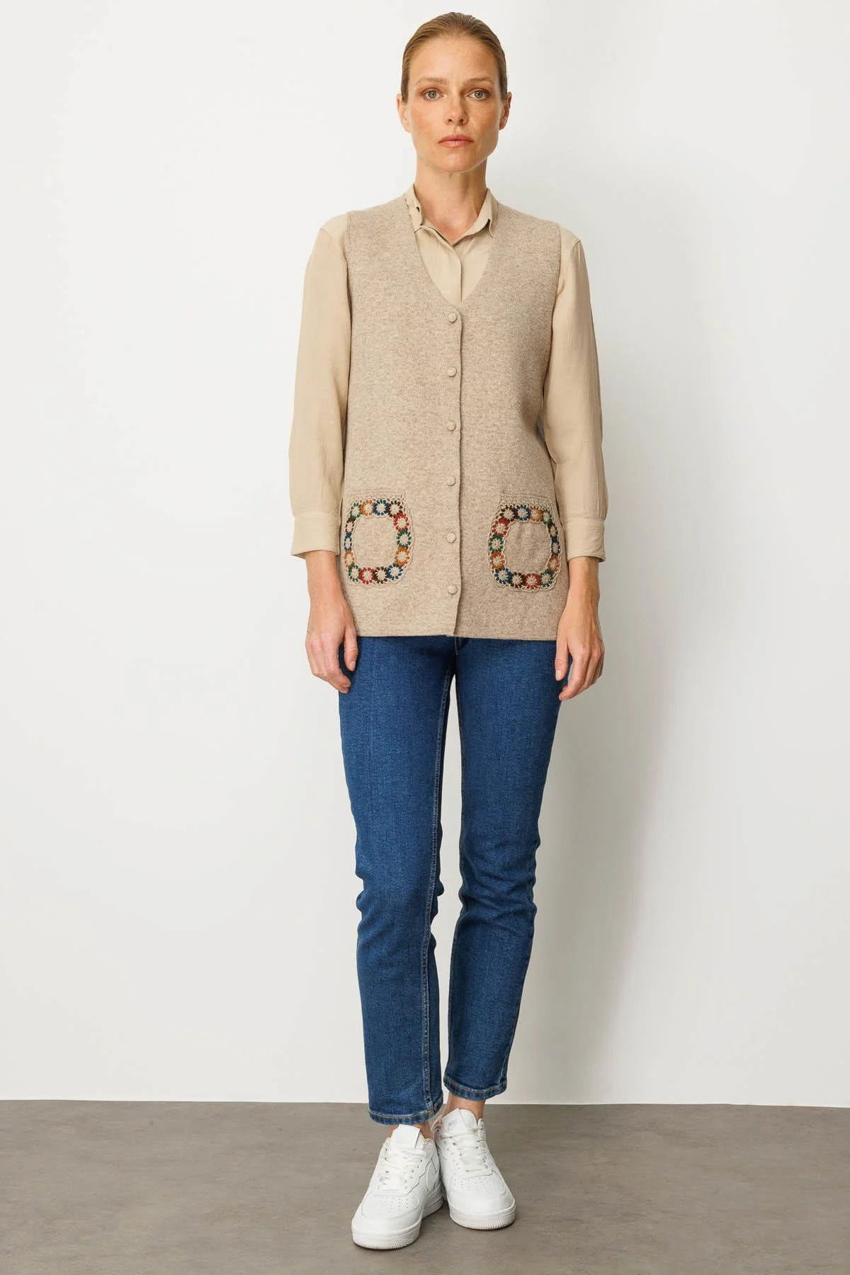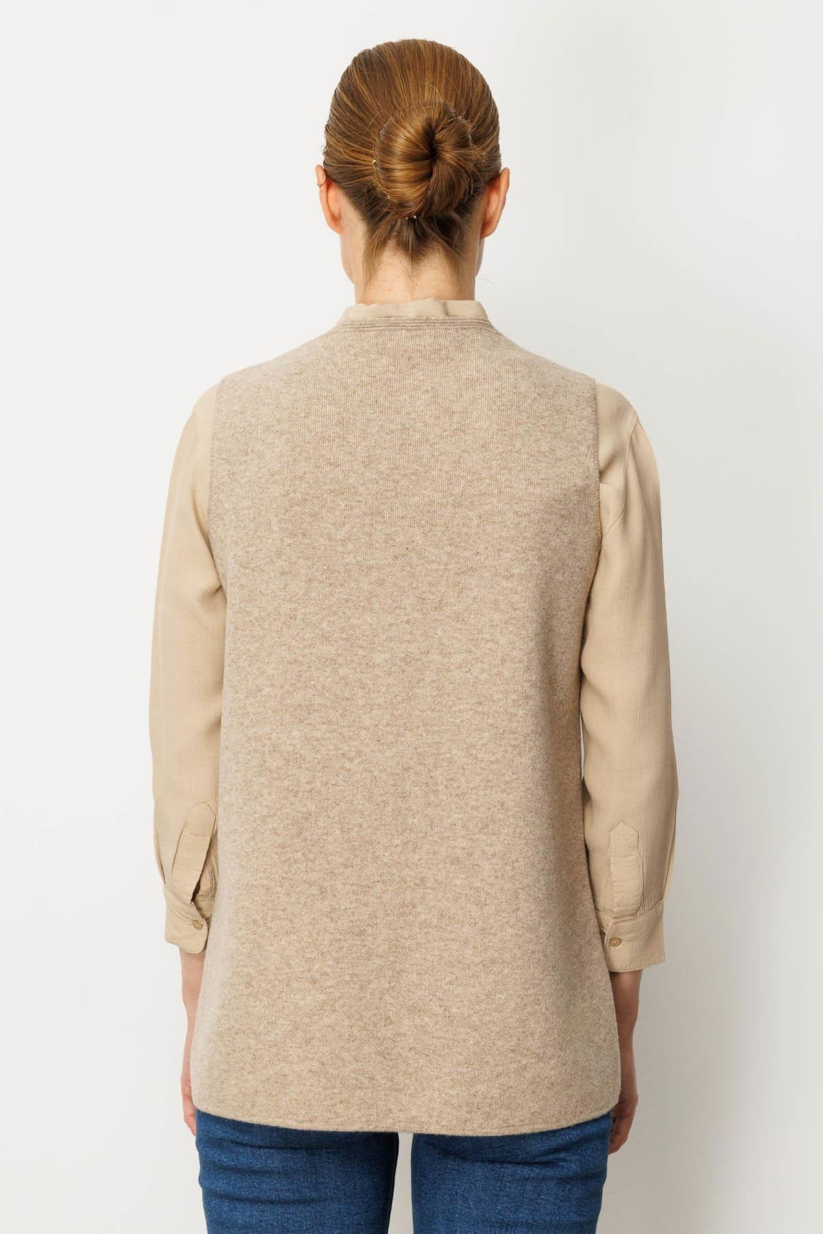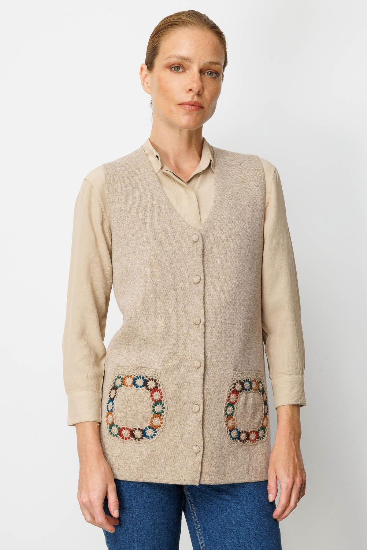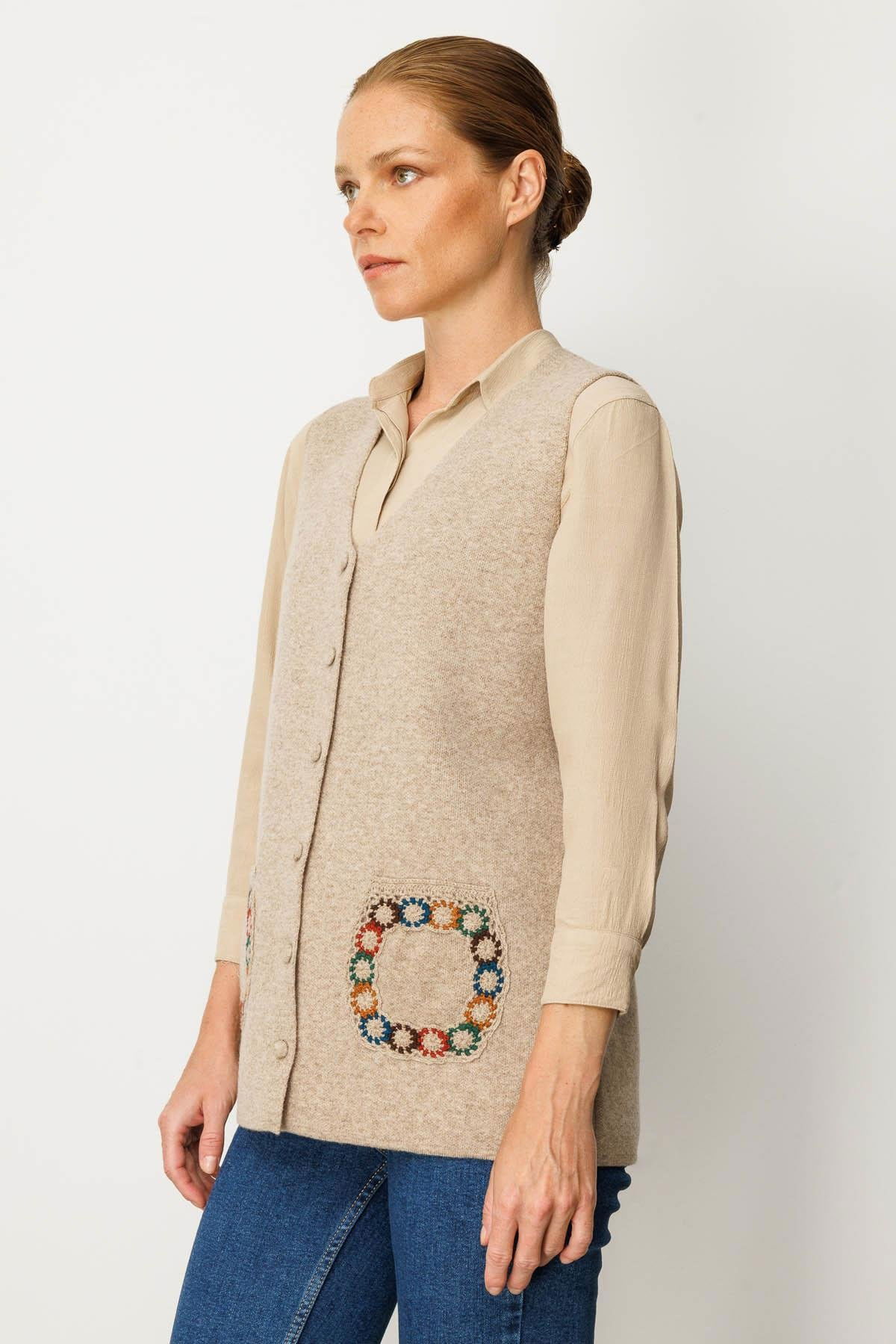 Desen Triko Kadın V Yaka Cebi Tığlamalı Yün Yelek 25020 K. Bej
