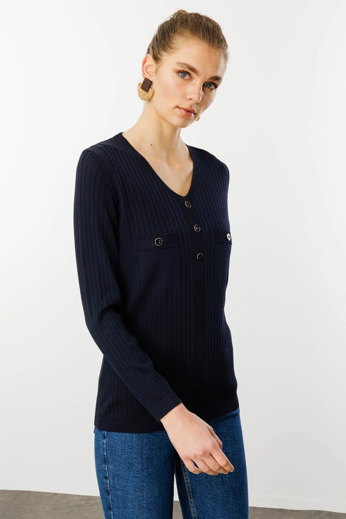 Detay: Düz renk tasarımıyla zarif bir görünüm sunan bu standart kalıp uzun kollu bluz, viskon içerikli yapısıyla gün boyu rahatlık sağlar. Modern V yaka detayı sayesinde şıklığı ön plana çıkarırken, farklı kombinlerle kolayca uyum yakalamanıza yardımcı olur. Kaliteli materyali ve zamansız tasarımıyla gardırobunuzun en kullanışlı parçalarından biri haline gelir;