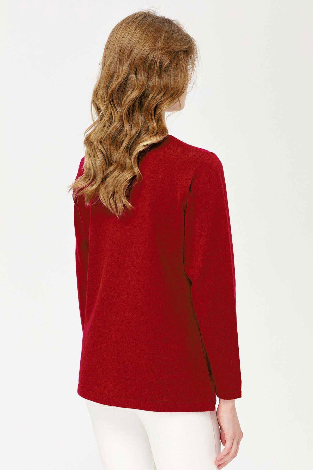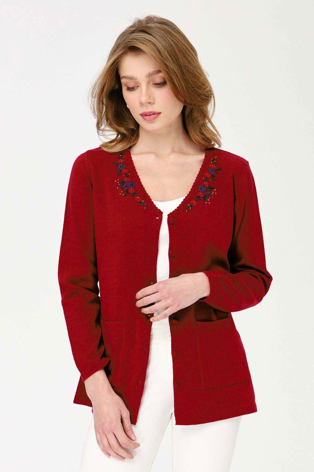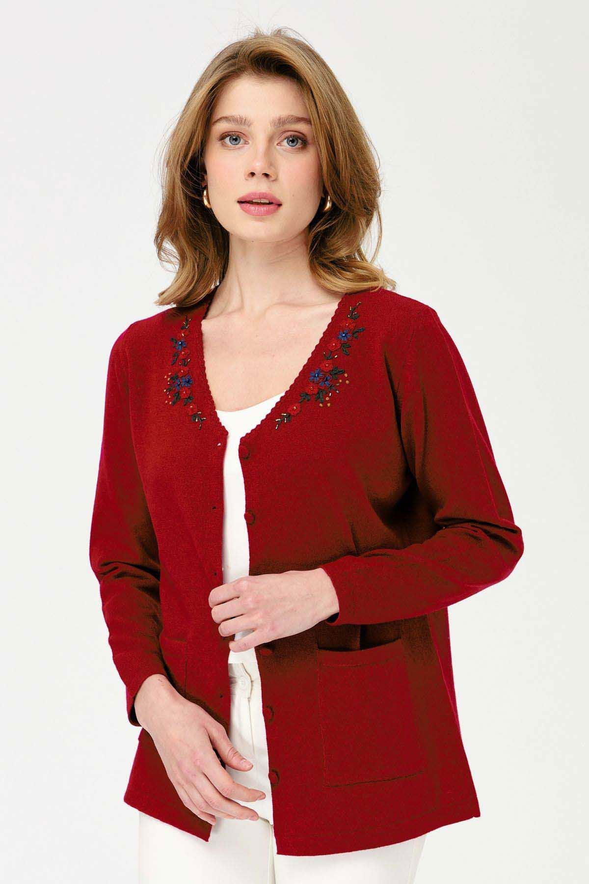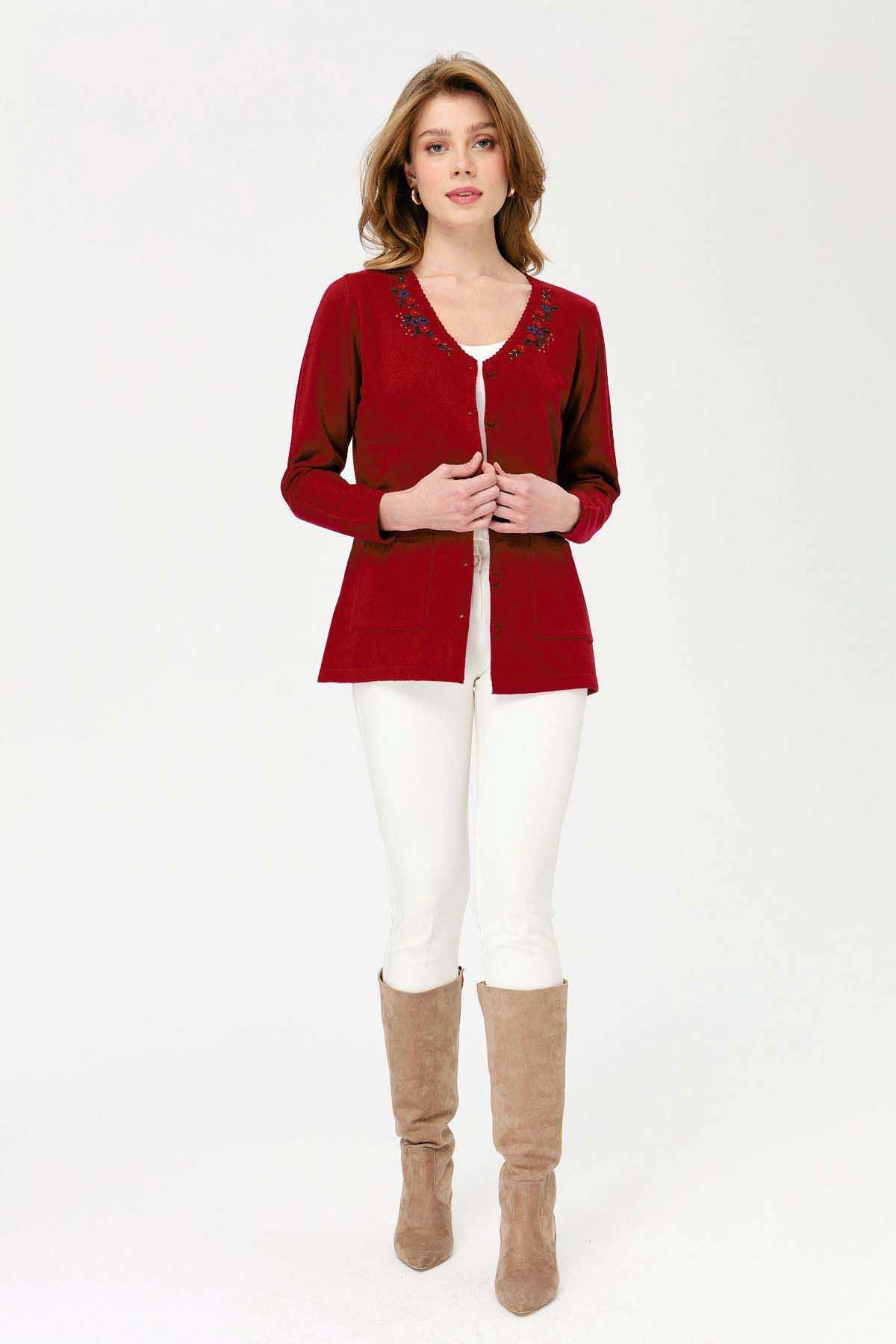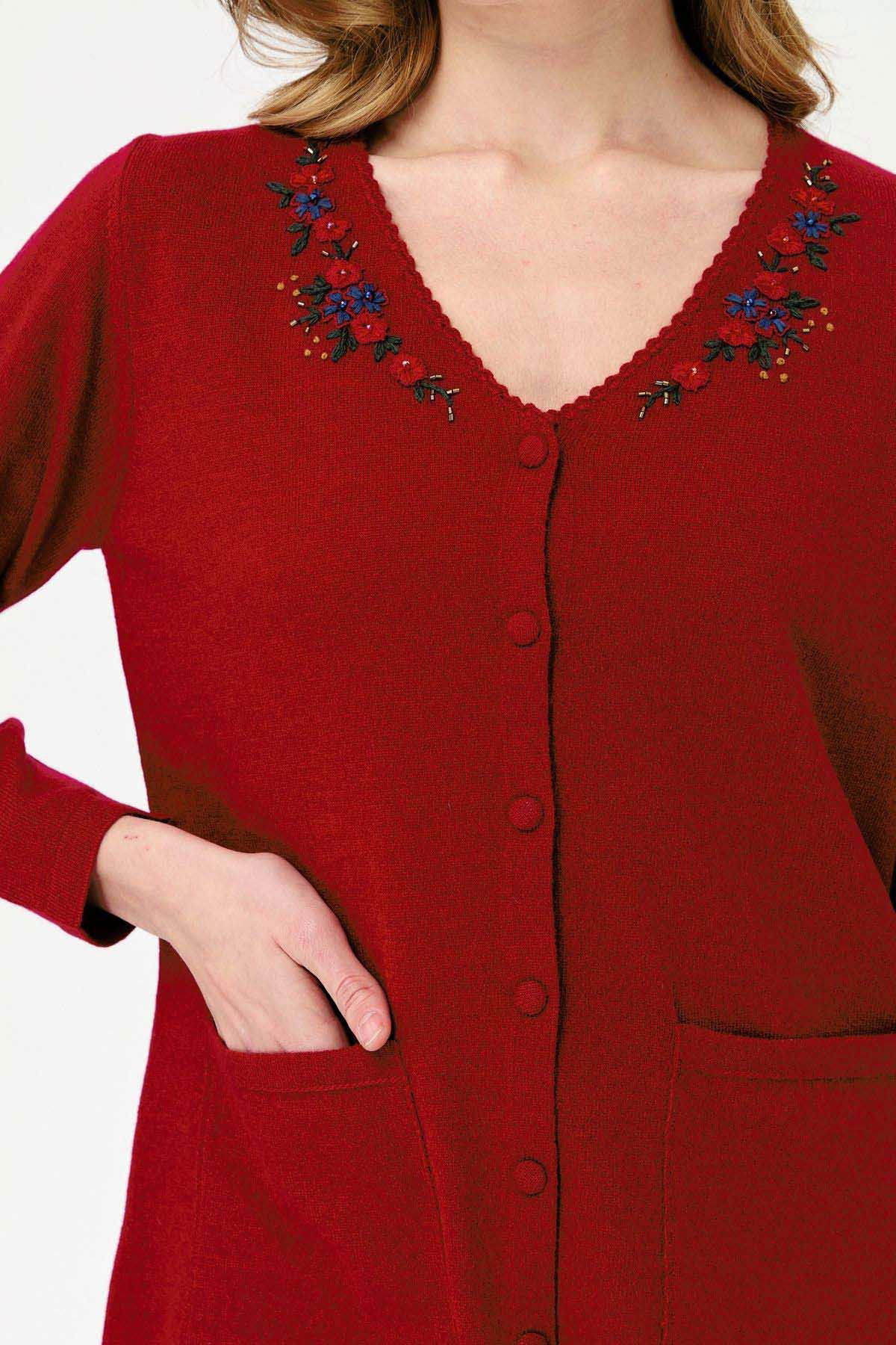 Desen Triko Kadın V Yaka Kenarı Dantel İşlemeli Yün Hırka 23004 Vişne Çürüğü