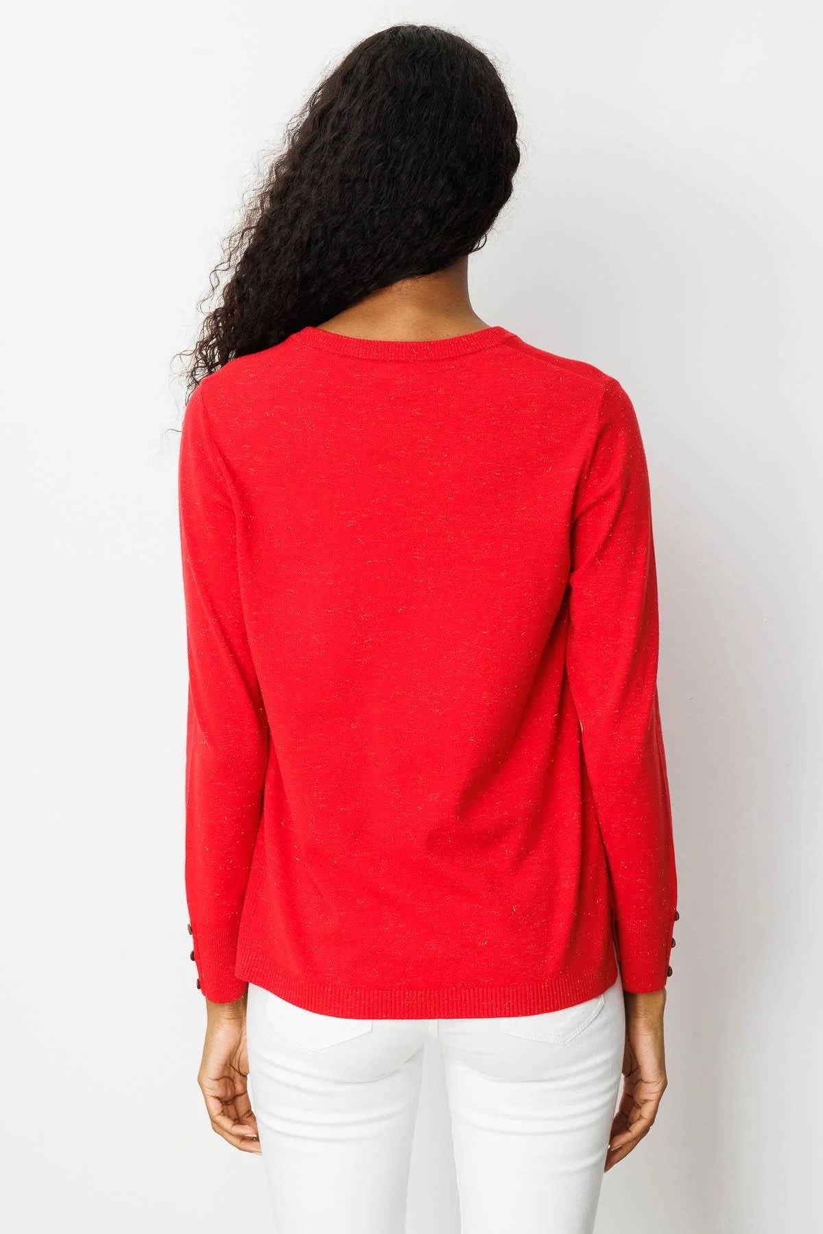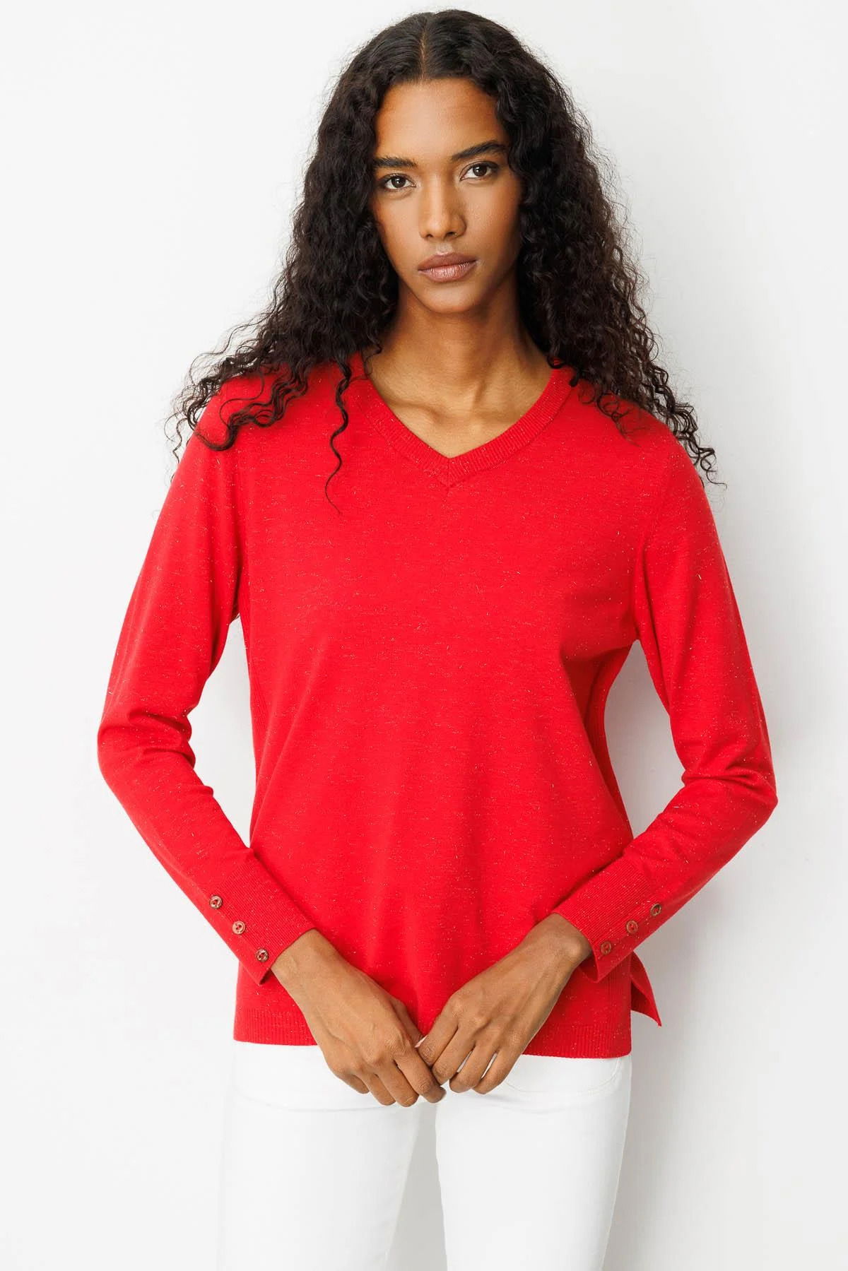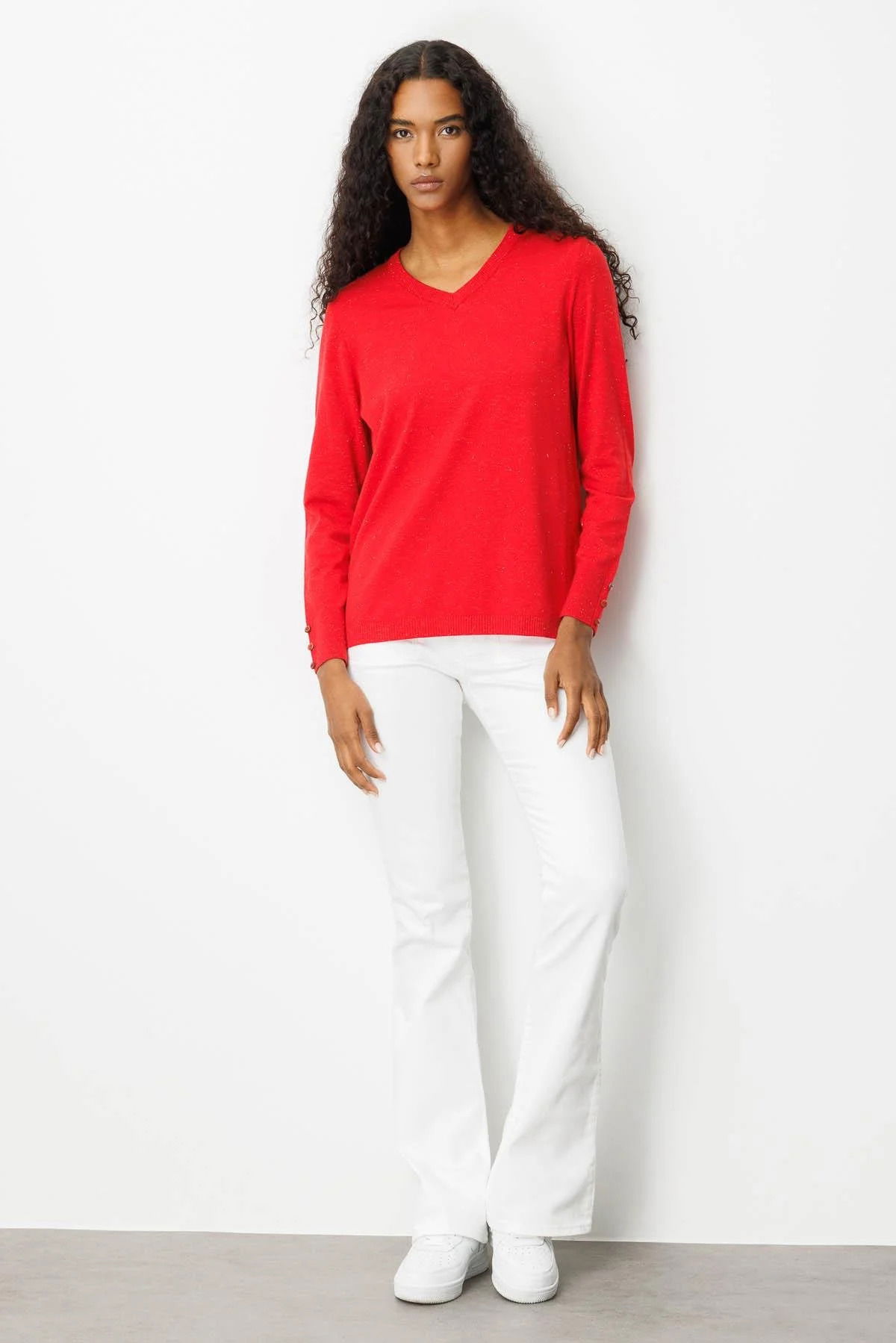 Desen Triko Kadın V Yaka Kolları Düğmeli Simli Bluz 23393 Açık Kırmızı