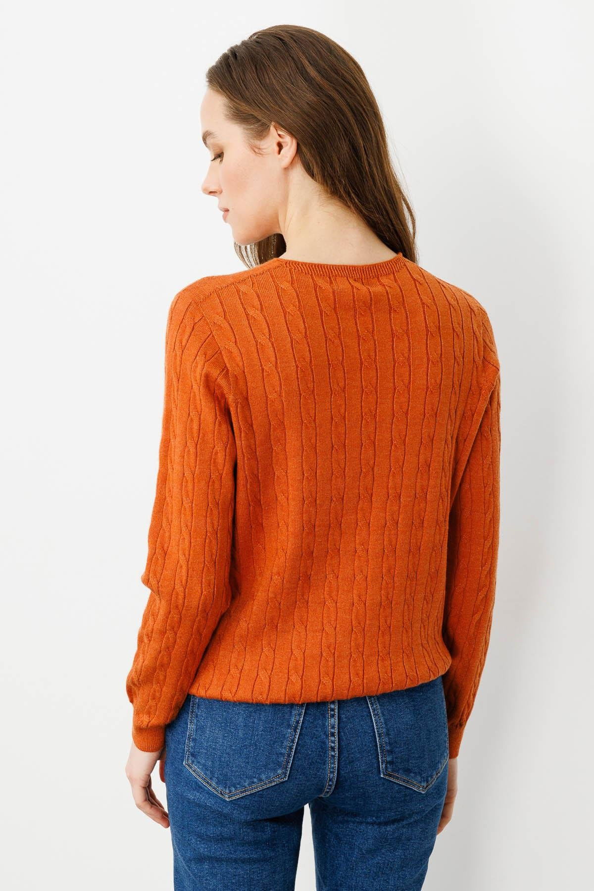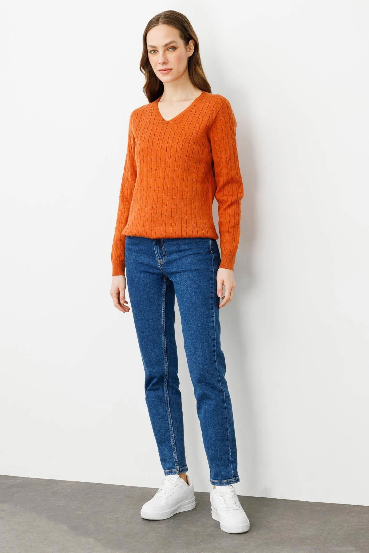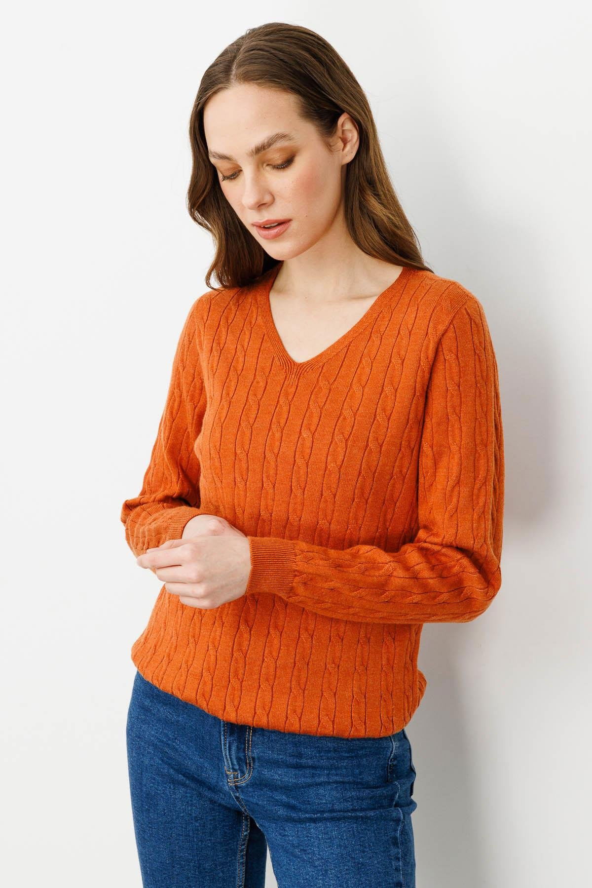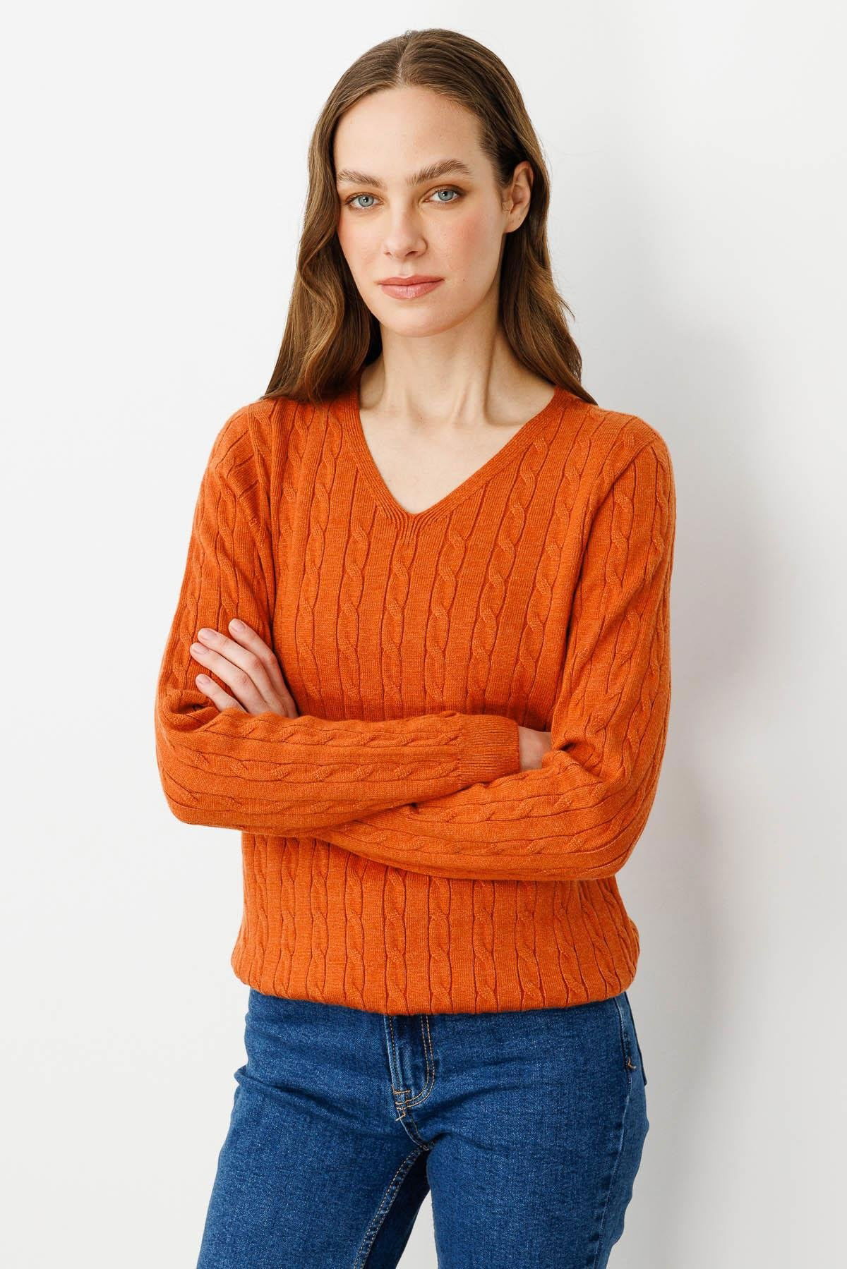 Desen Triko Kadın V Yaka Komple Saç Örgülü Kazak 24328 Turuncu