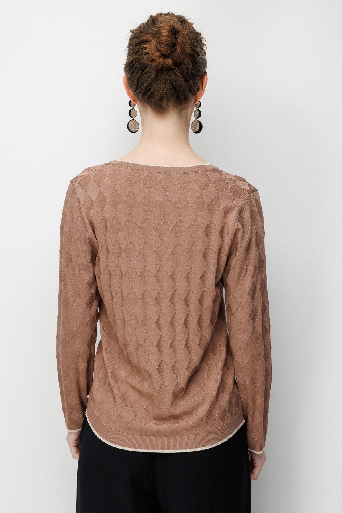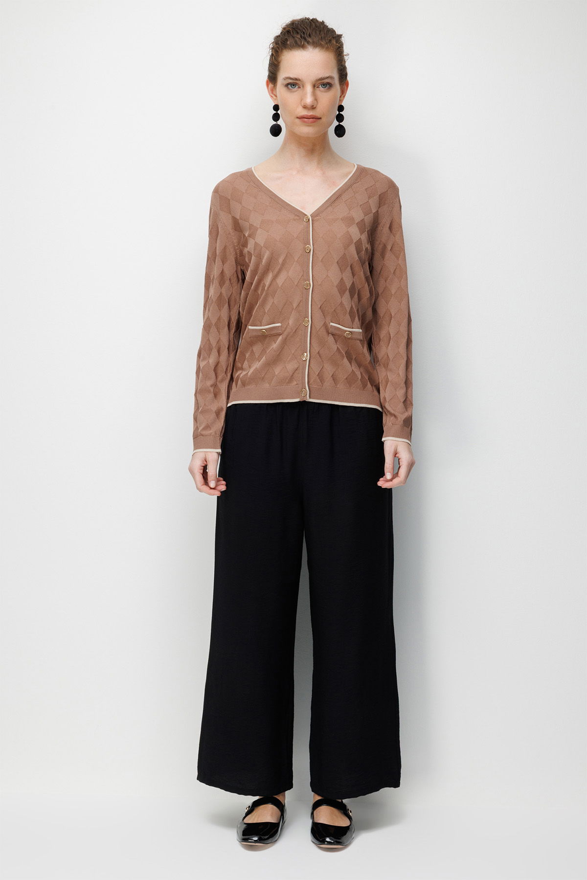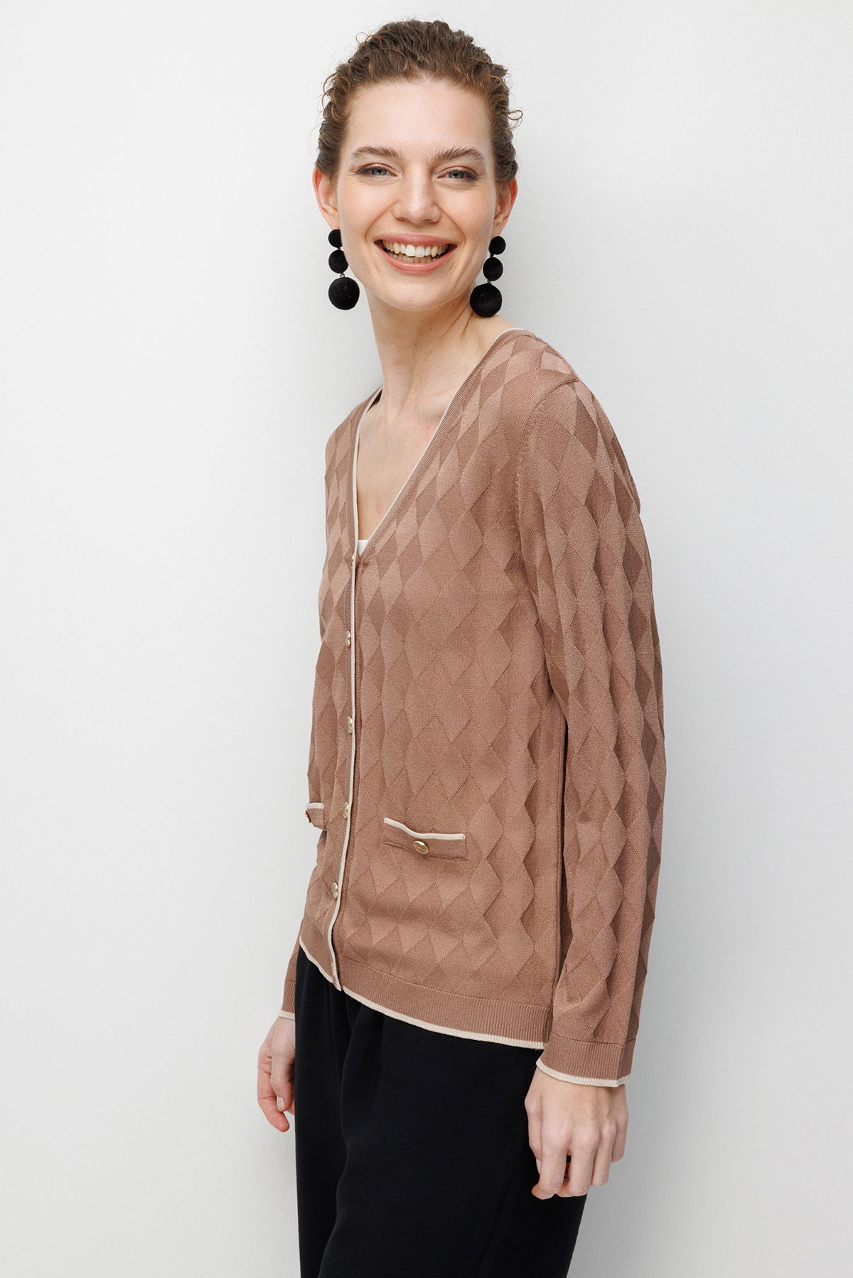 Desen Triko Kadın V Yaka Küçük Baklava Desenli İnce Triko Hırka 26360 Mocha