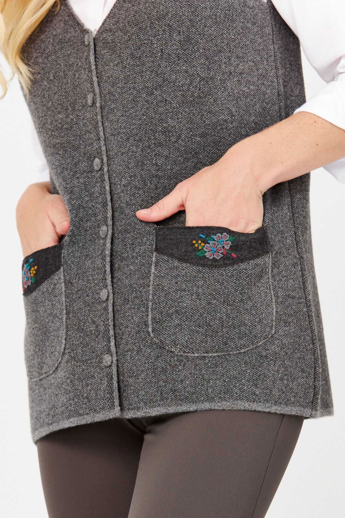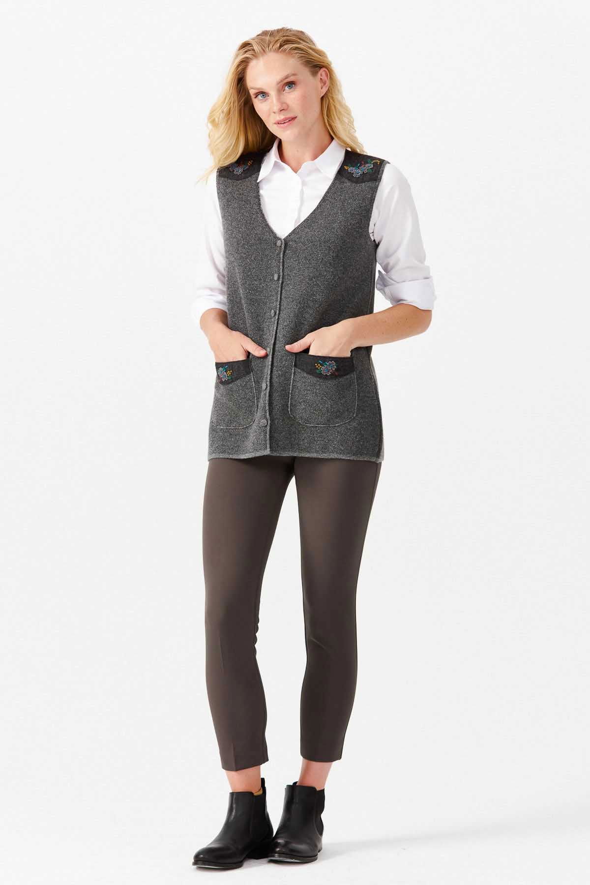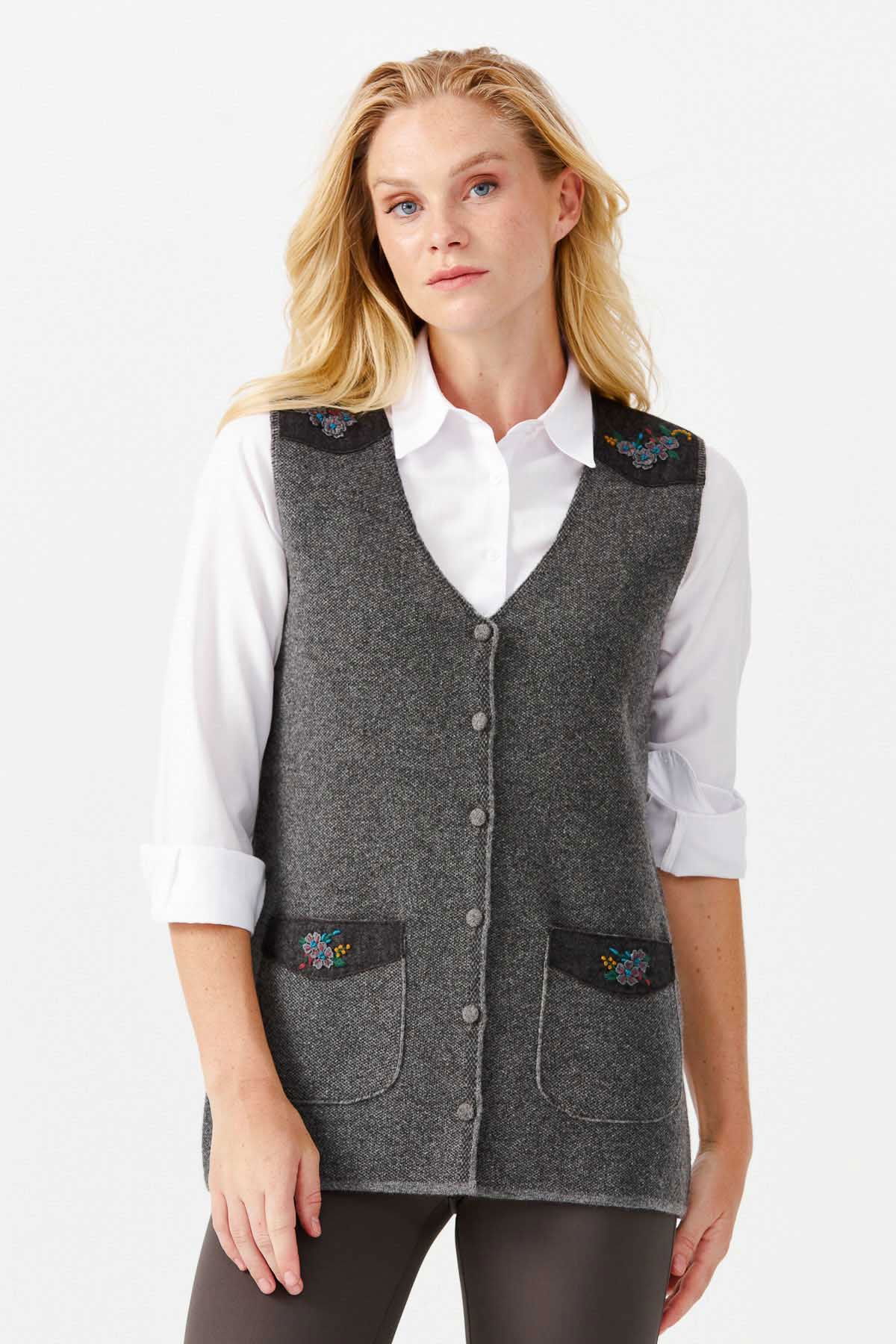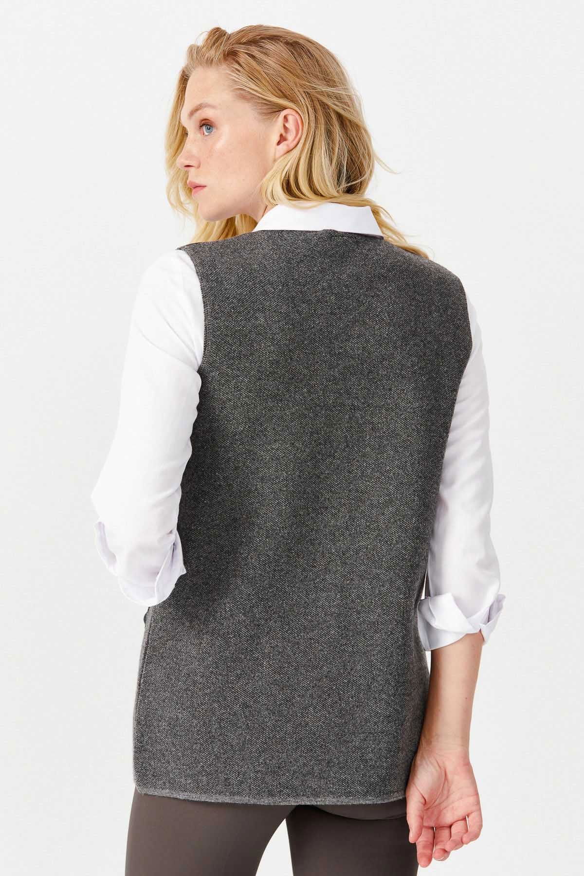 Desen Triko Kadın V Yaka Omuzu Cep Kapağı Keçeli İşlemeli Düğmeli Yelek 02422114 Füme