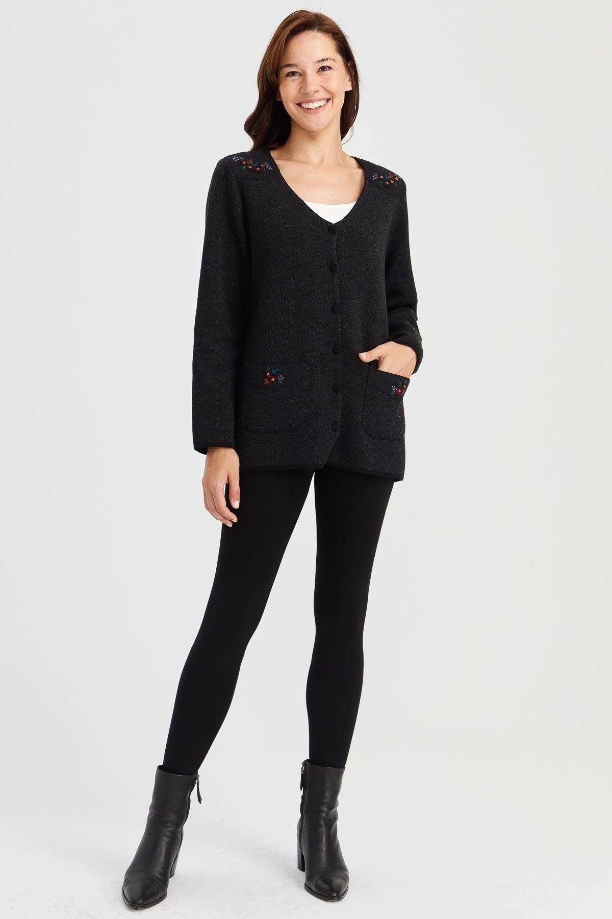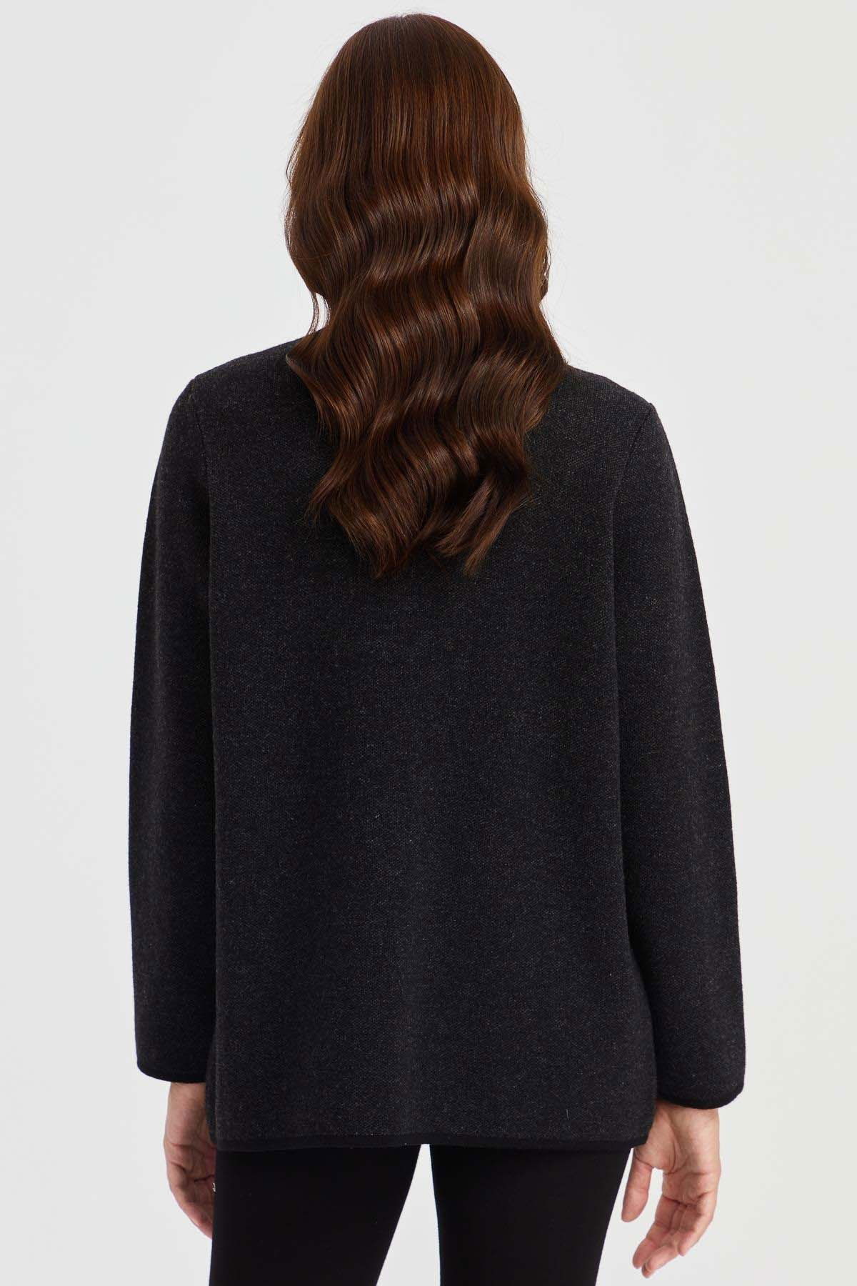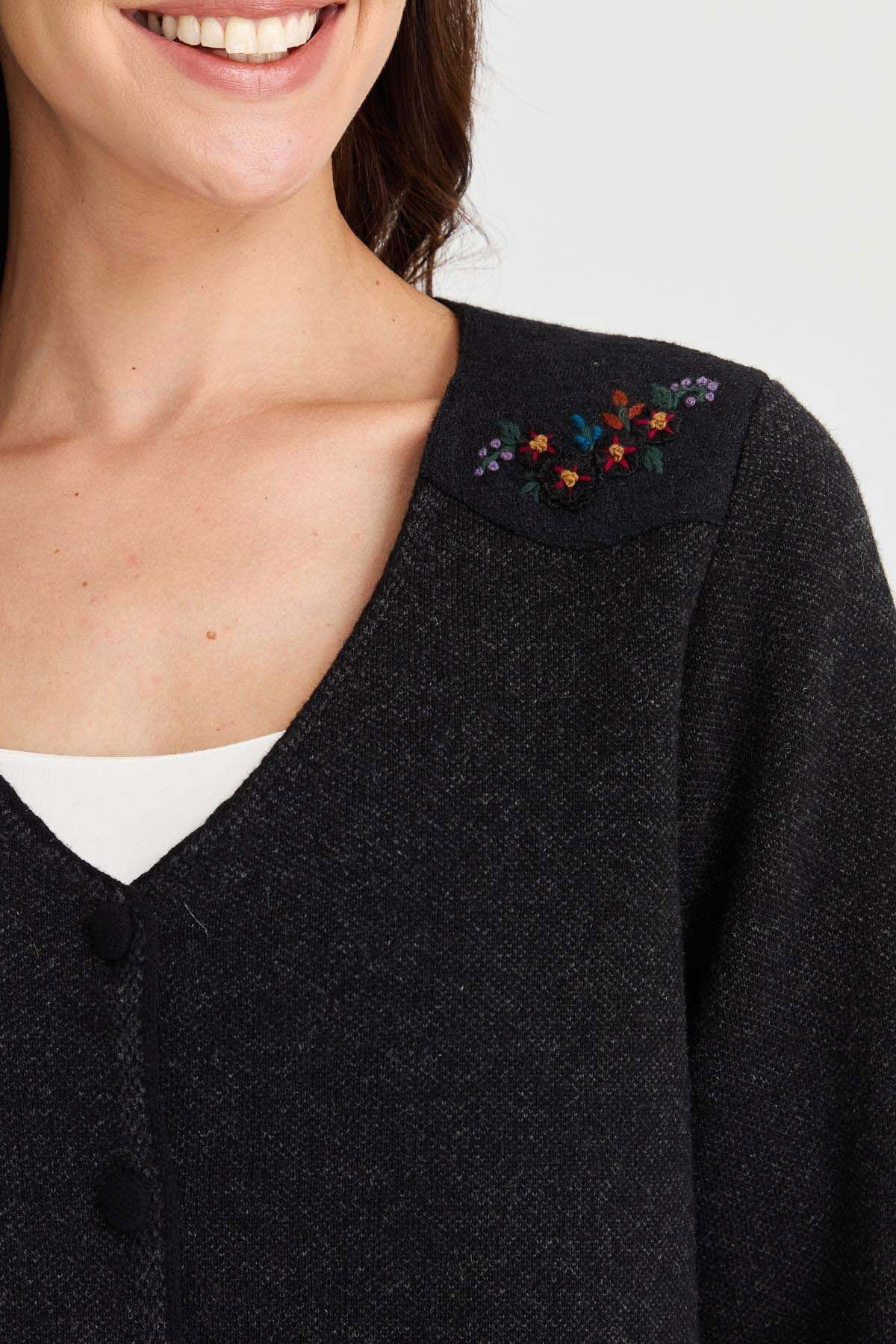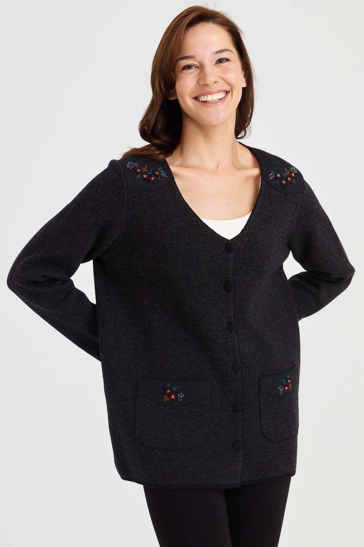 Desen Triko Kadın V Yaka Omzu ve Cebi Keçe İşlemeli Yün Ceket 23009 Siyah