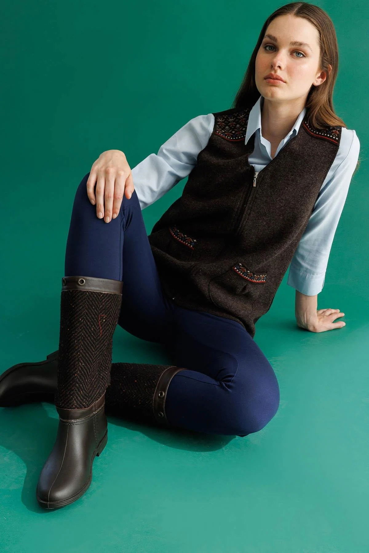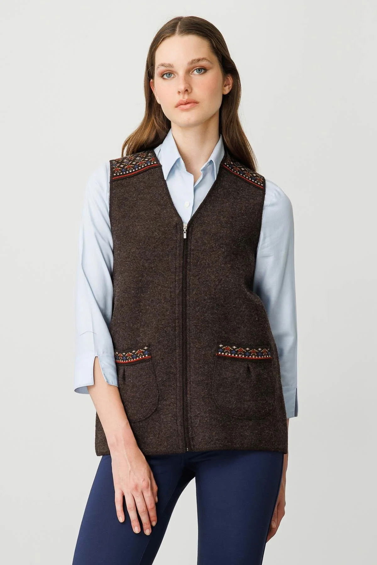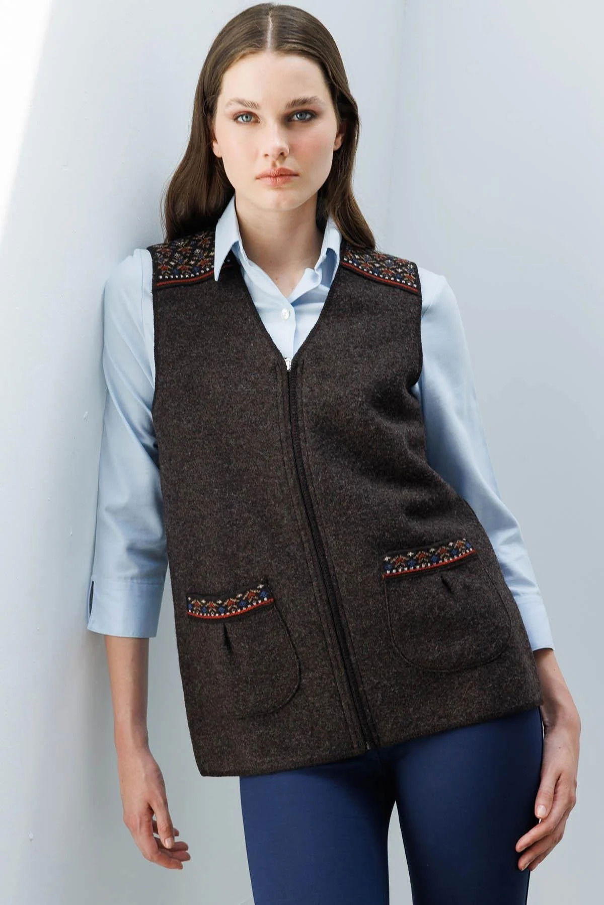 Desen Triko Kadın V Yaka Önü Keçe Fermuarlı Kısa Yün Yelek 25017 Koyu Kahve