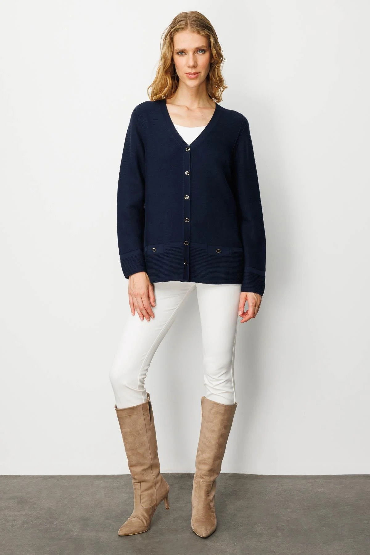Desen Triko Kadın V Yaka Sahte Cepli Düğmeli Hırka 25244 Koyu Lacivert