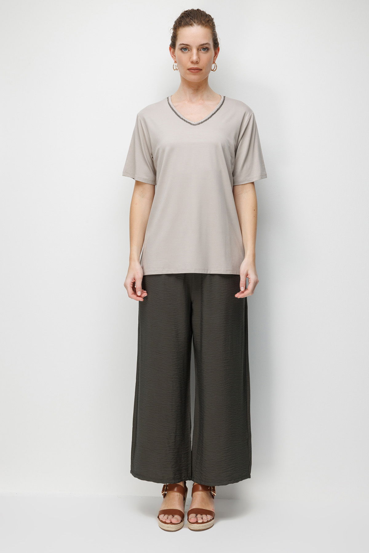 Desen Triko Kadın V Yaka Yaka Kenarı Zincirli Penye T-Shirt 26707 Bej