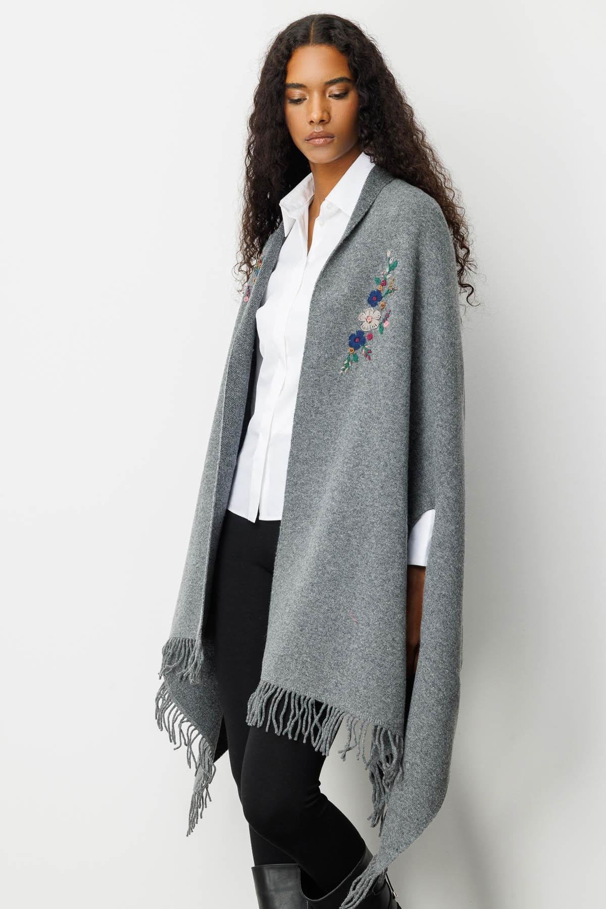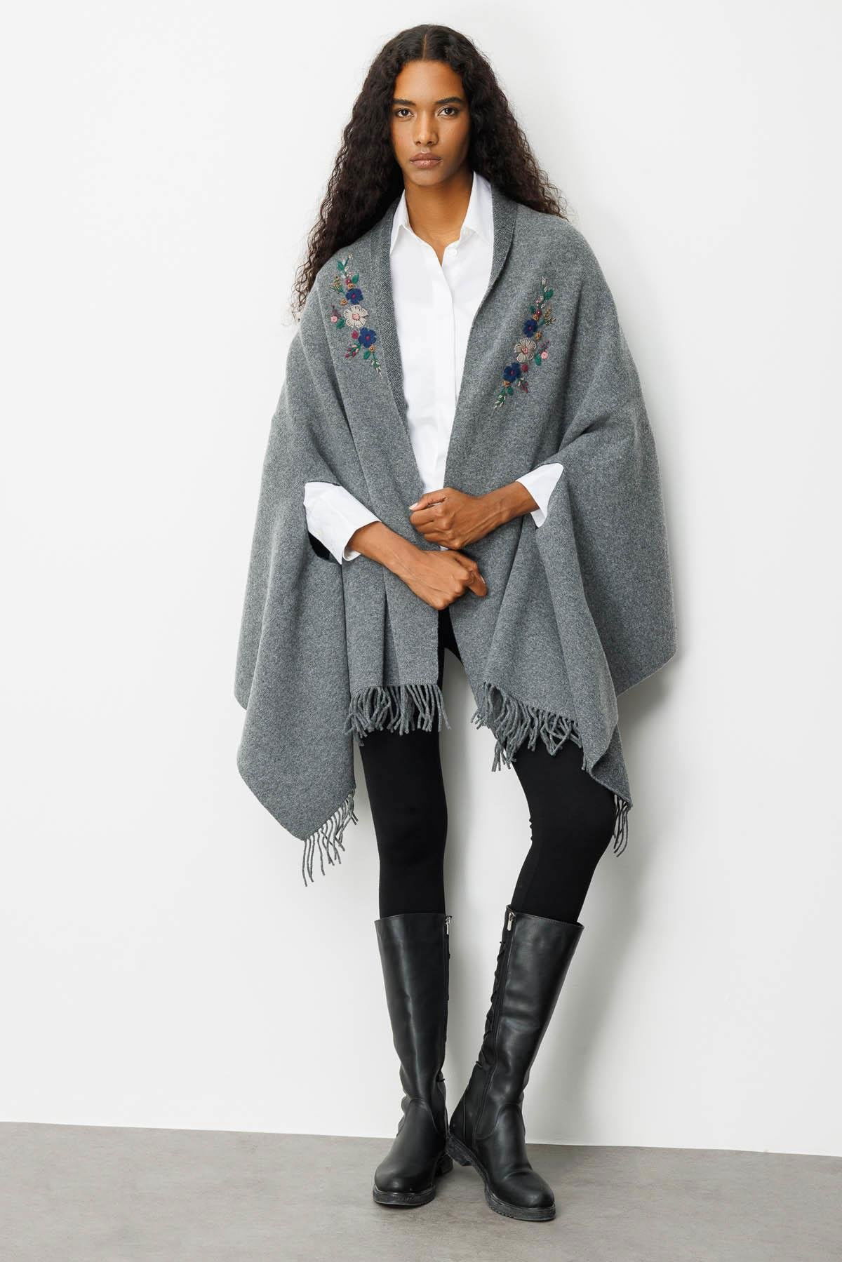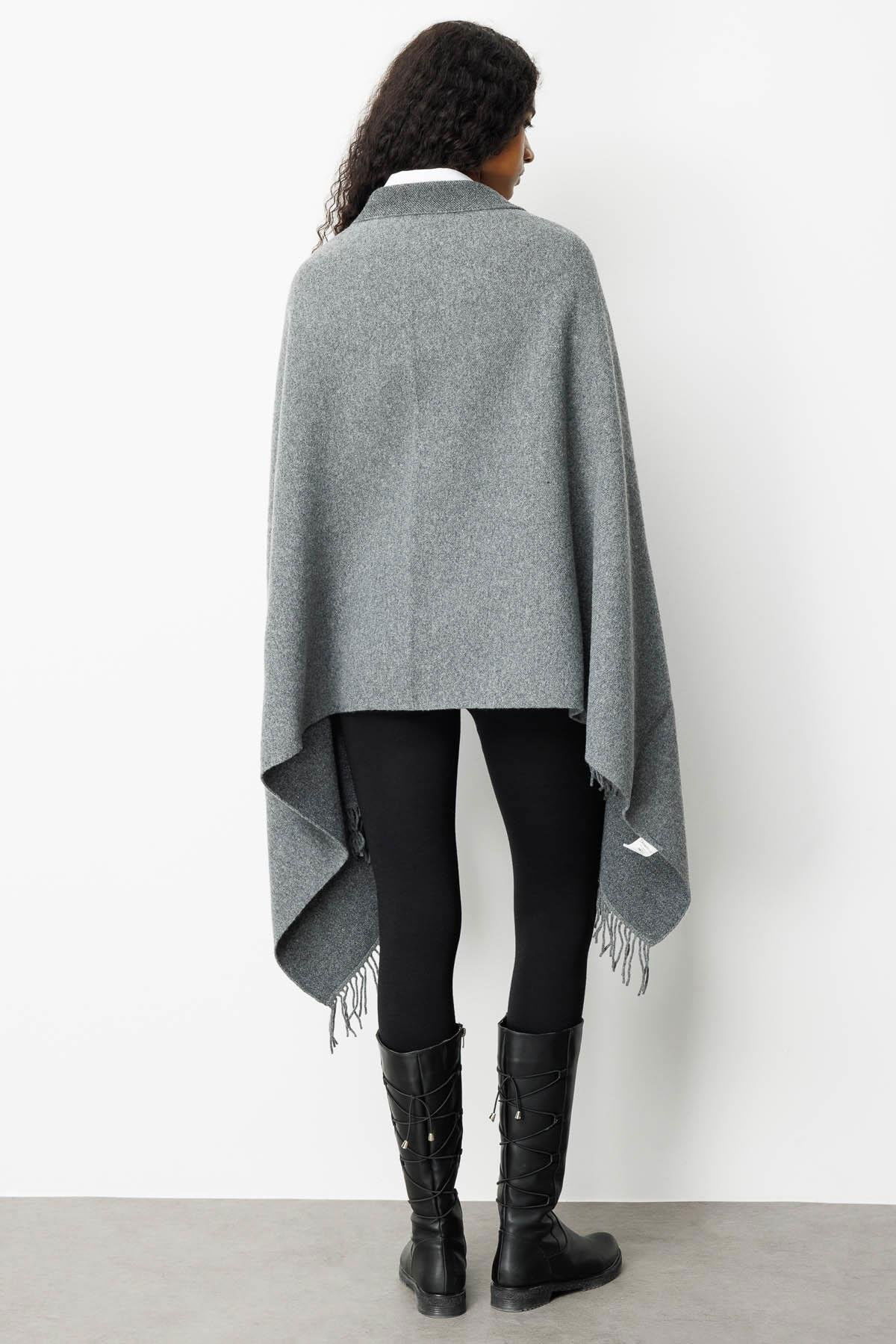 Desen Triko Kadın Yakası İşlemeli Koldan Geçmeli Büyük Yün Panço 25060 Füme