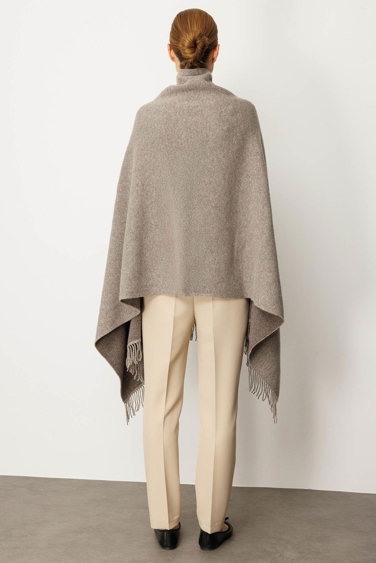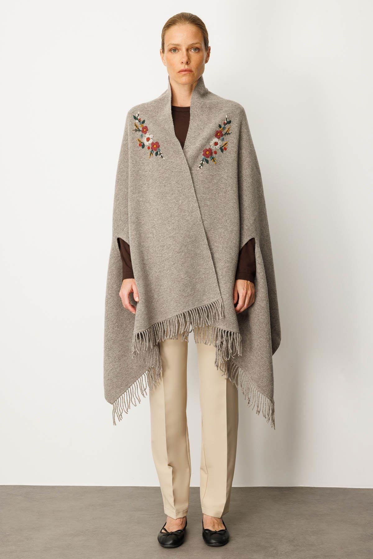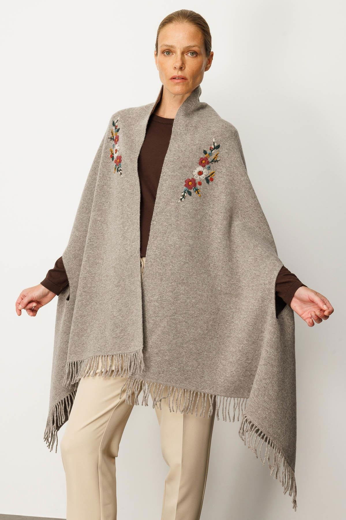 Desen Triko Kadın Yakası İşlemeli Koldan Geçmeli Büyük Yün Panço 25060 Vizon