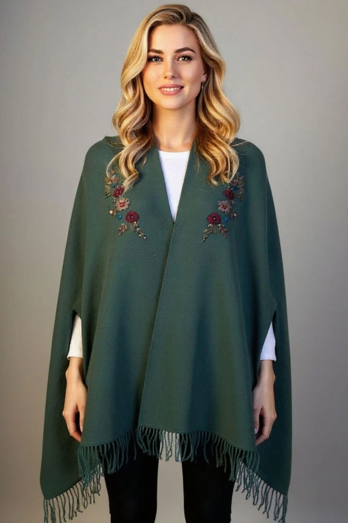 Desen Triko Kadın Yakası İşlemeli Koldan Geçmeli Büyük Yün Panço 25060 Yeşil