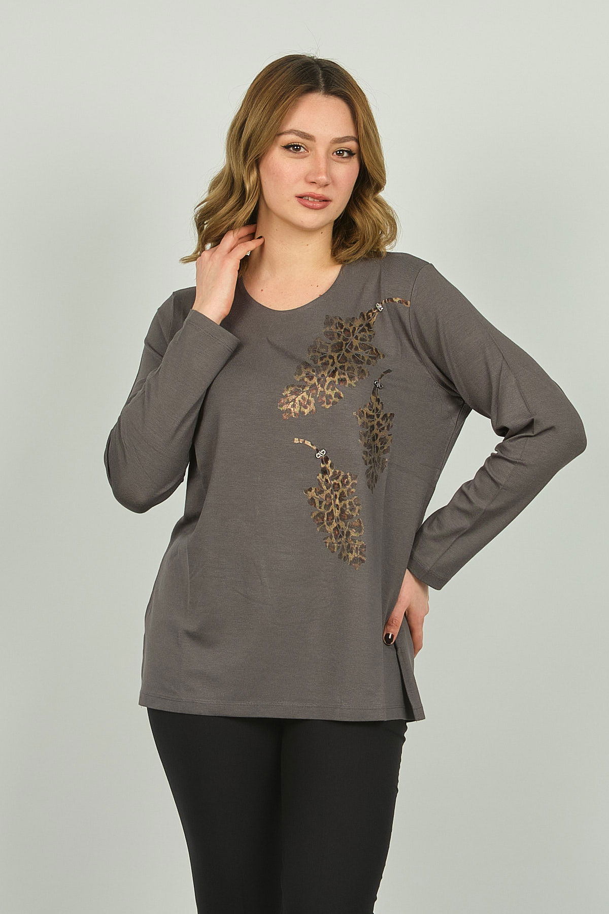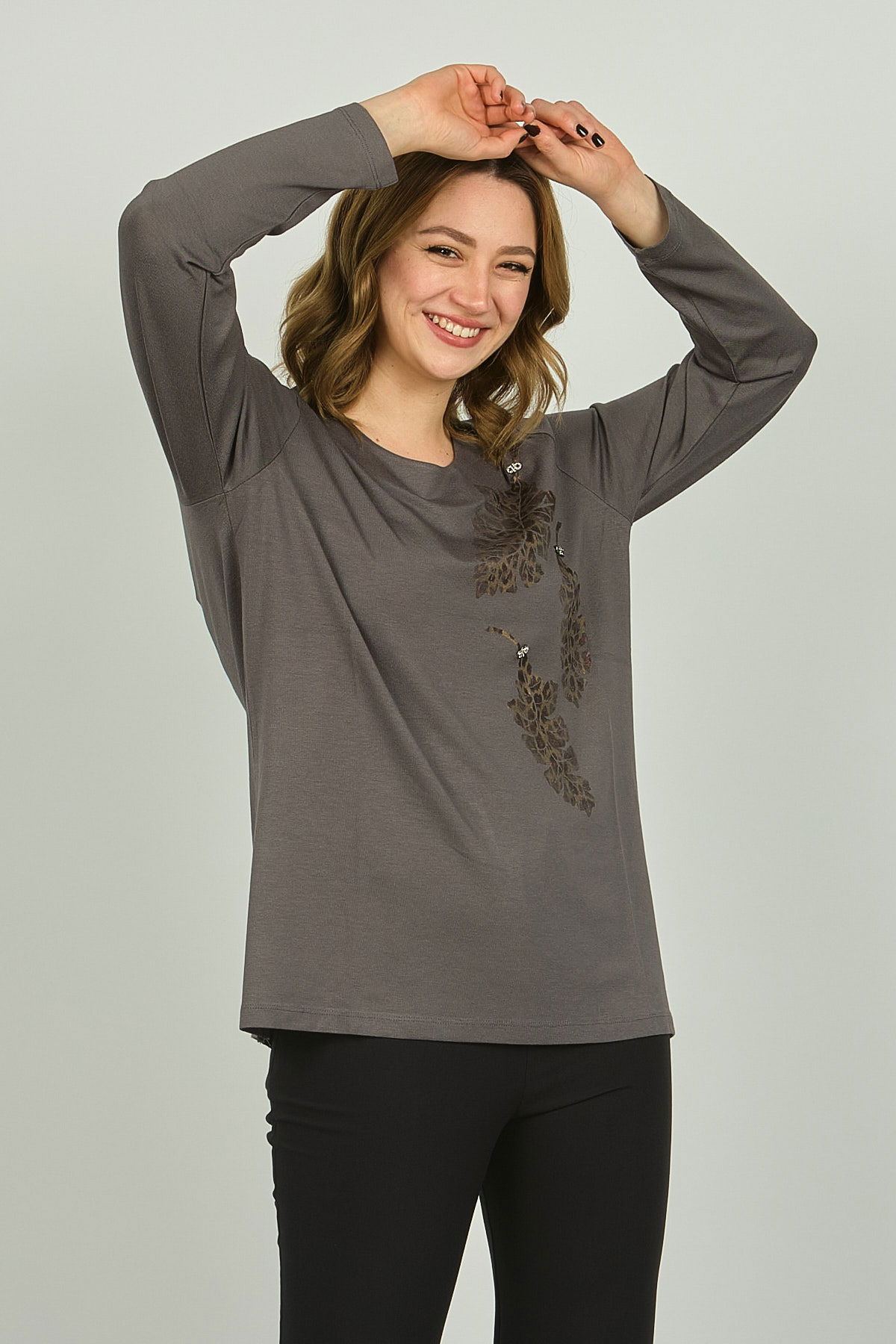 Detay Triko Kadın Bisiklet Yaka Desenli Uzun Kol Bluz 4524 Gri