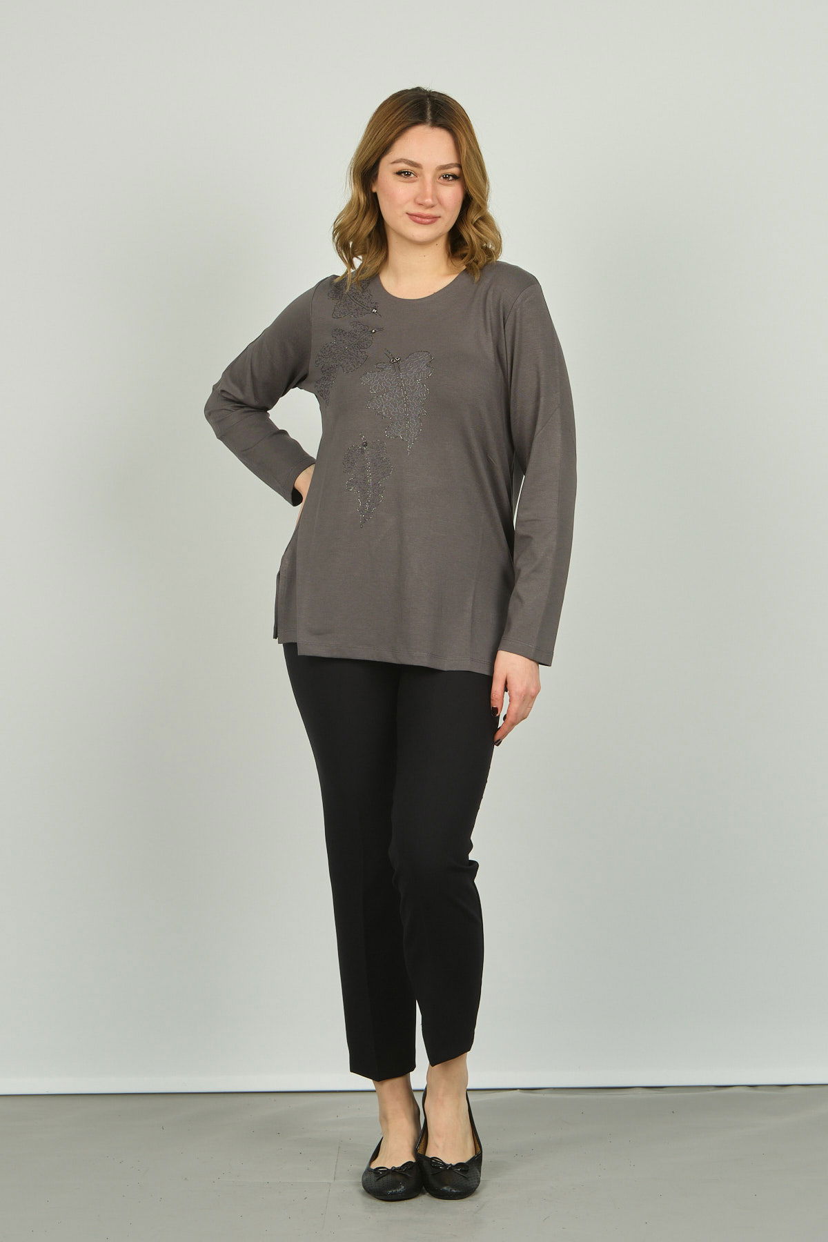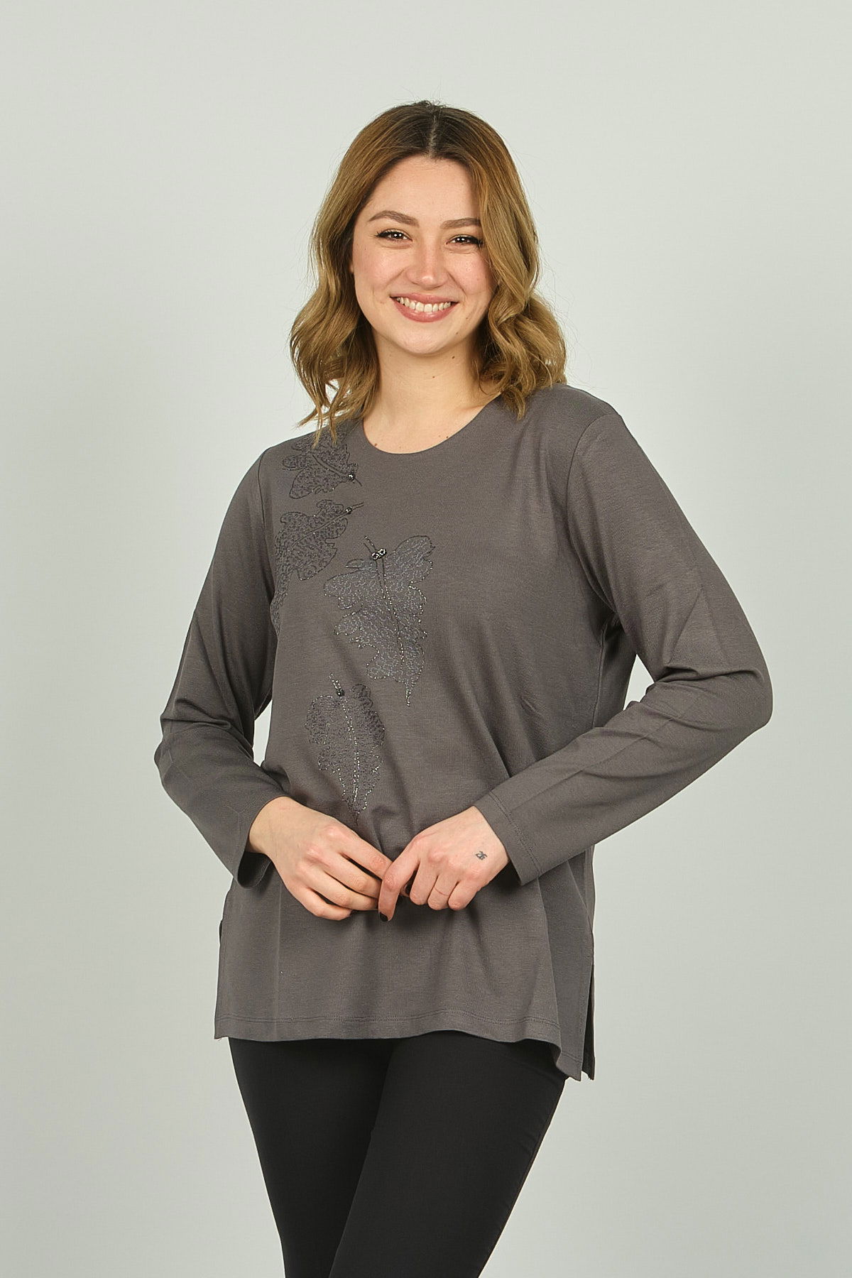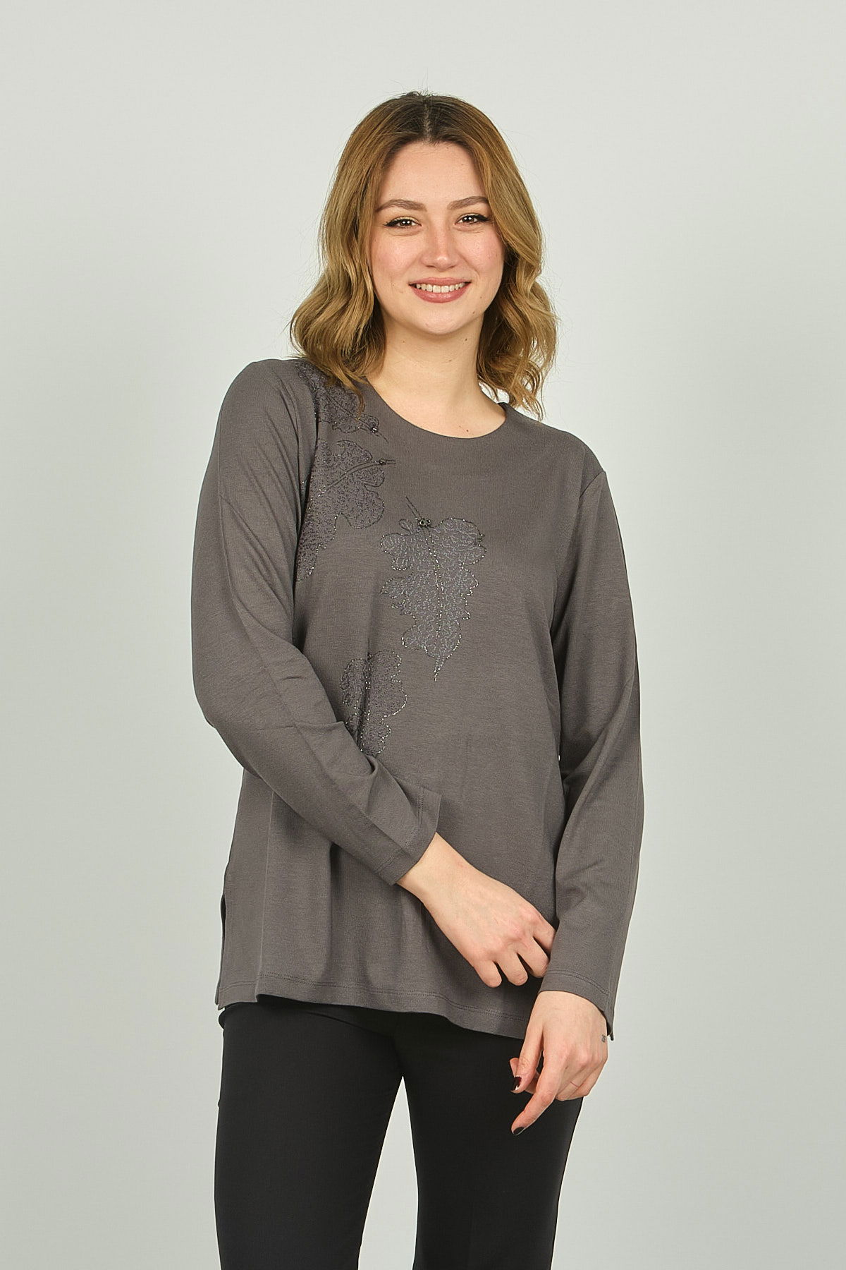 Detay Triko Kadın Bisiklet Yaka Desenli Uzun Kol Bluz 4595 Gri