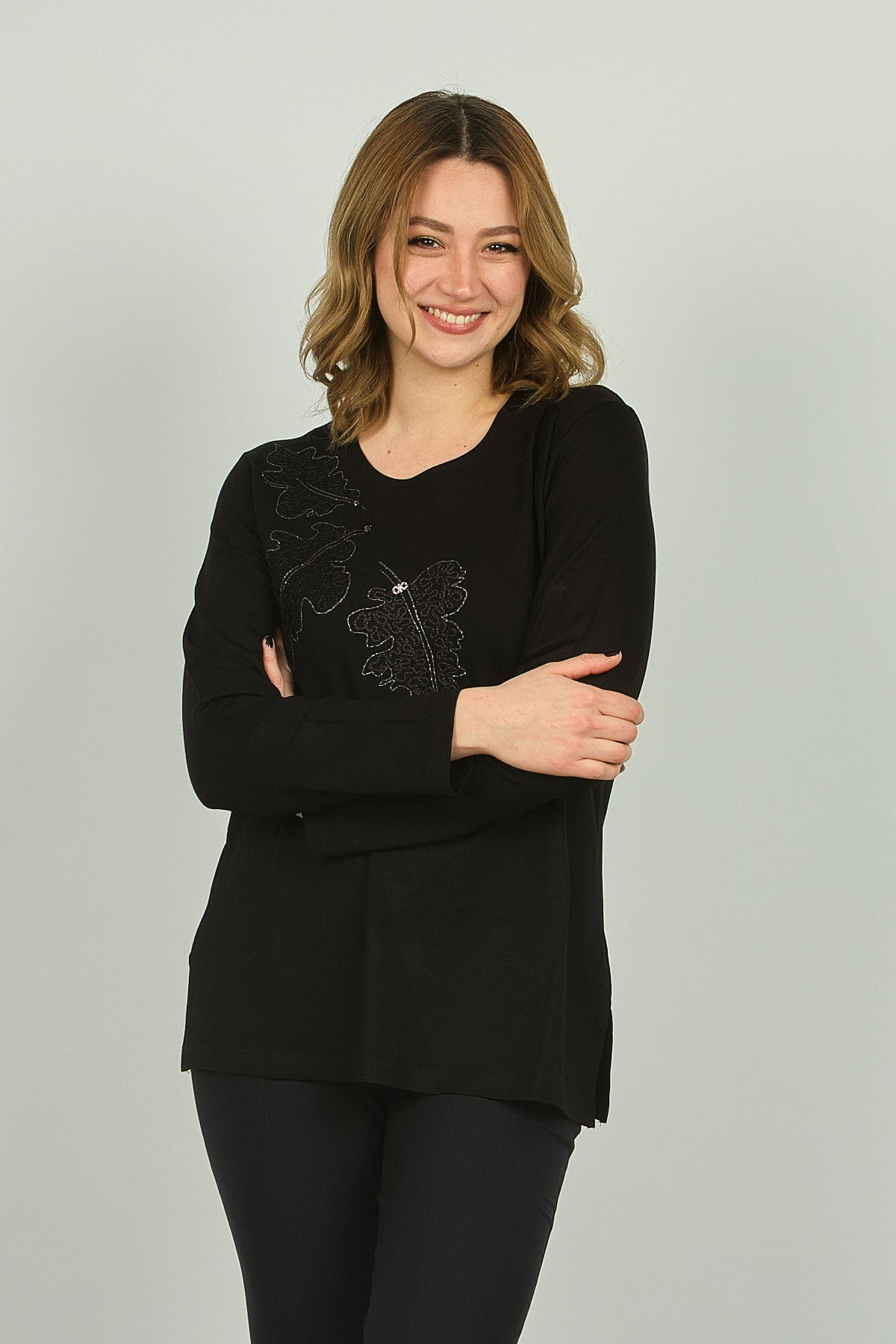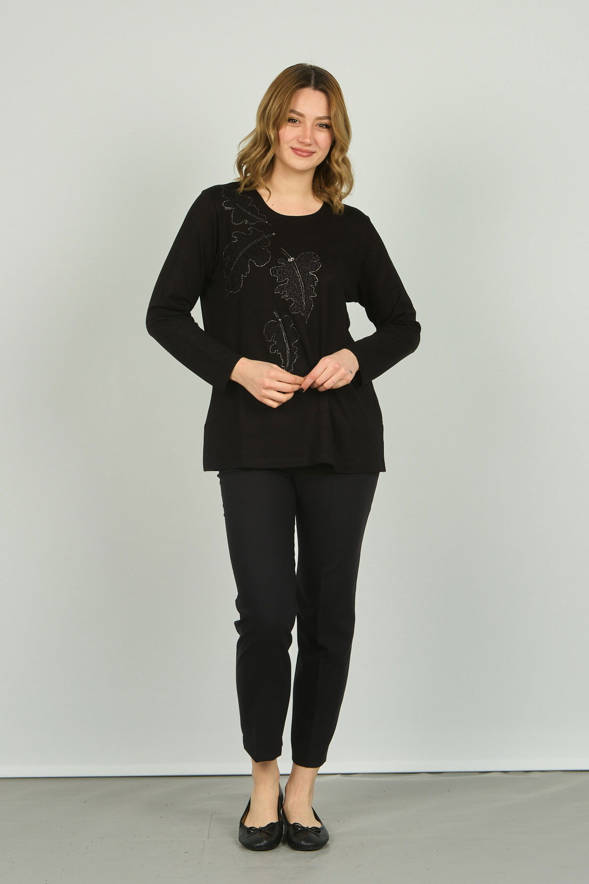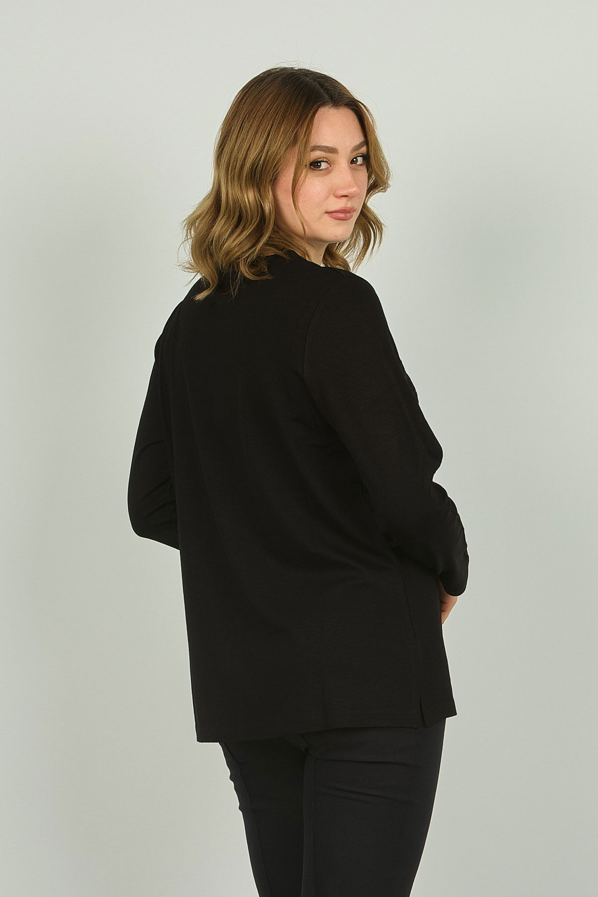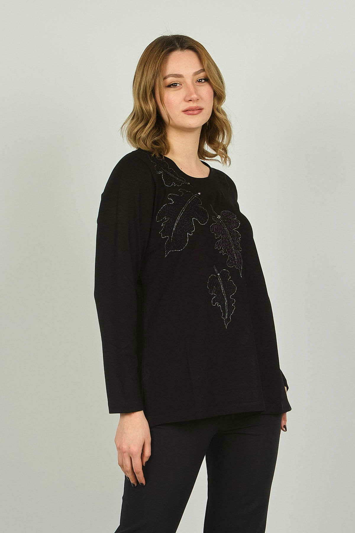 Detay Triko Kadın Bisiklet Yaka Desenli Uzun Kol Bluz 4595 Siyah