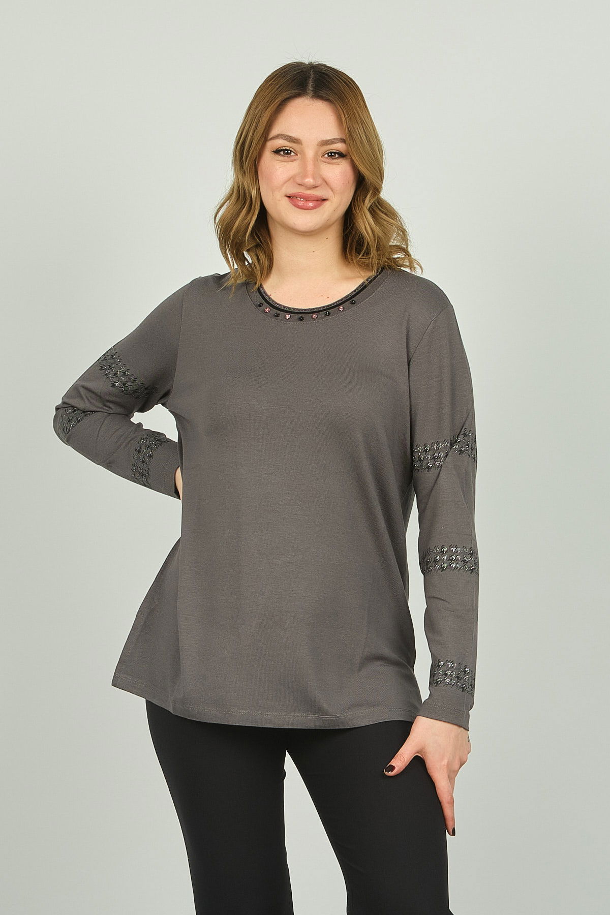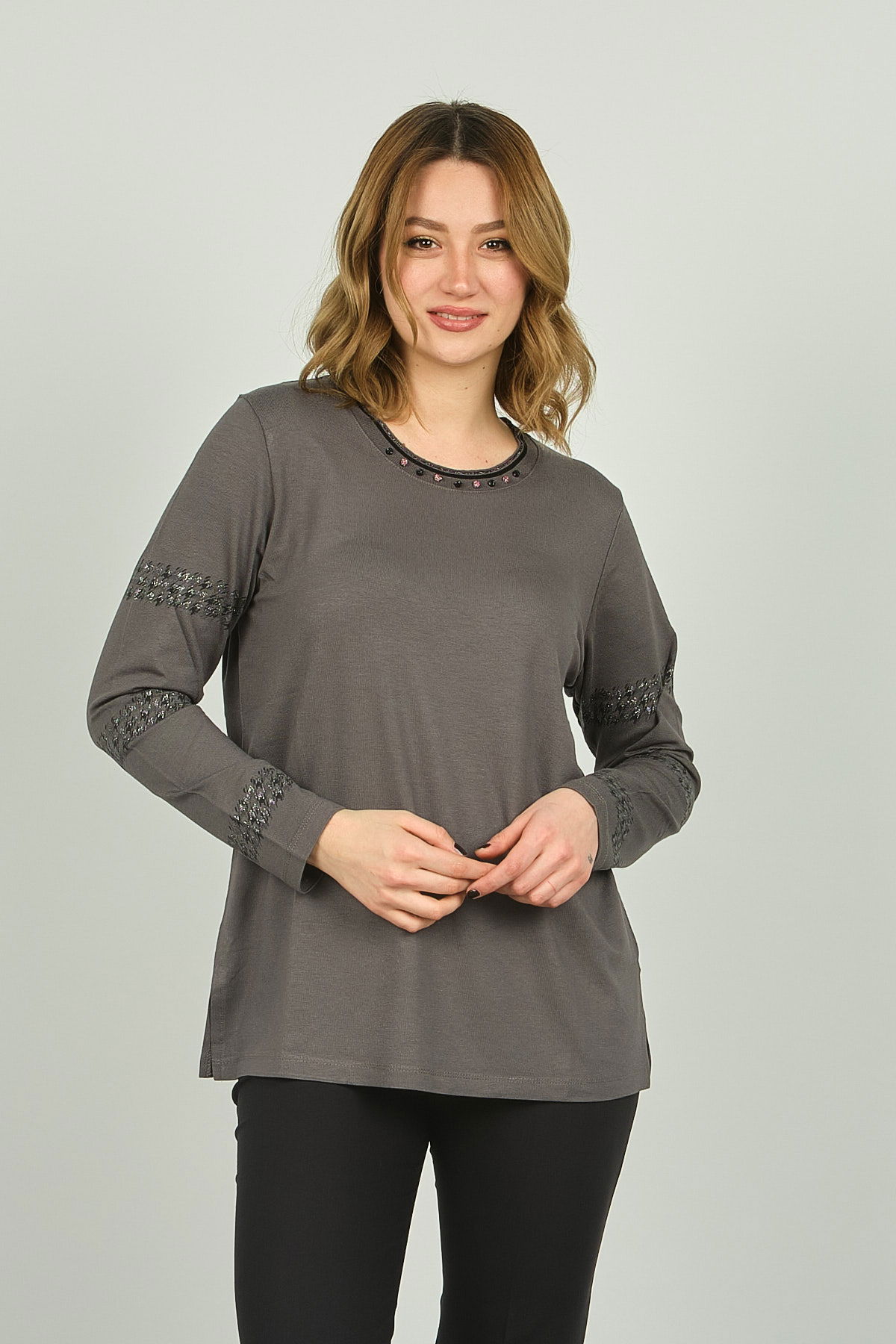 Detay Triko Kadın Bisiklet Yaka Kolları ve Yakası İşlemeli Uzun Kol Bluz 4539 Gri