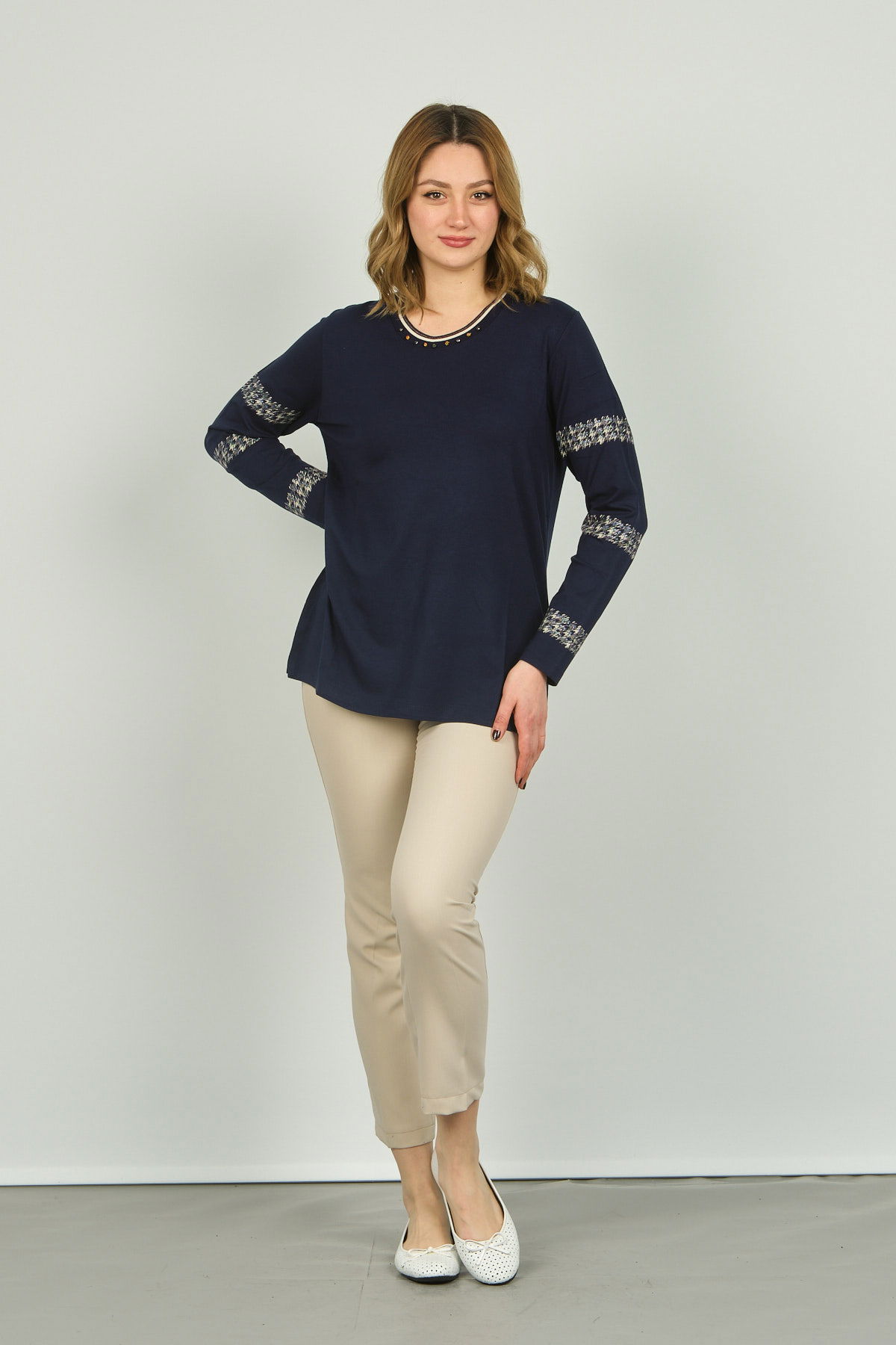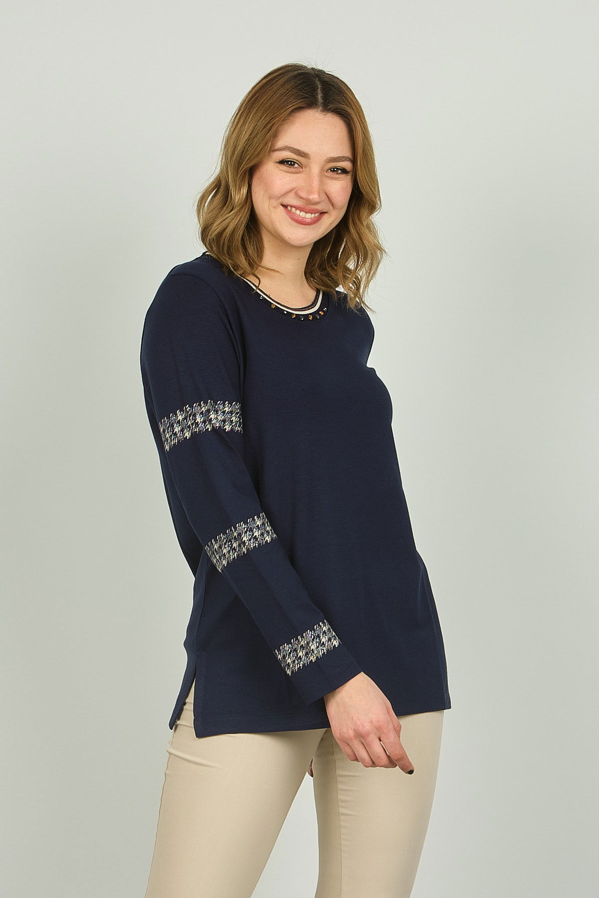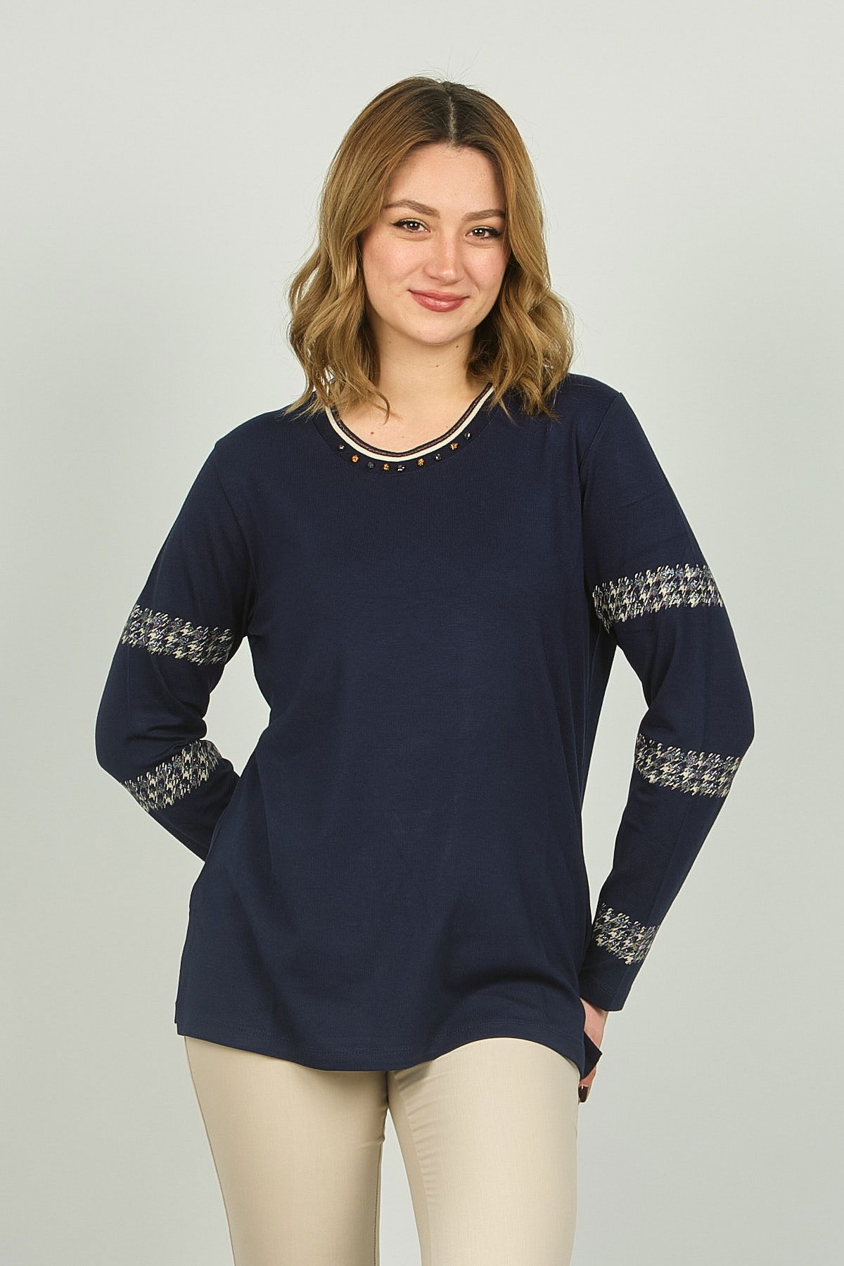 Detay: Bisiklet yaka, taş detaylı, uzun kol bluz;