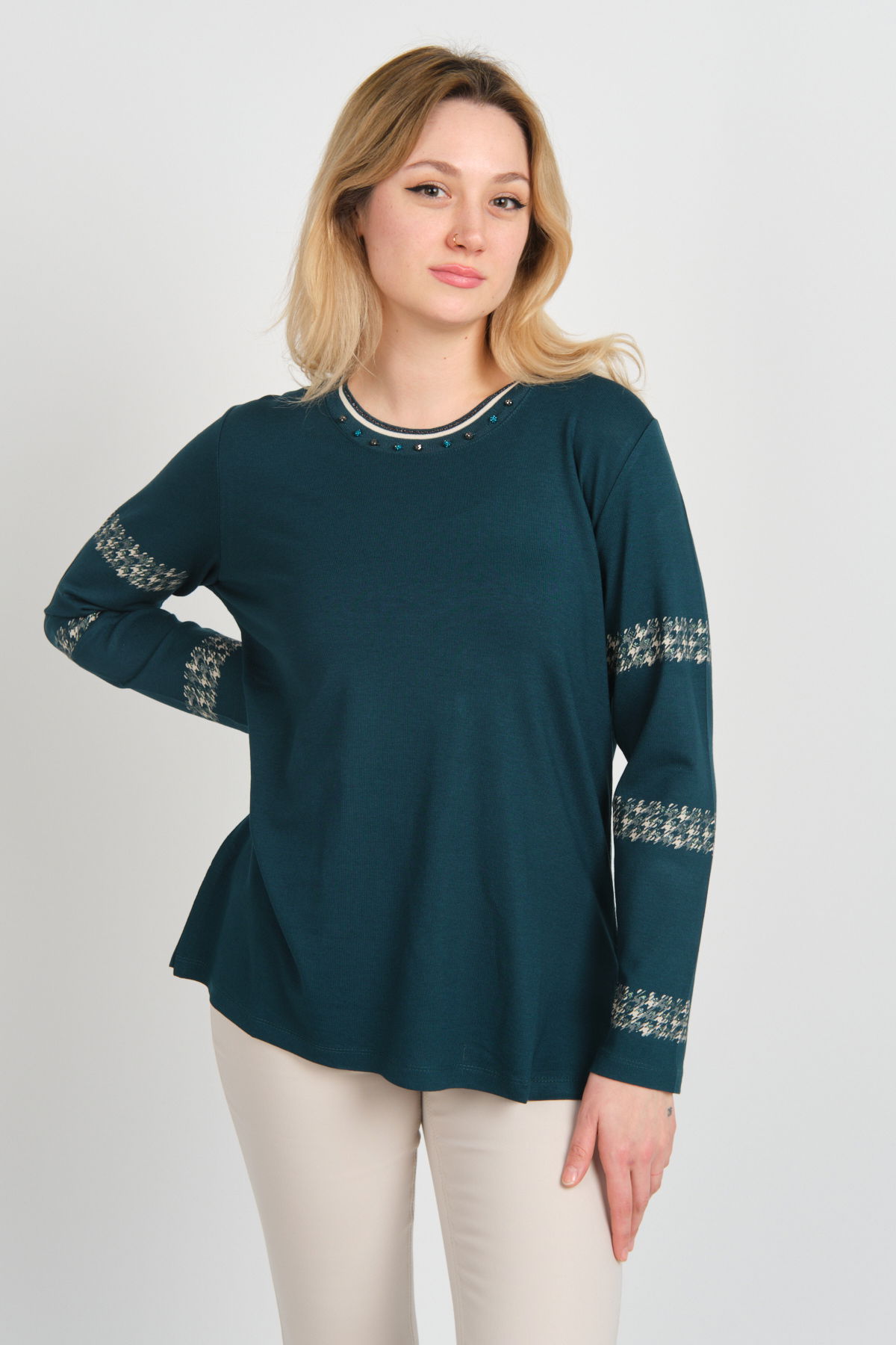Detay Triko Kadın Bisiklet Yaka Kolları ve Yakası İşlemeli Uzun Kol Bluz 4539 Zümrüt
