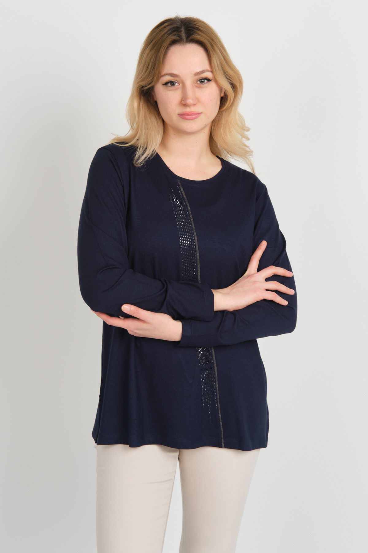 Detay: Bisiklet yaka, taş işlemeli, uzun kol bluz;