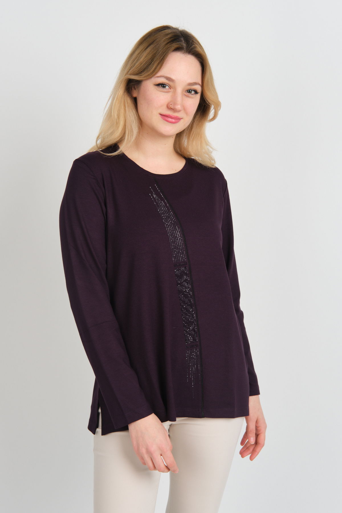 Detay Triko Kadın Bisiklet Yaka Taş İşlemeli Uzun Kol Bluz 4565 Mor