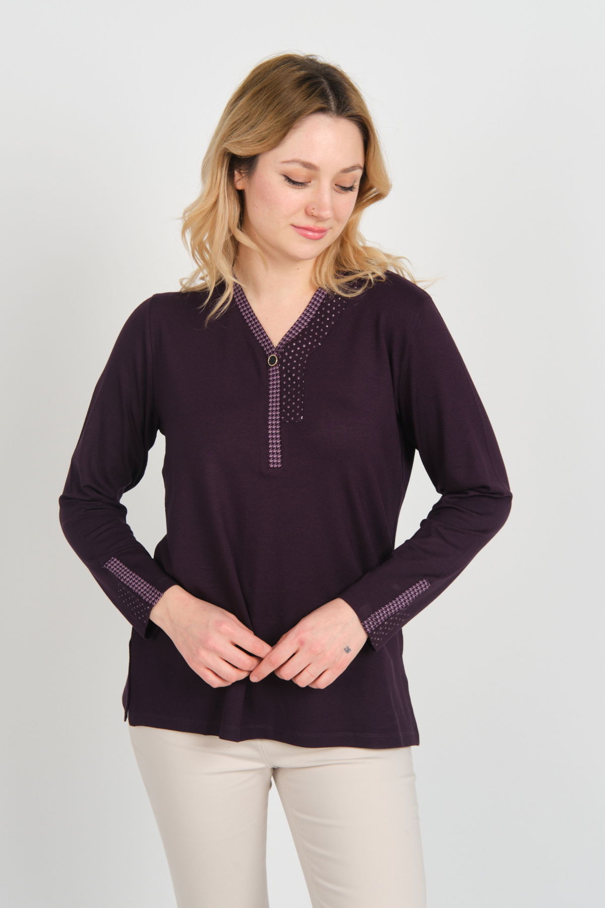 Detay Triko Kadın Kolları ve Yakası İşlemeli Uzun Kol Bluz 0507 Mor