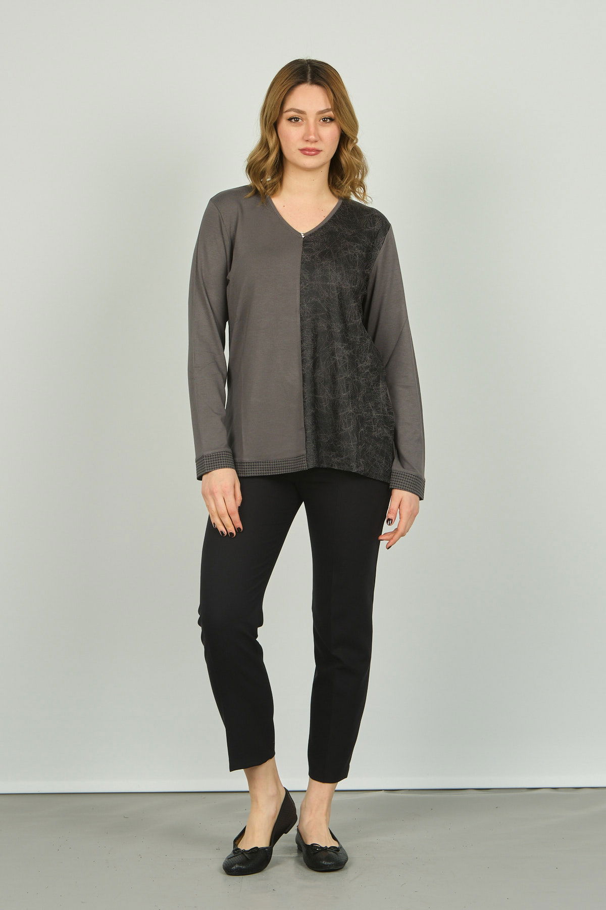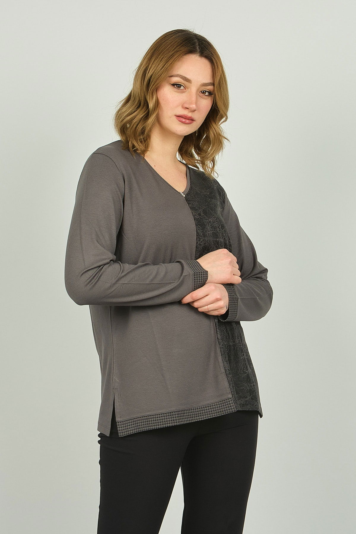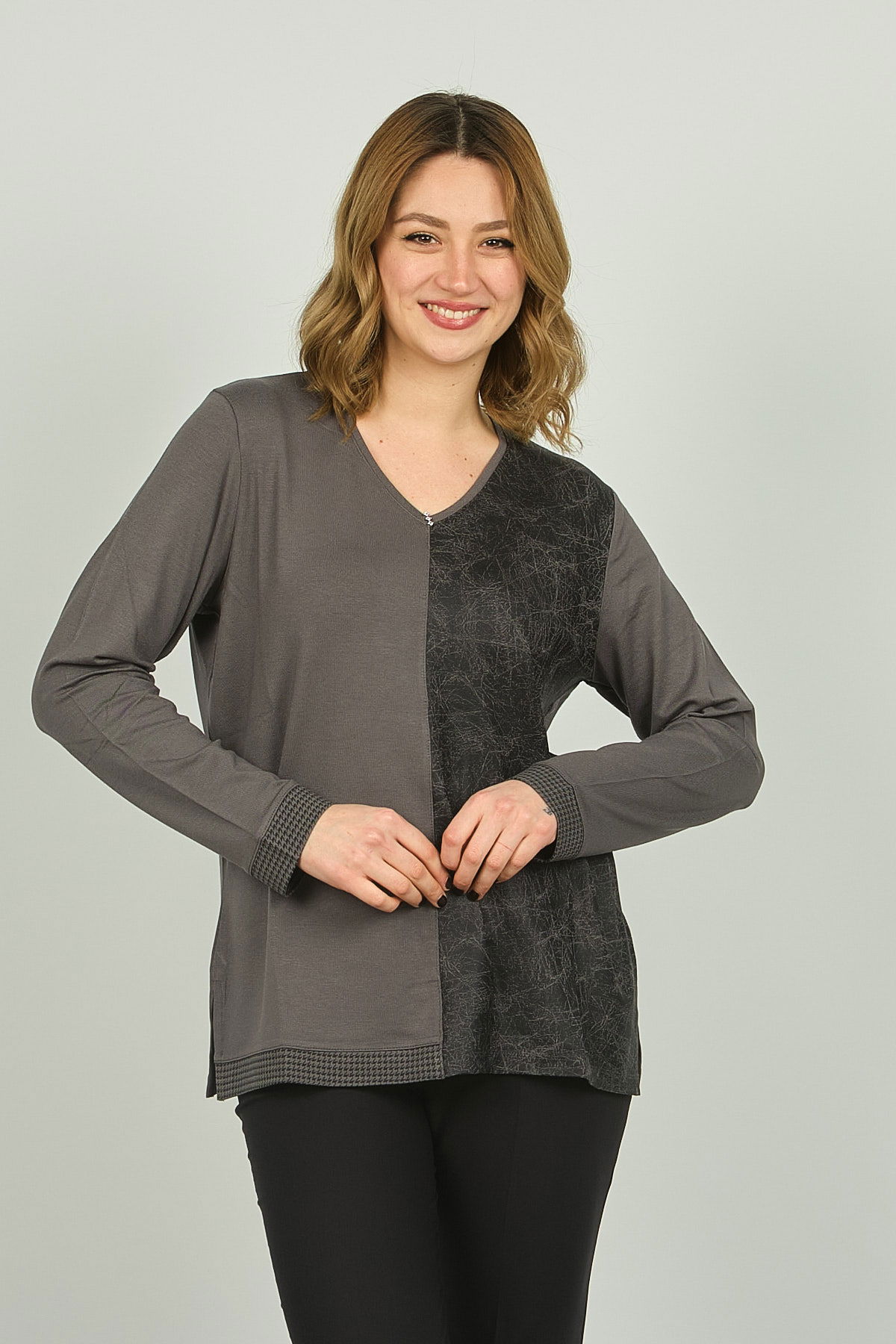 Detay: V yaka, suni deri görünümlü, uzun kol bluz;