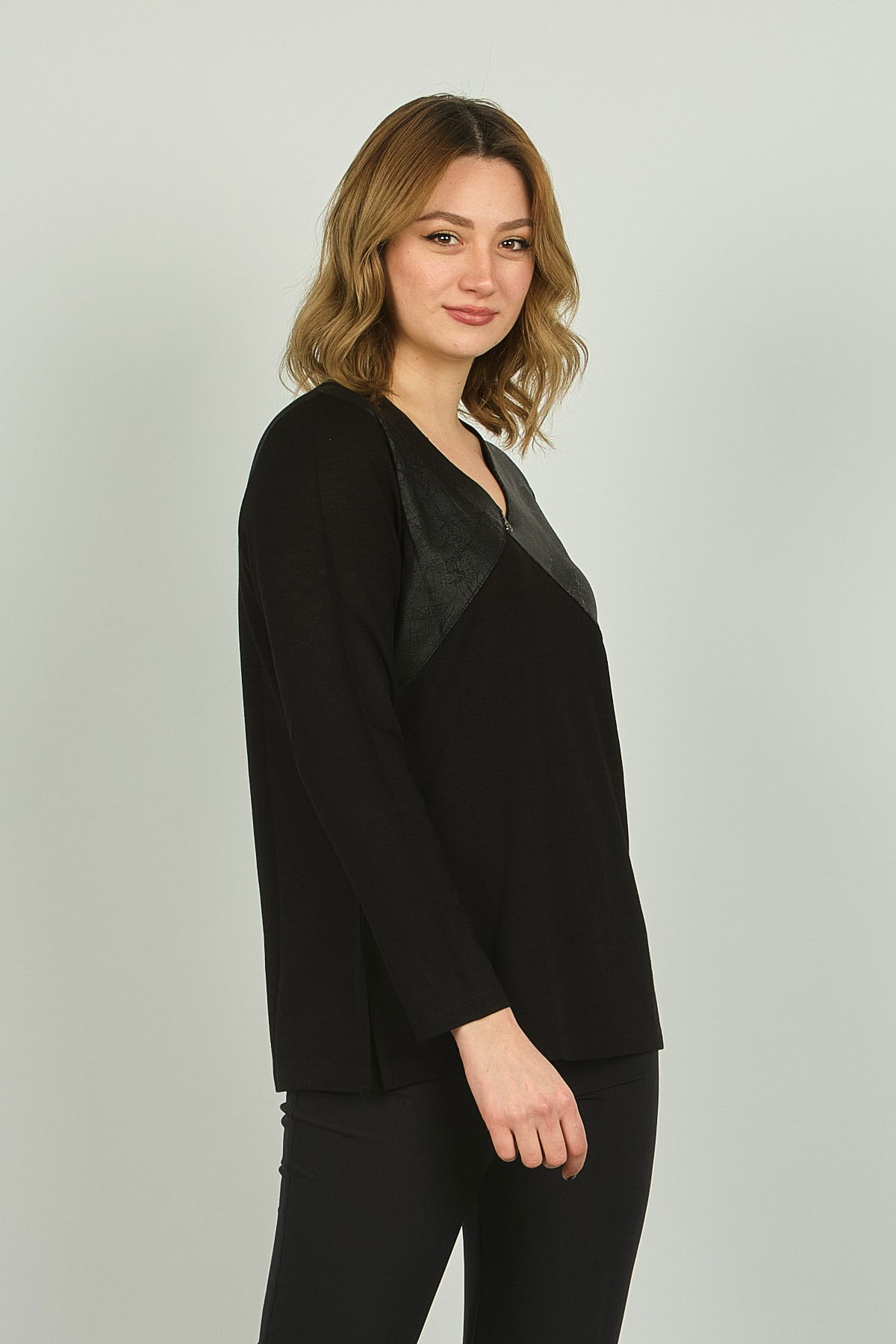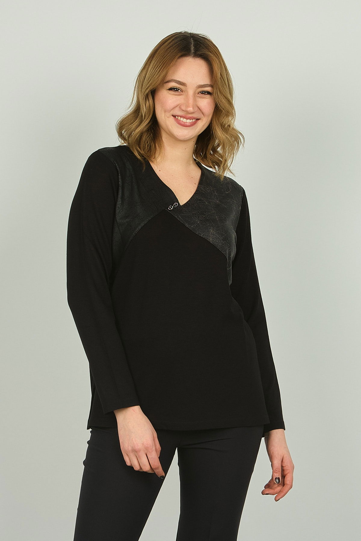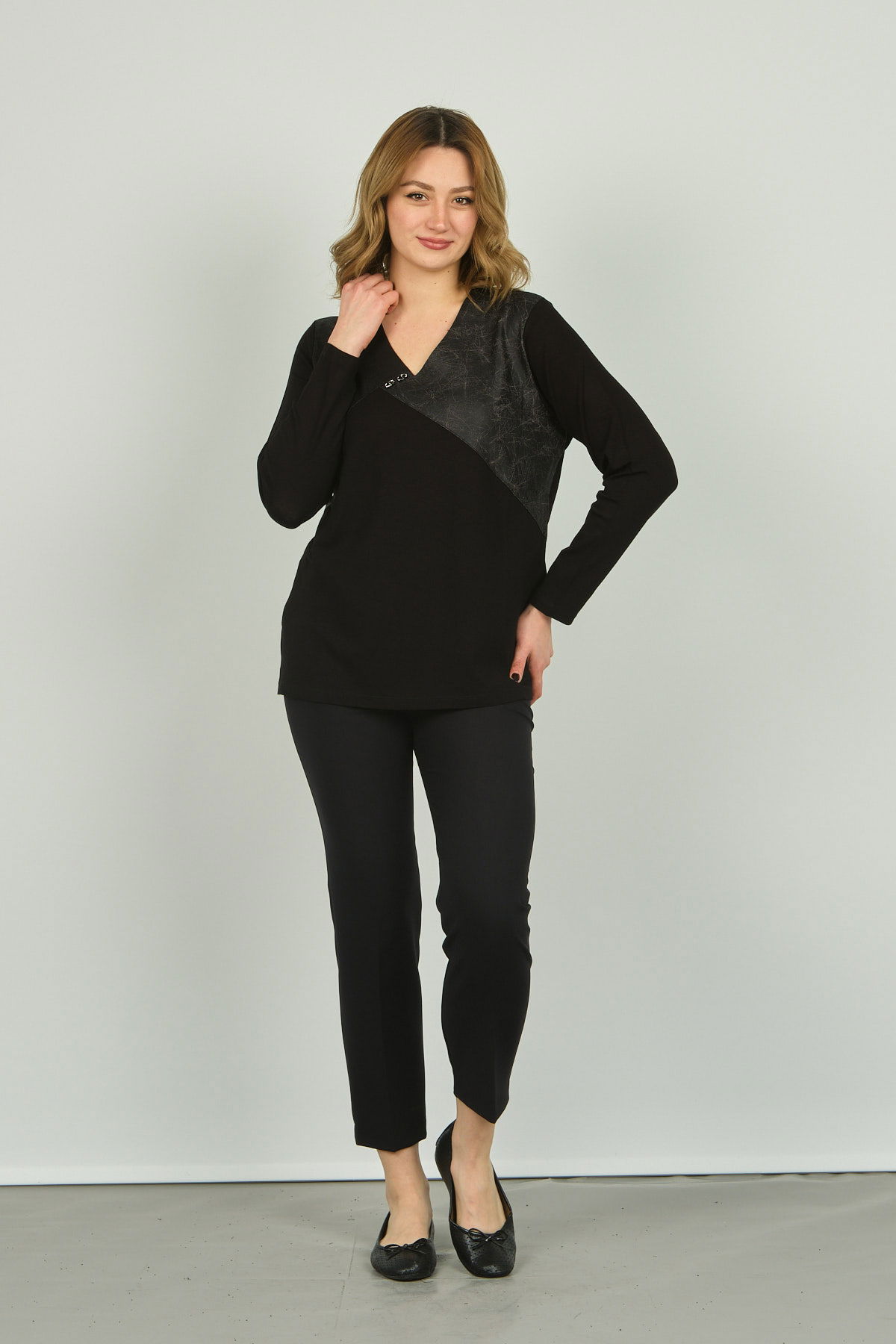 Detay Triko Kadın V Yaka Suni Deri Detaylı Uzun Kol Bluz 4549 Siyah-Yeşil