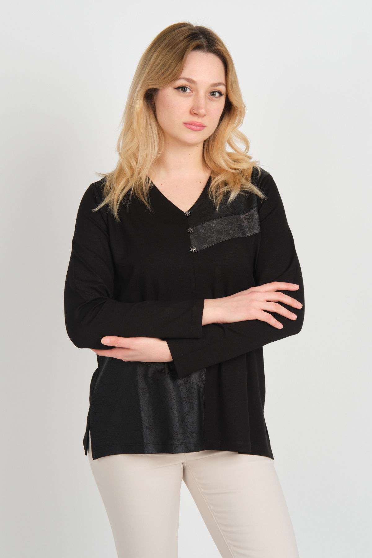 Detay Triko Kadın V Yaka Suni Deri Detaylı Uzun Kol Bluz 4551 Siyah