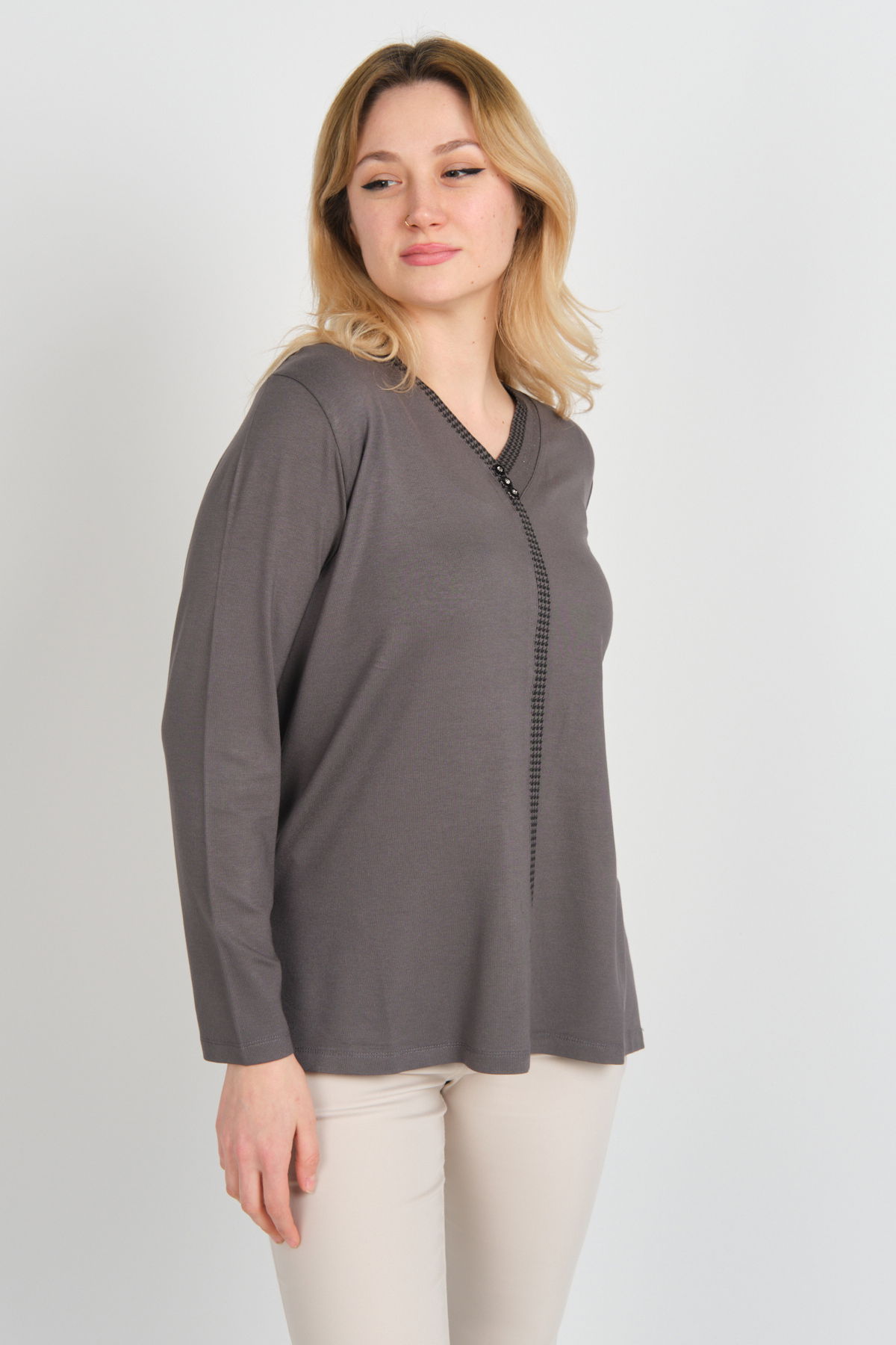 Detay: V yaka, taş detaylı, uzun kol bluz;