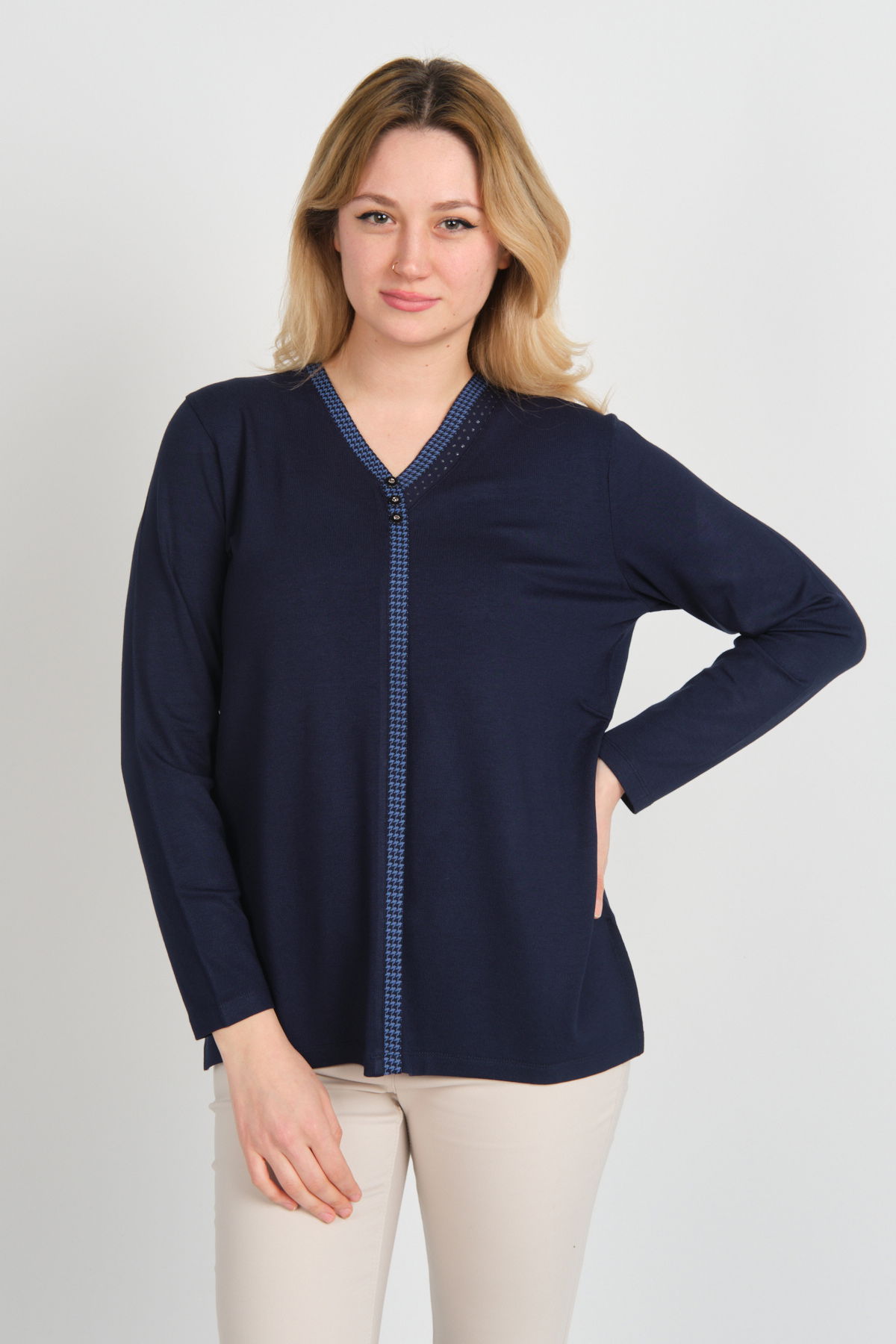Detay Triko Kadın V Yaka Taş Detaylı Uzun Kol Bluz 4506 Lacivert