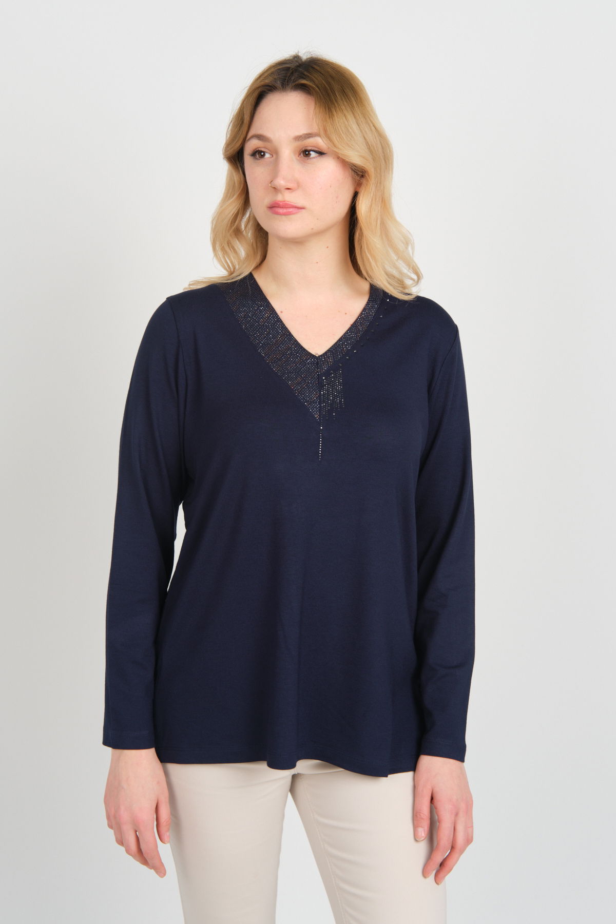 Detay: V yaka, taşlı, desenli, uzun kol bluz;