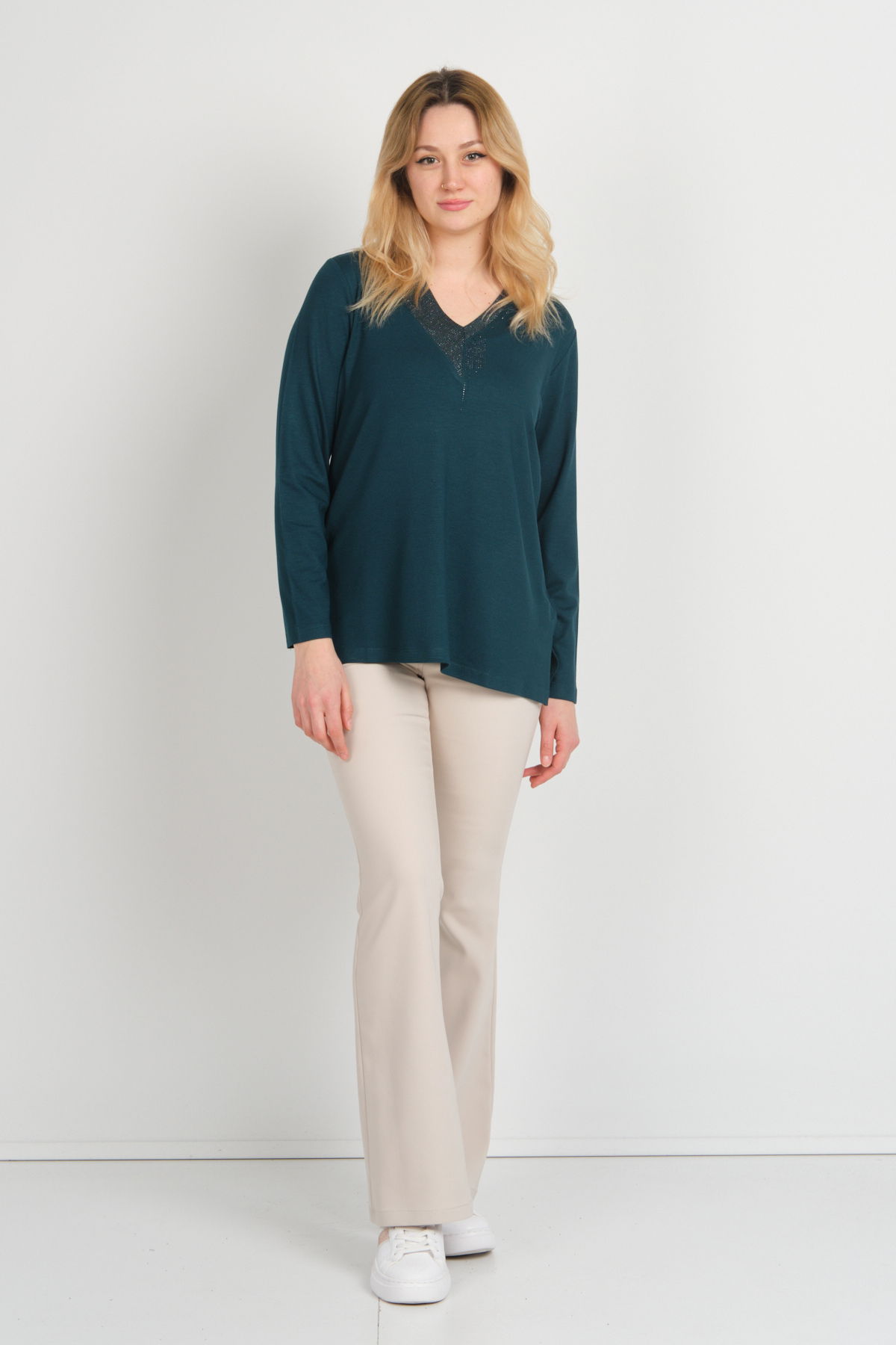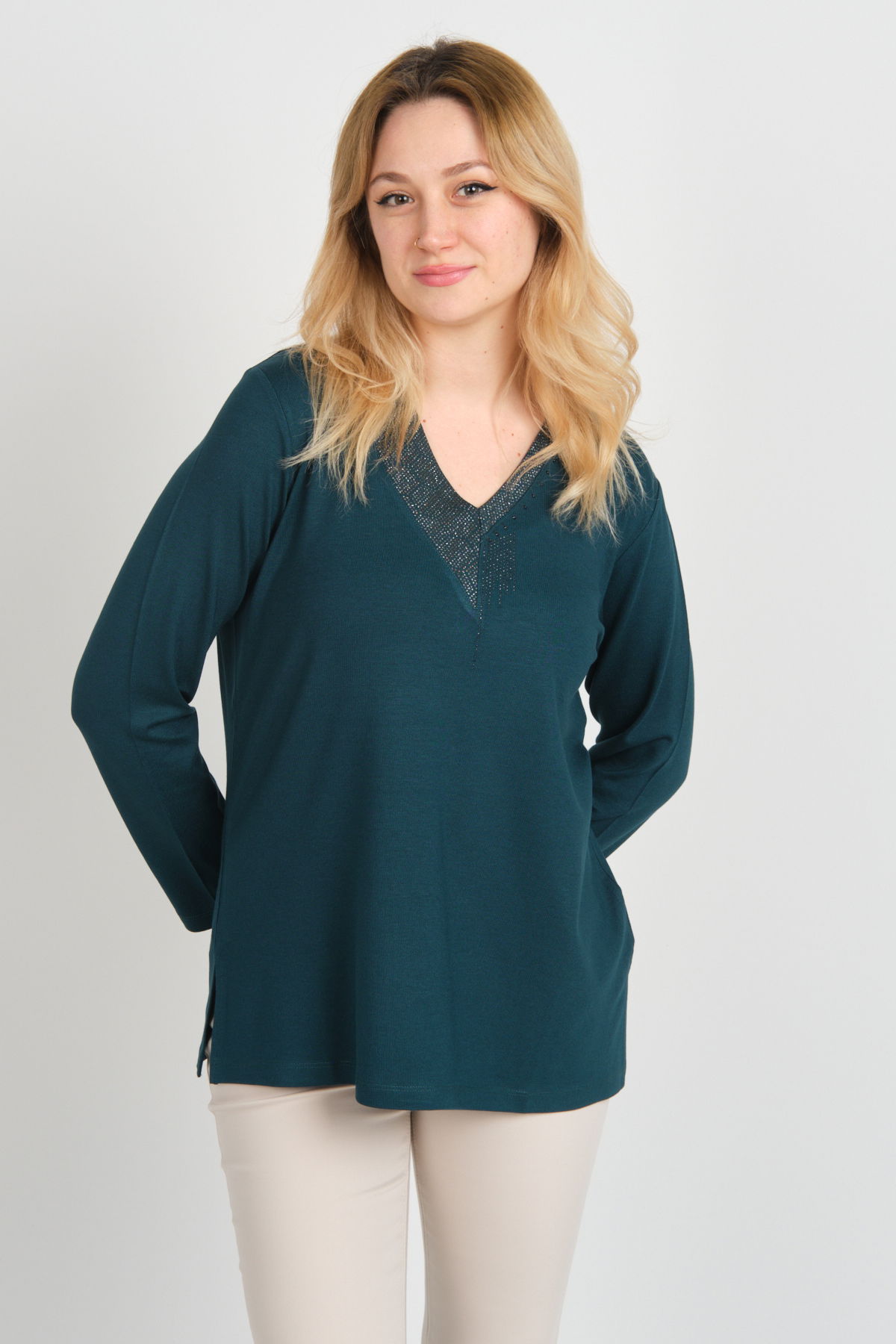 Detay Triko Kadın V Yaka Taş Süslemeli Uzun Kol Bluz 4588 Zümrüt