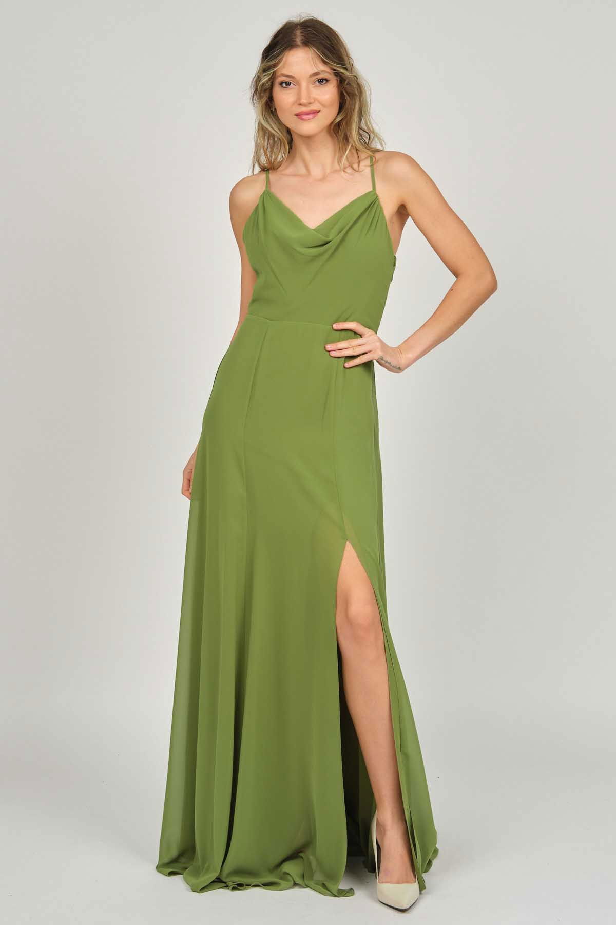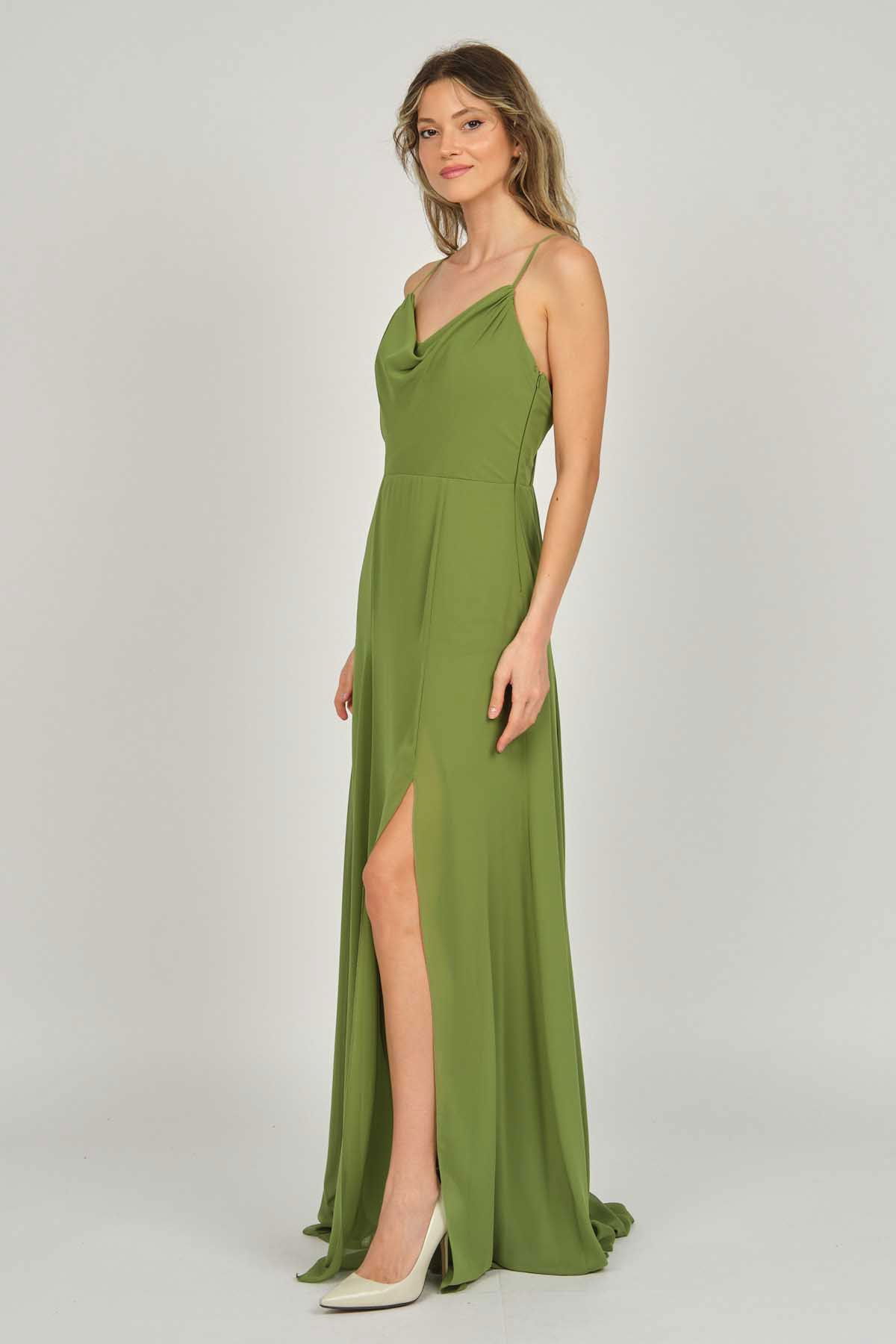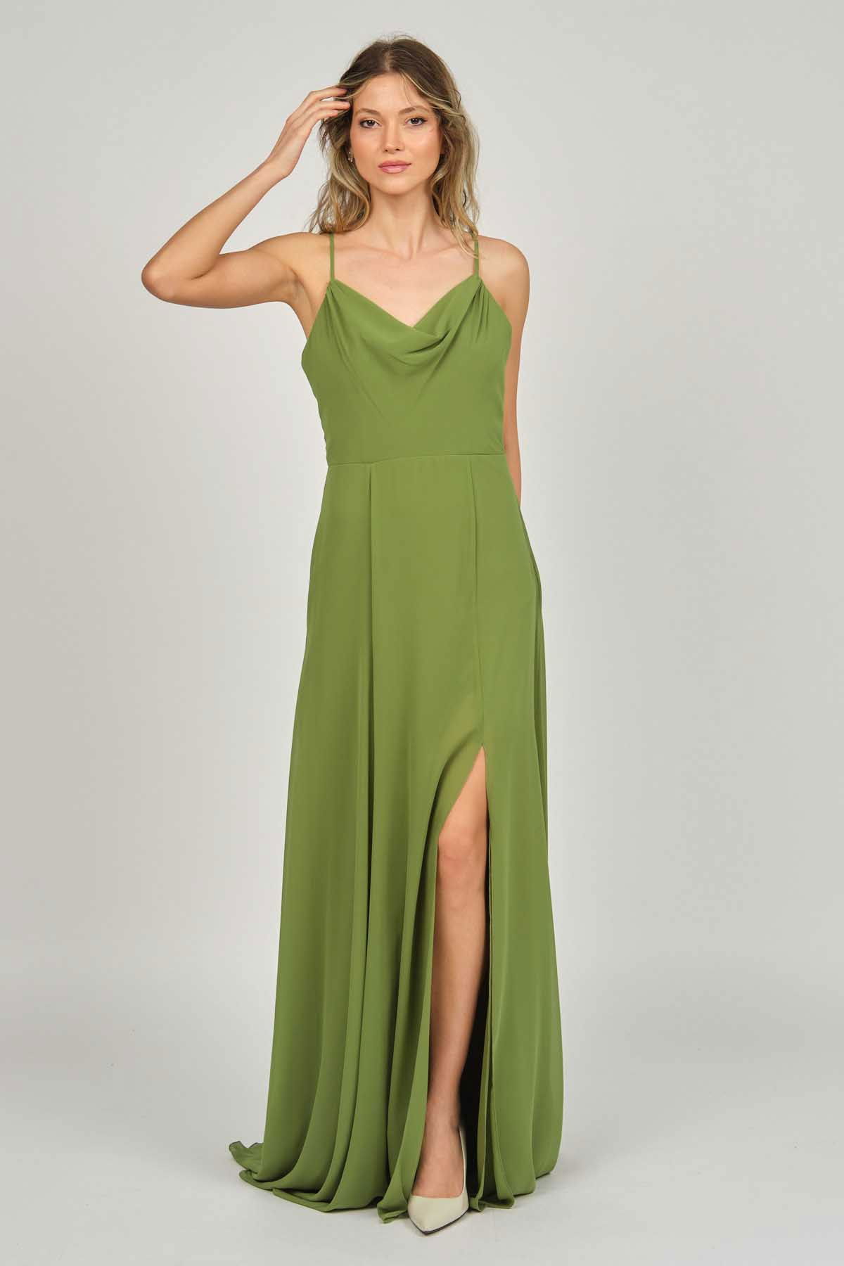 Detay: Şifon, derin yırtmaçlı, degaje yaka, sırt detaylı, astarlı abiye elbise;