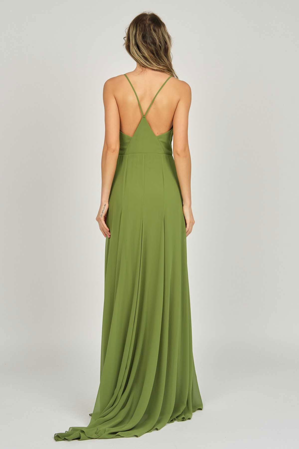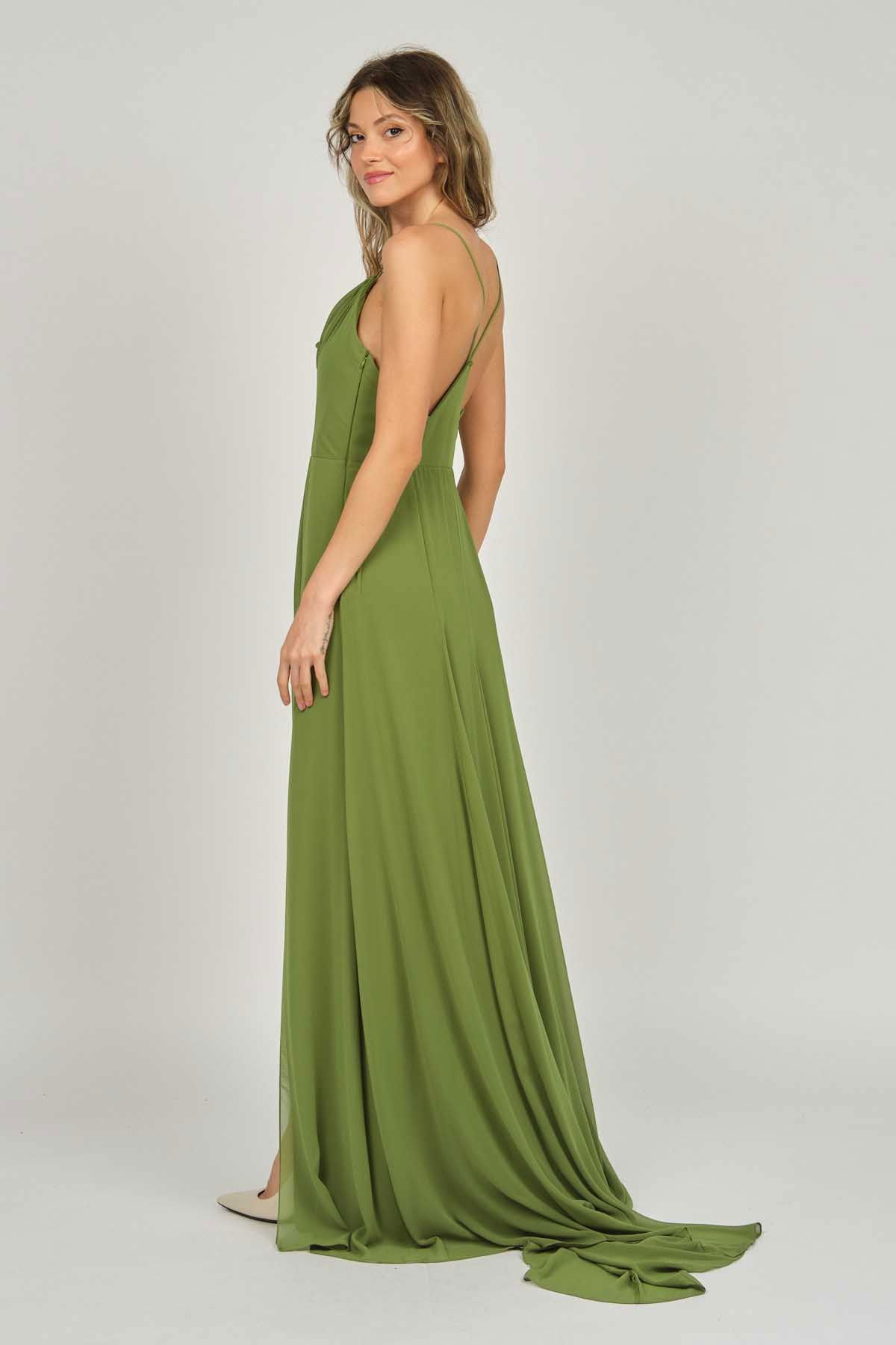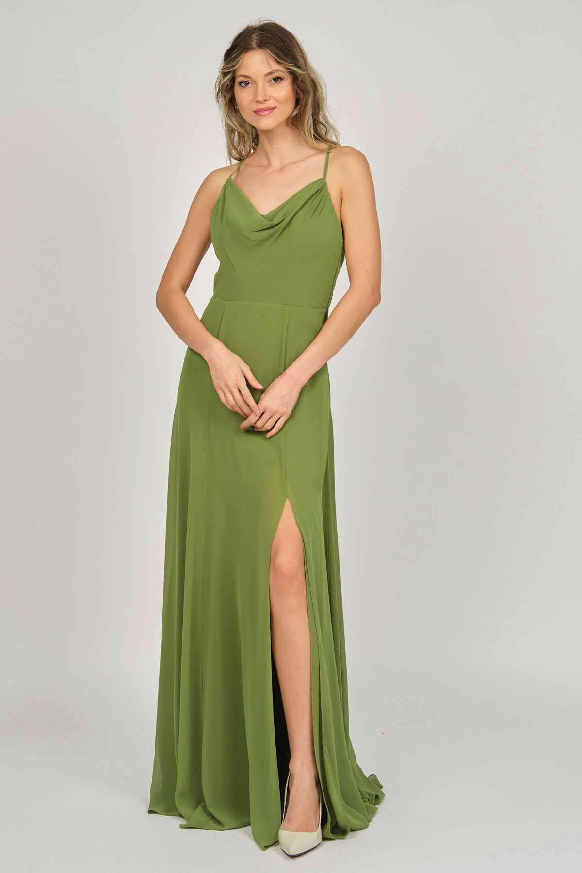 Detay: Şifon, derin yırtmaçlı, degaje yaka, sırt detaylı, astarlı abiye elbise;