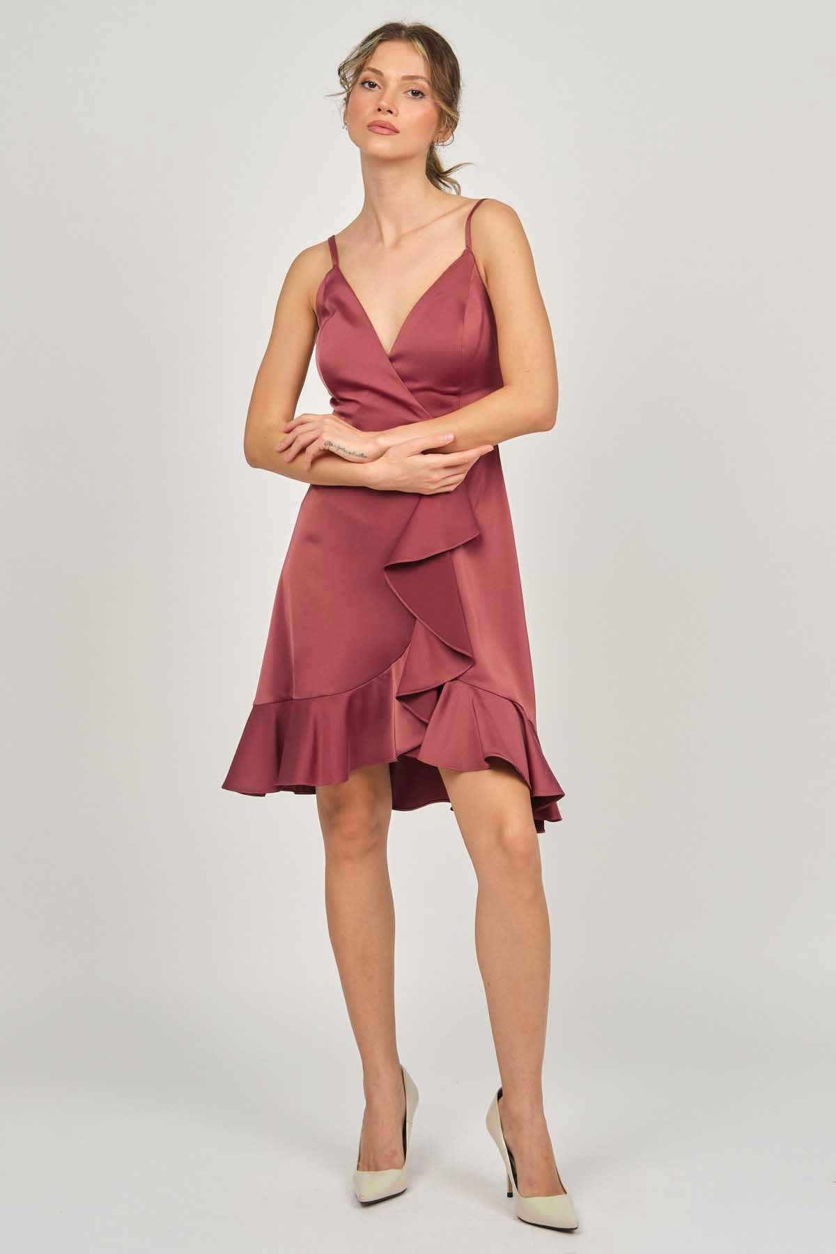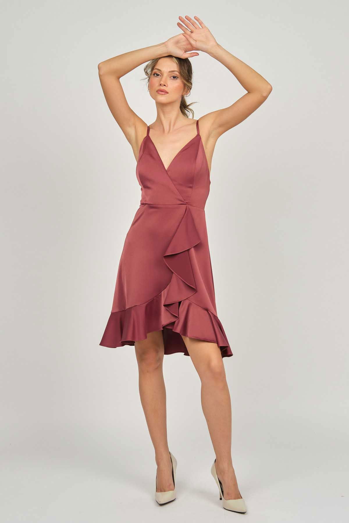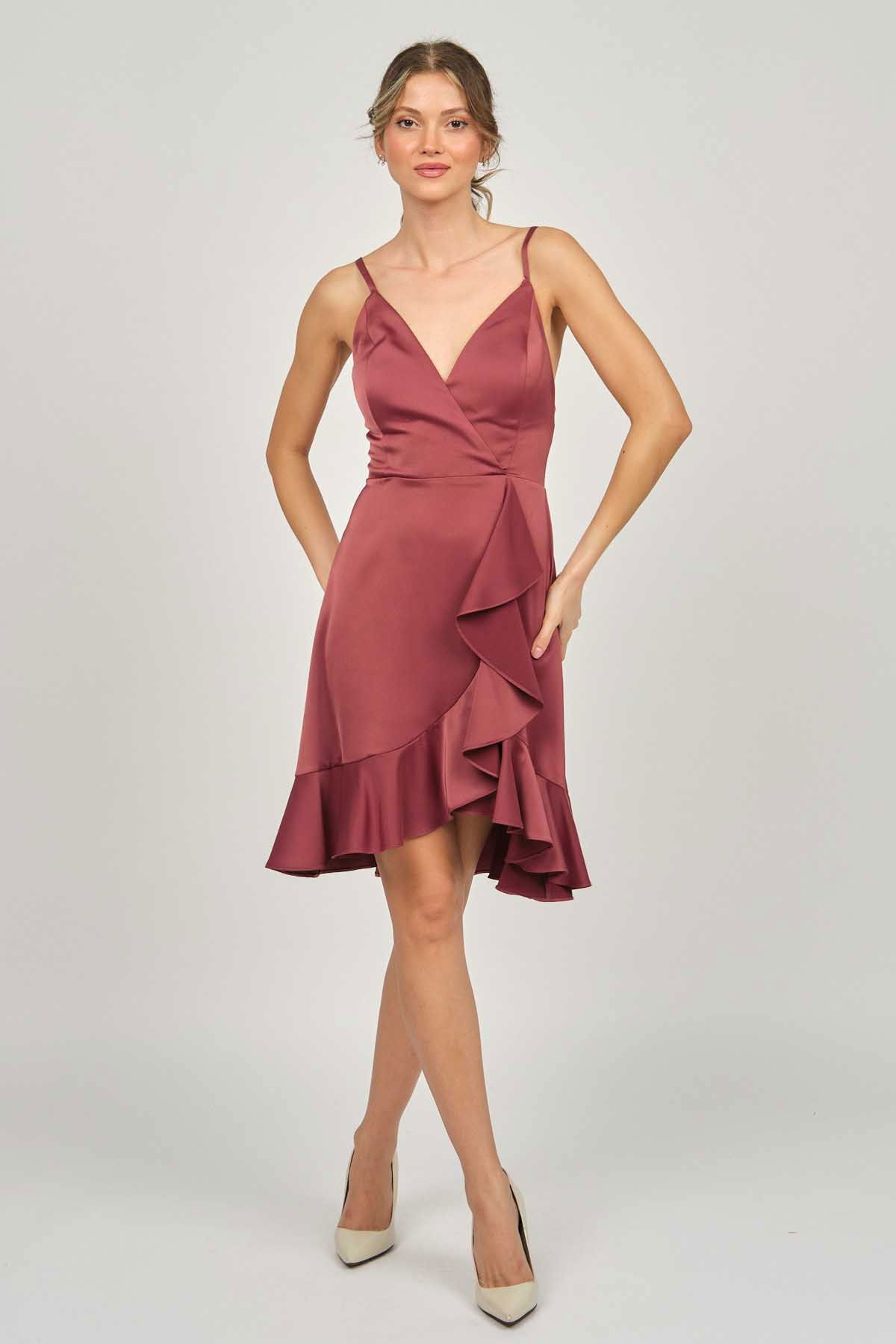 Detay: Valonlu, belden bağlamalı, sırt detaylı, astarlı abiye elbise;