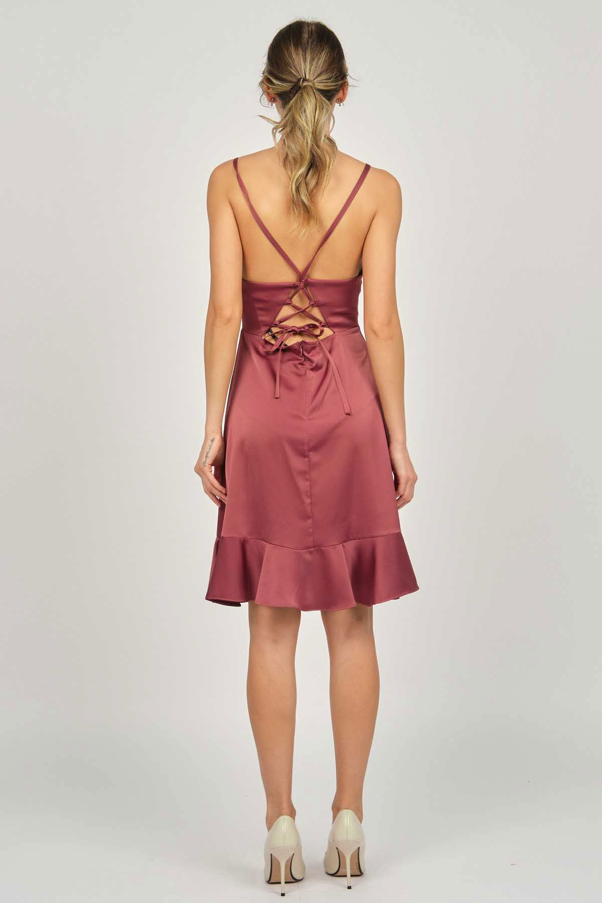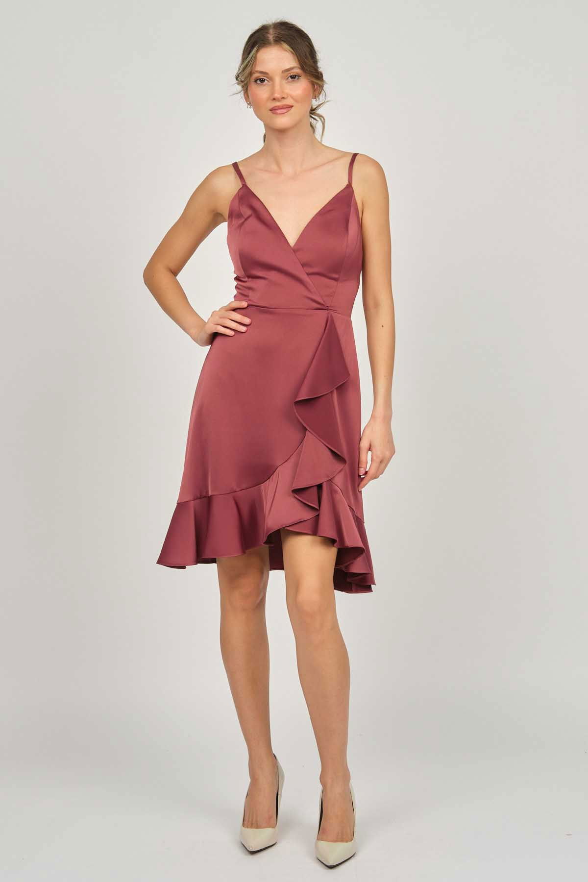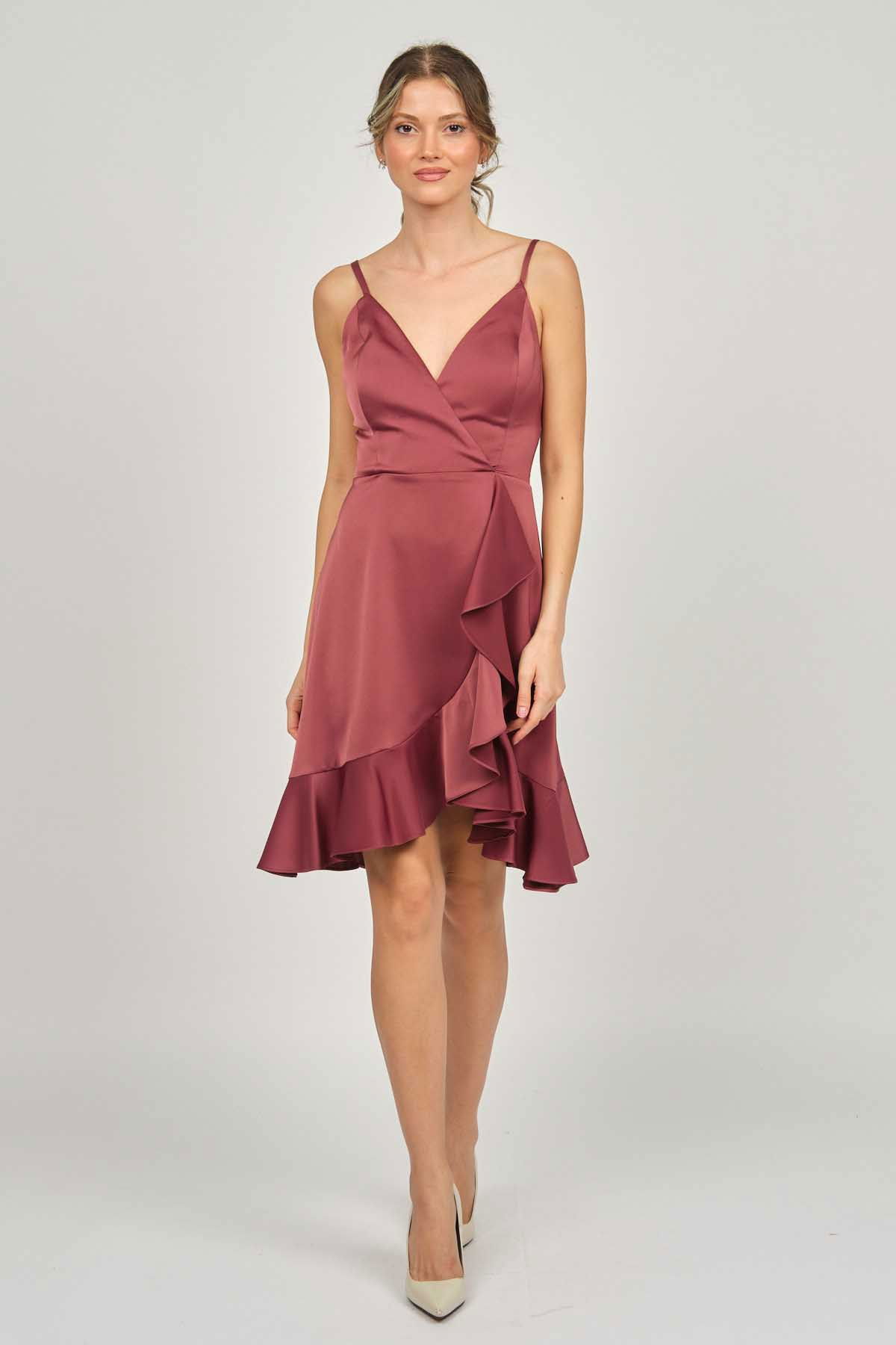 Detay: Valonlu, belden bağlamalı, sırt detaylı, astarlı abiye elbise;