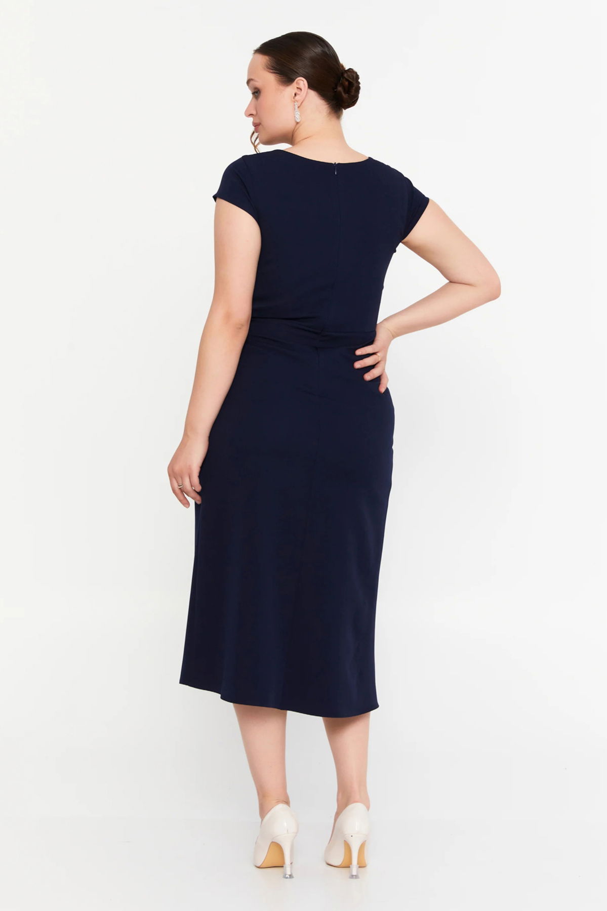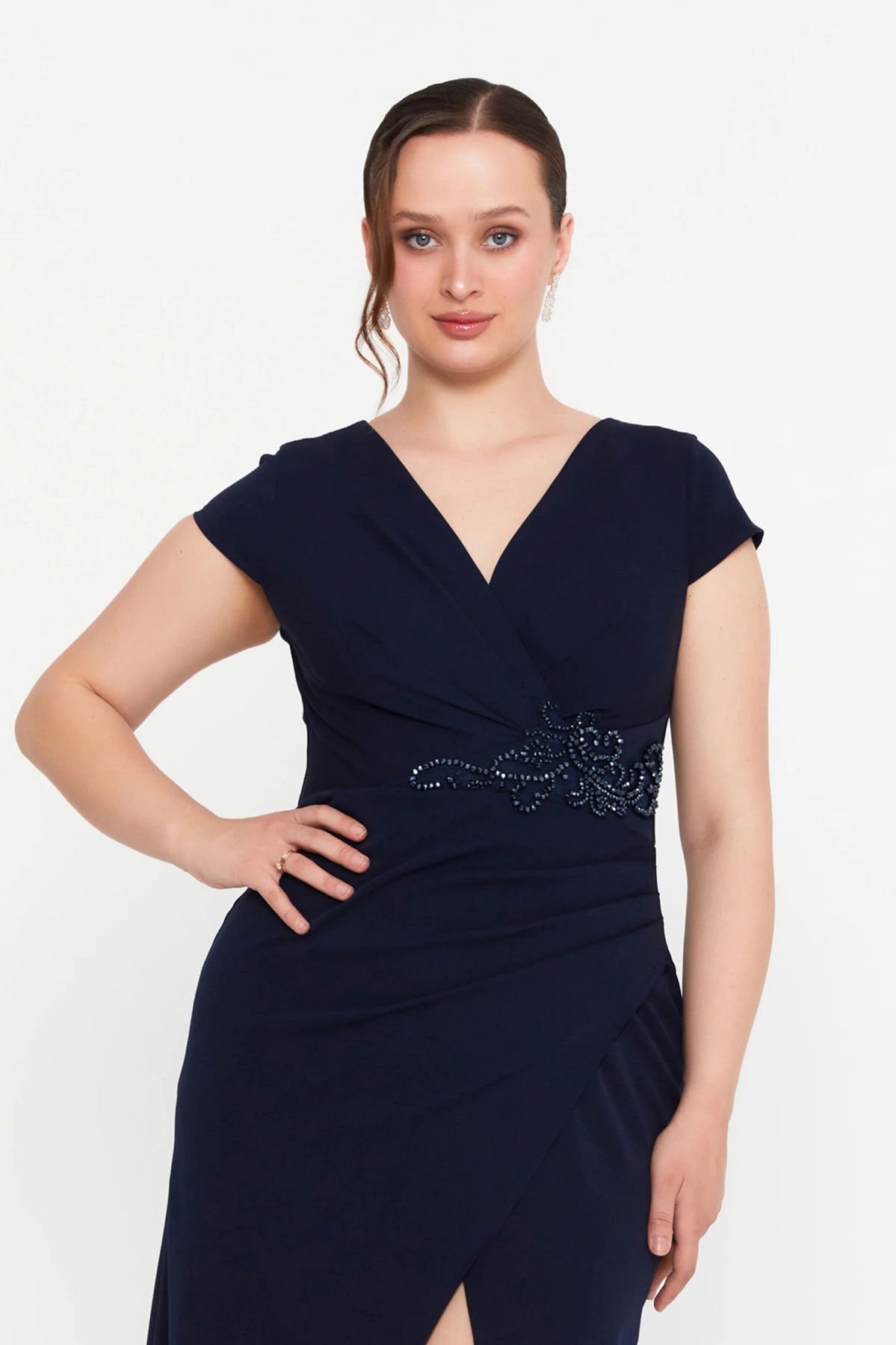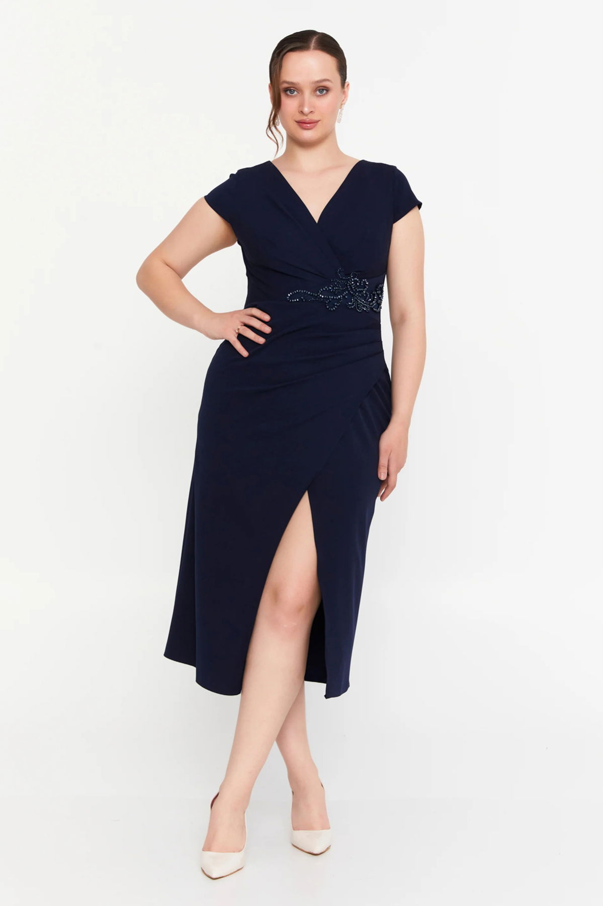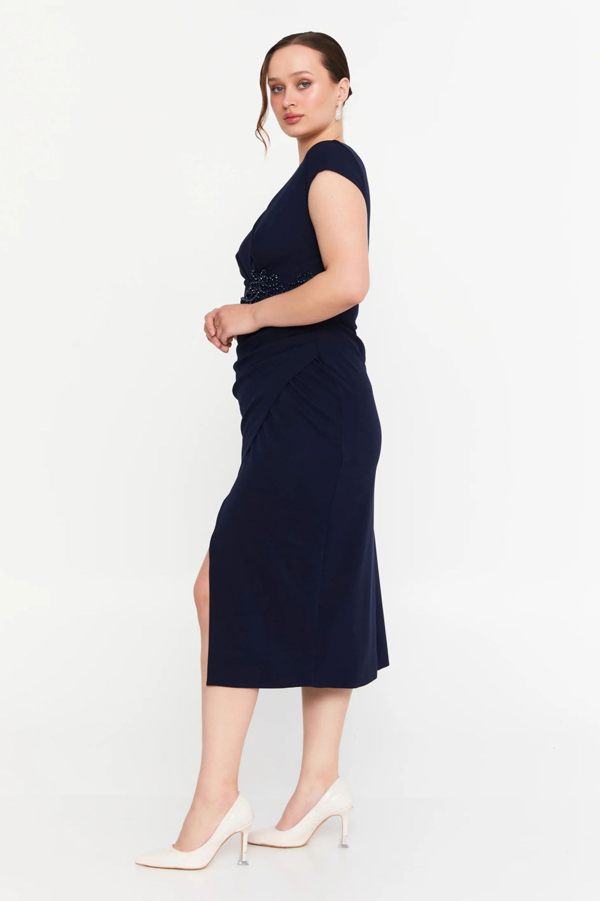 Detay: Dar kalıp tasarımıyla vücudu zarif şekilde saran kruvaze beli taş detaylı midi abiye elbise, krep kumaşı ve anvelop etek formuyla şık bir siluet sunar. Kısa kol tasarımı, bel kısmındaki taş detayıyla birleşerek elbiseye feminen ve göz alıcı bir hava katar. Astarlı yapısı ve fermuarlı kapaması sayesinde hem konforlu hem de özel davetler için ideal bir midi abiye elbise seçeneğidir;