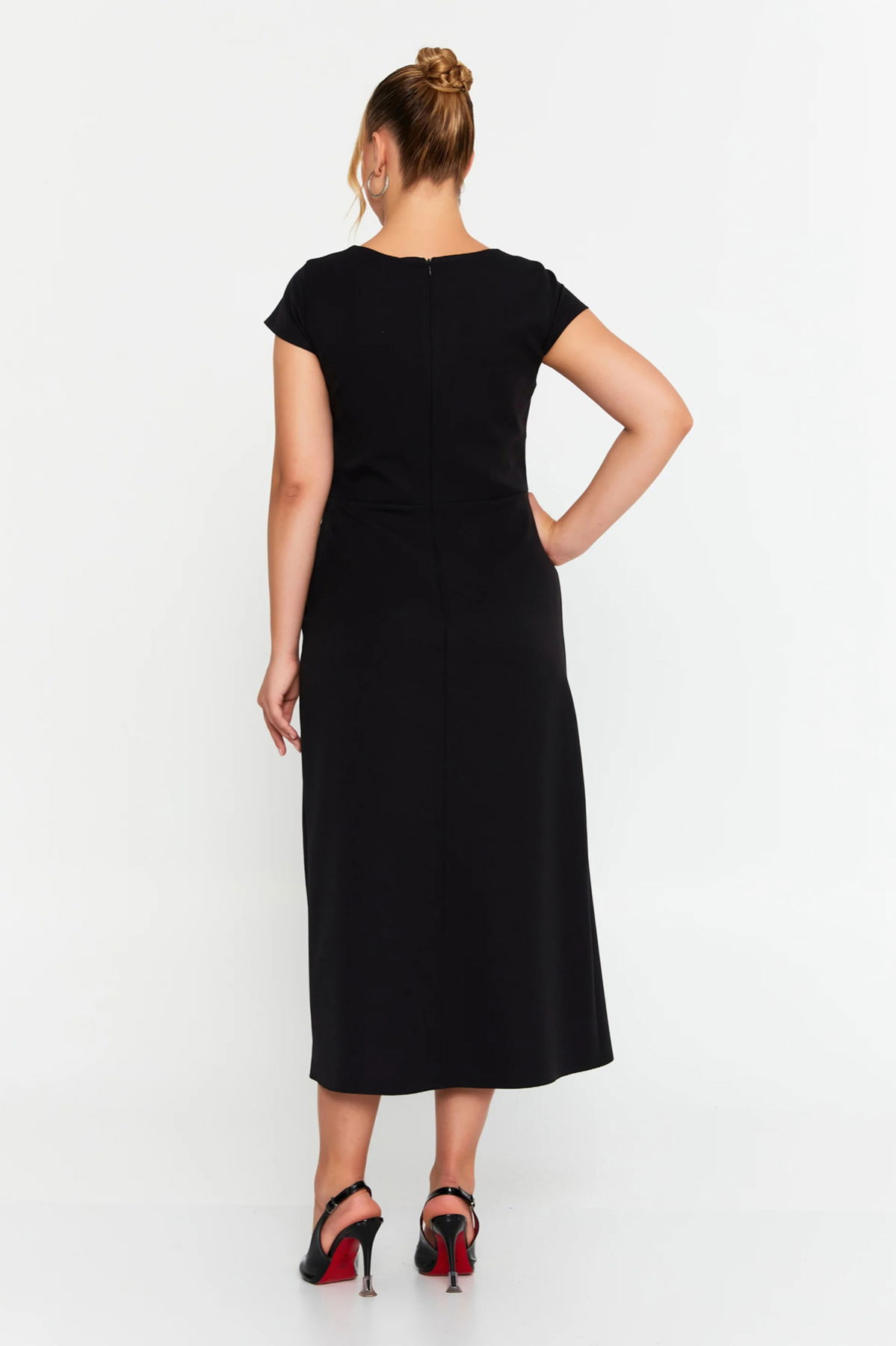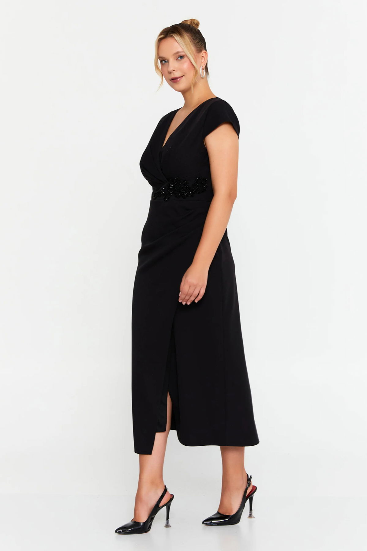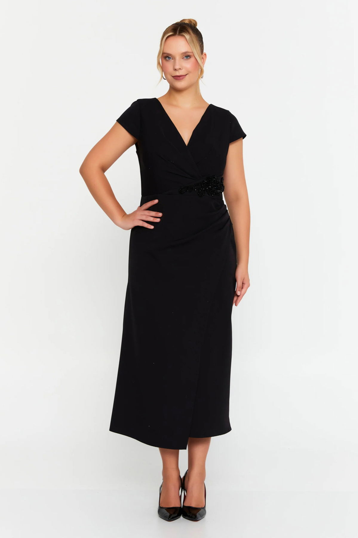 Doridorca Kadın Büyük Beden Kruvaze Beli Taş Detaylı Kısa Kol Midi Abiye Elbise 7023 Siyah