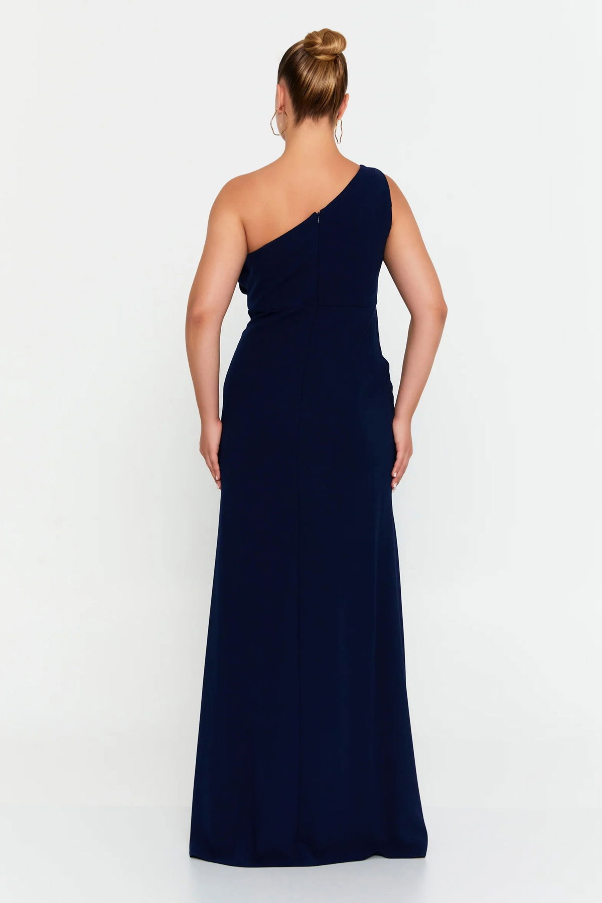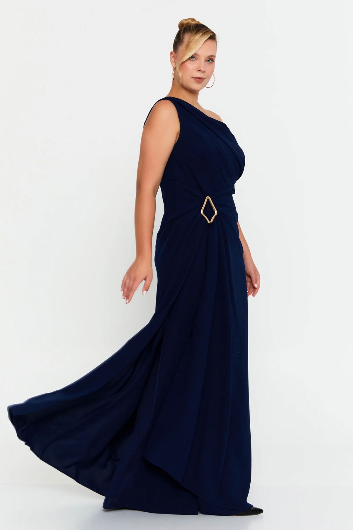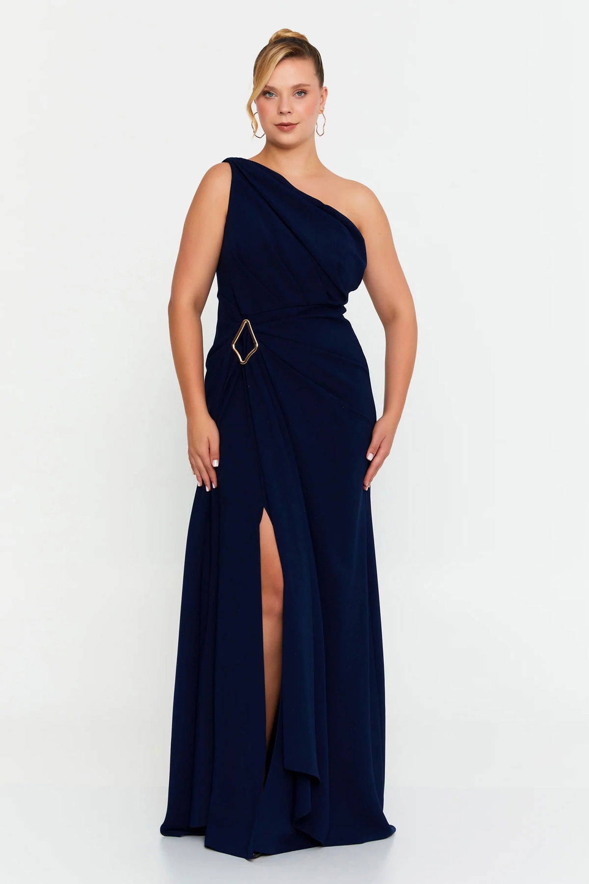 Doridorca Kadın Büyük Beden Tek Omuz Detaylı Derin Yırtmaçlı Abiye Elbise 7132 Lacivert