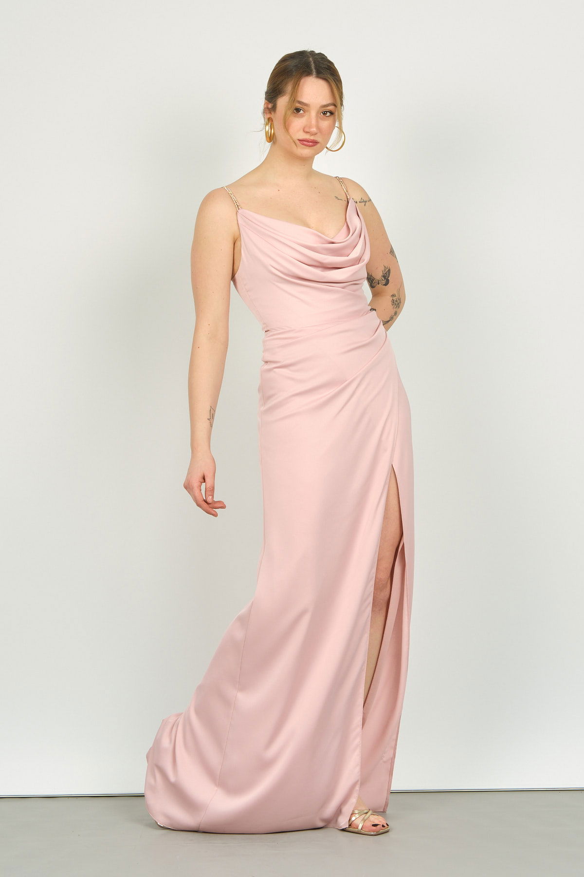 Doridorca Kadın Degaje Yaka Abiye Elbise 4116 Pudra