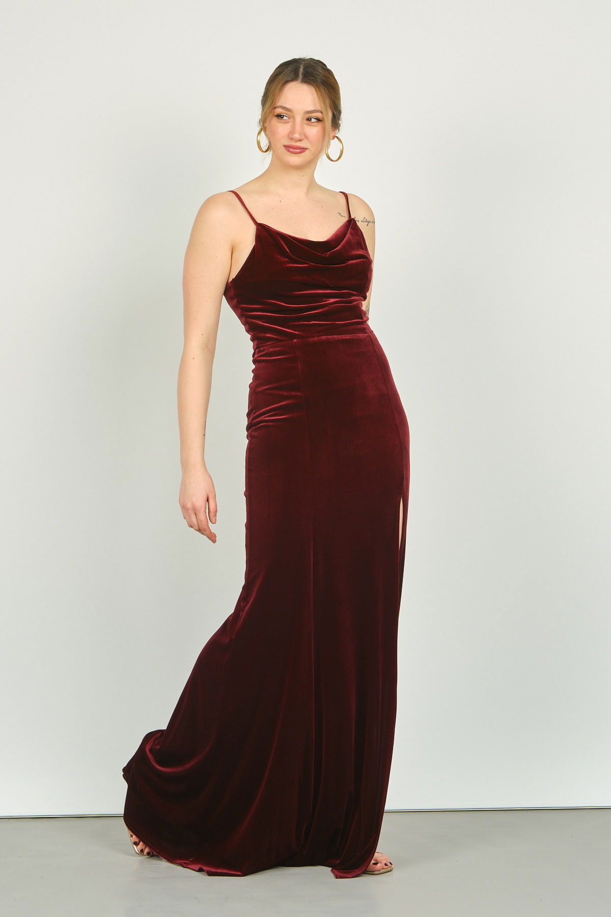 Detay: Derin yırtmaçlı, drapeli, uzun, astarlı abiye elbise;