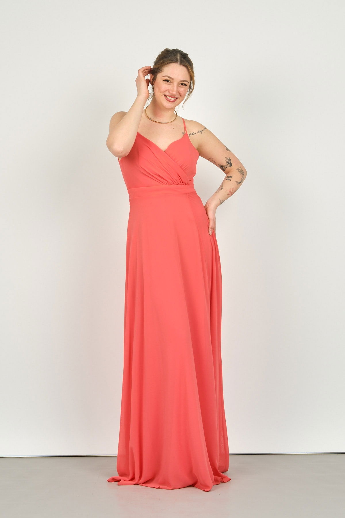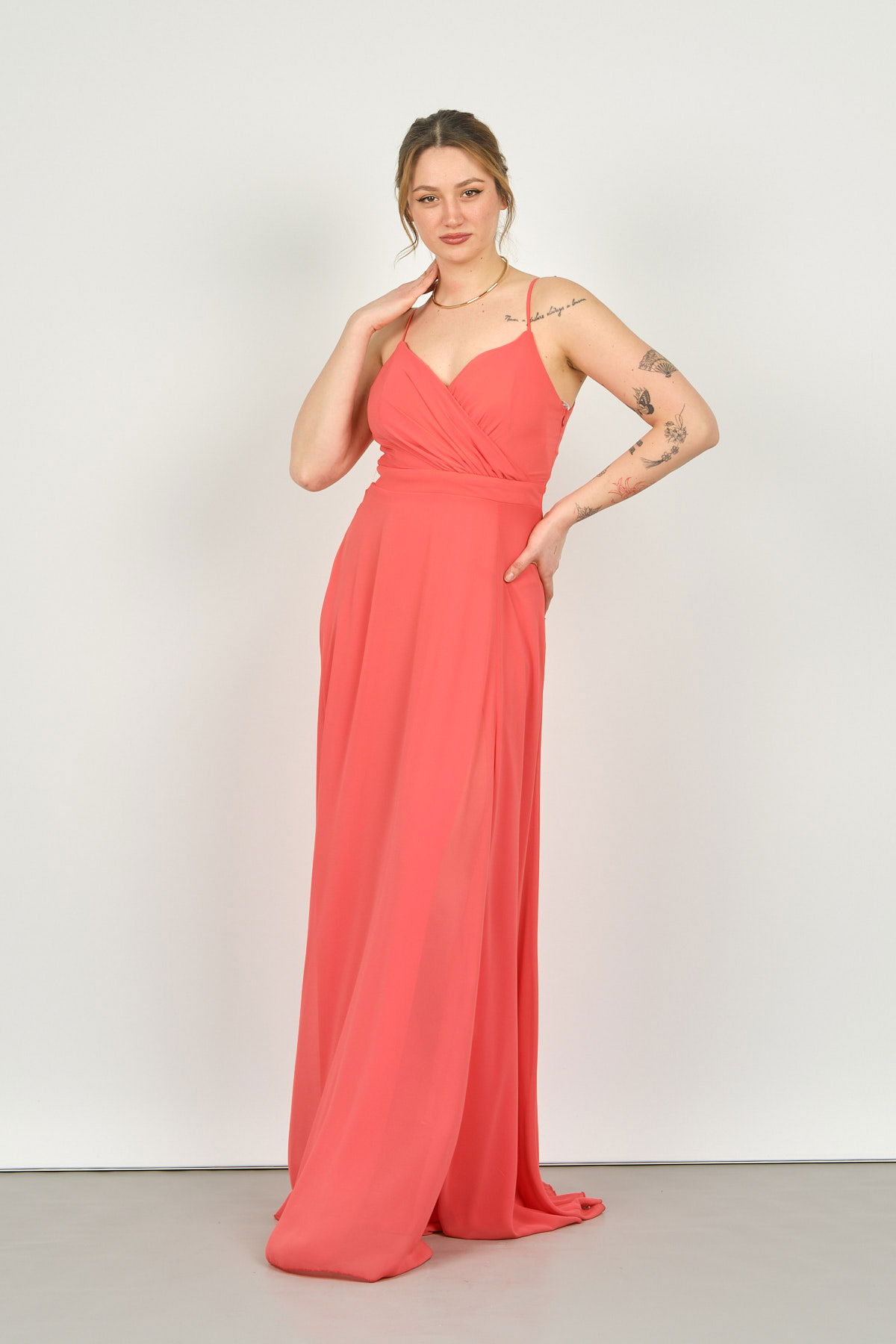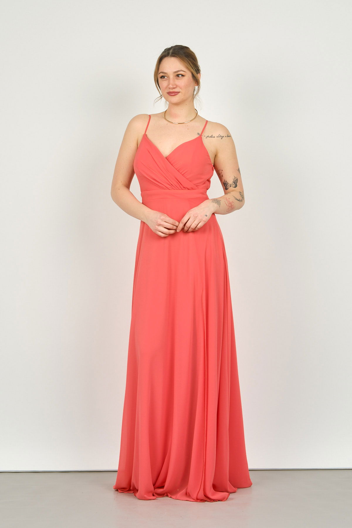 Detay: İp askılı, derin yırtmaçlı, uzun, astarlı abiye elbise;