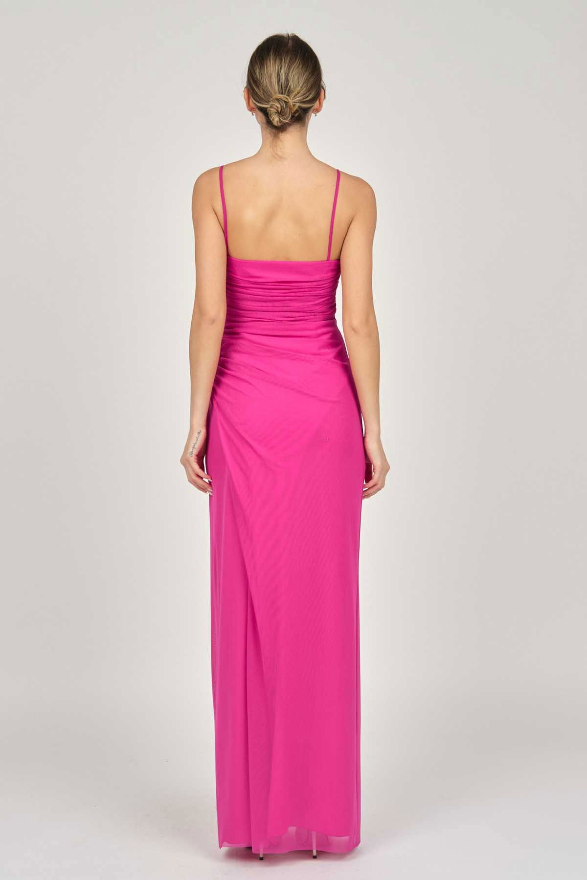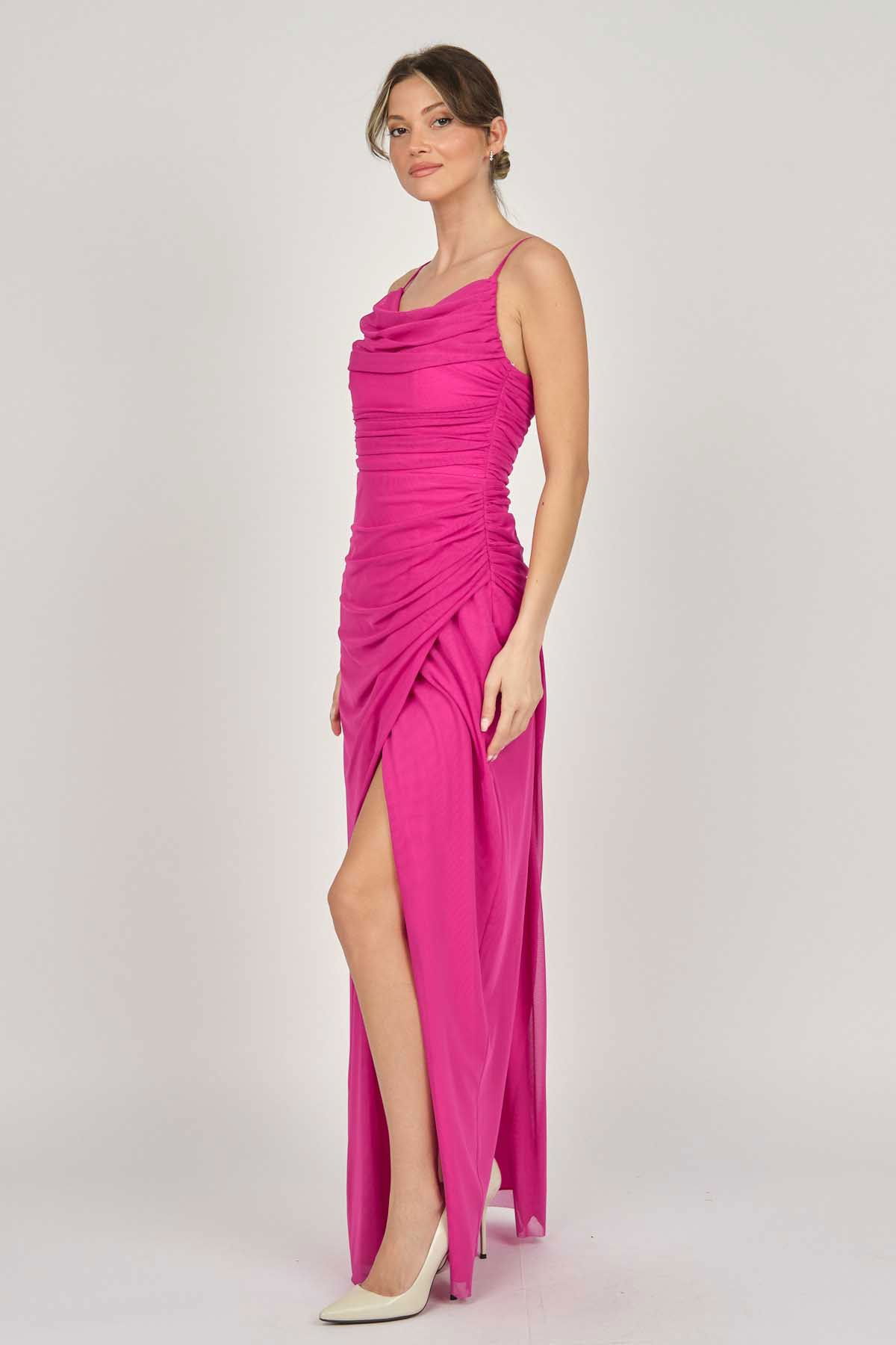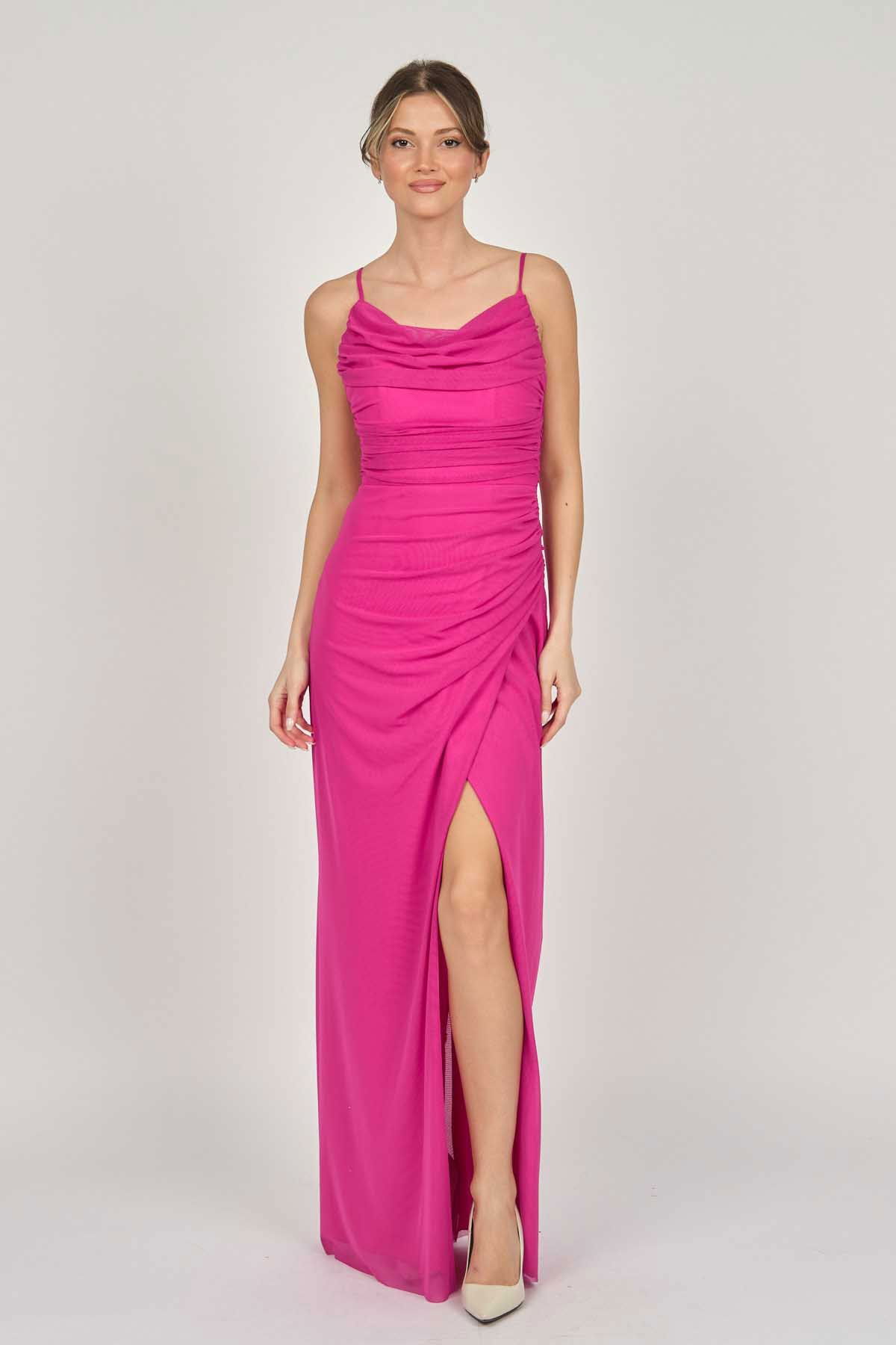 Detay: Askılı, drapeli, ön-arka yırtmaçlıi astarlı abiye elbise;