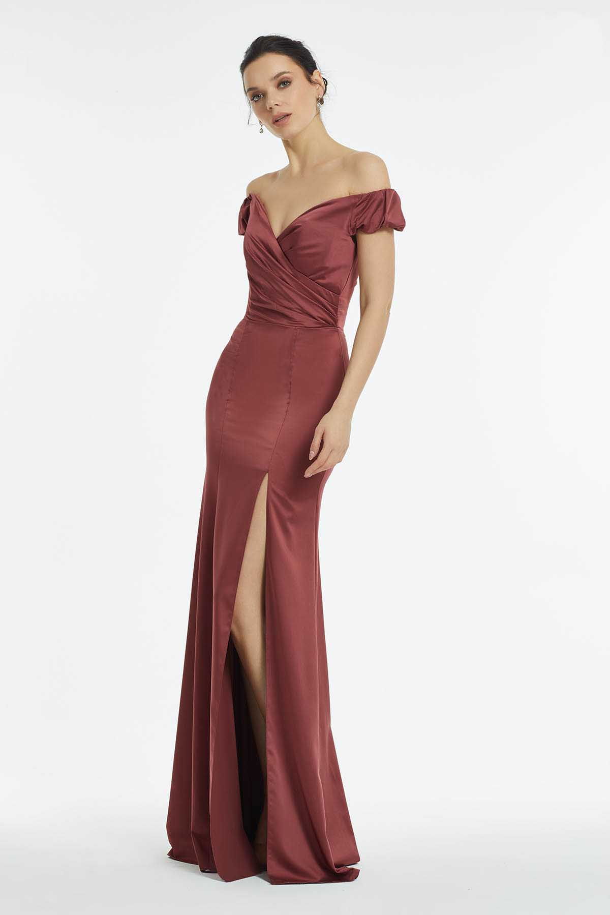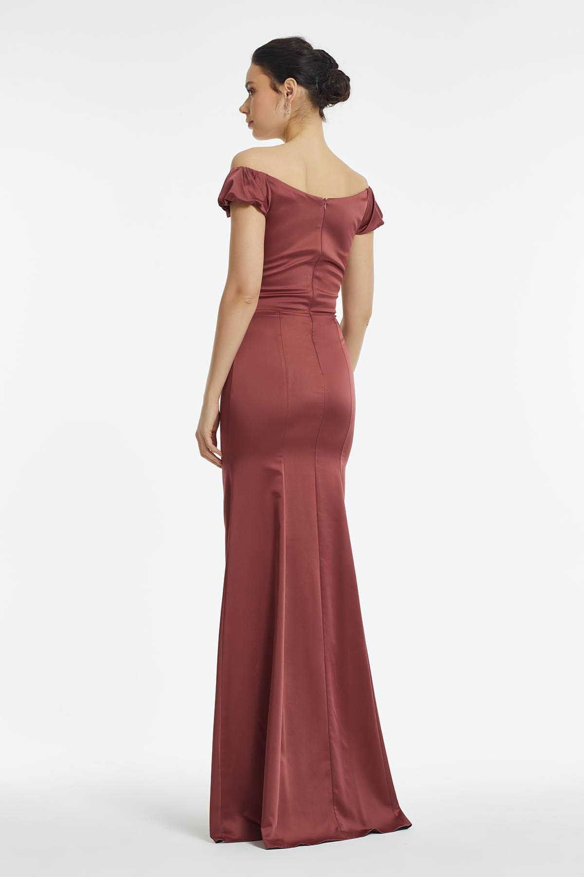 Detay: Düşük kol, derin yırtmaç, saten, astarlı abiye elbise;
