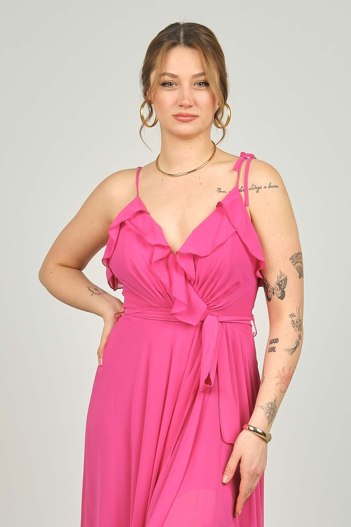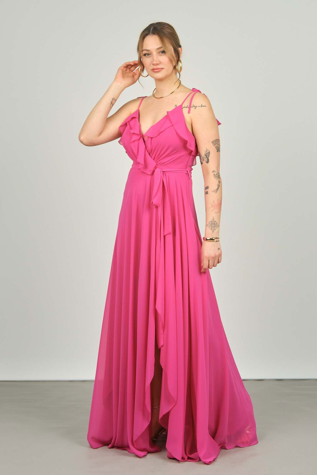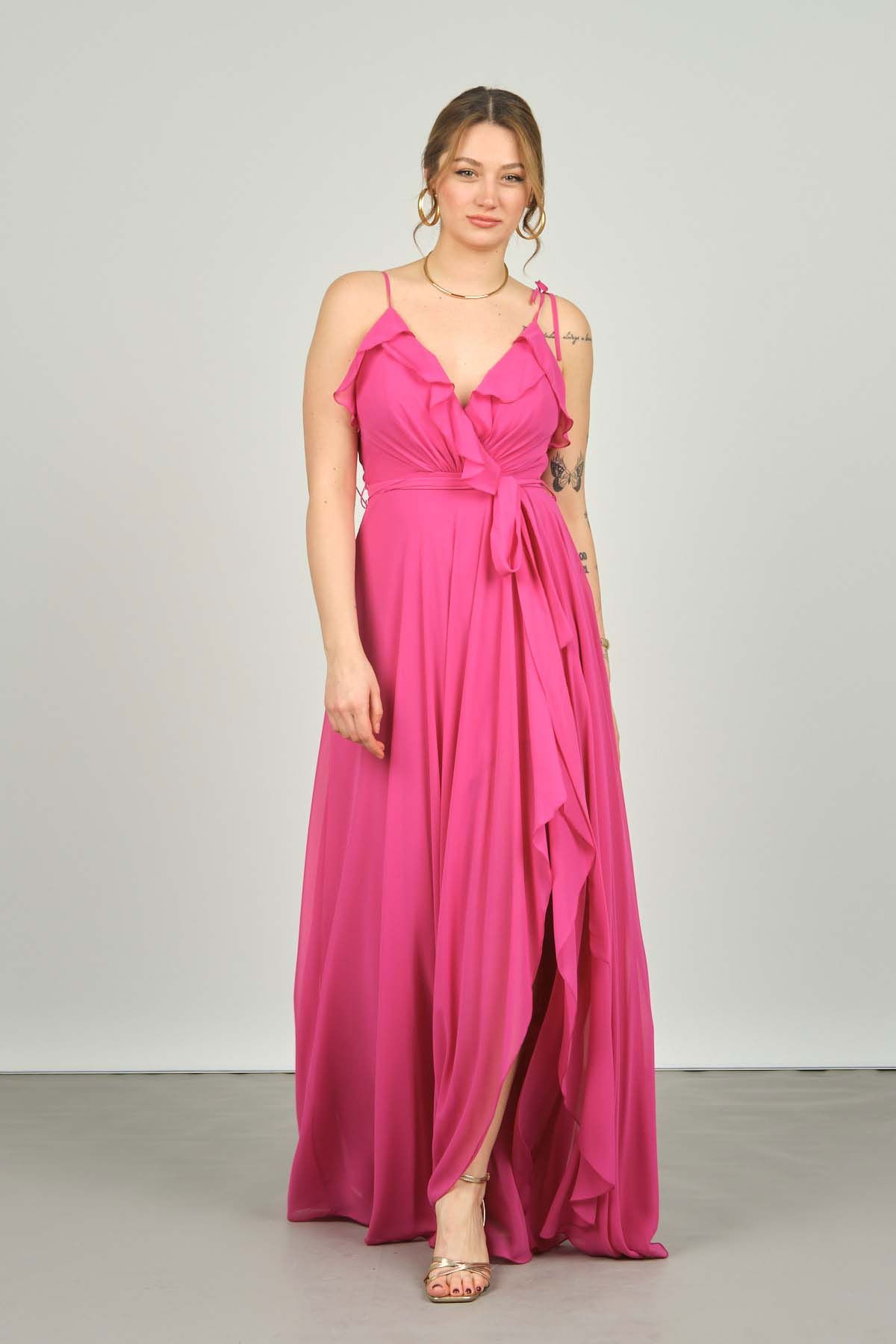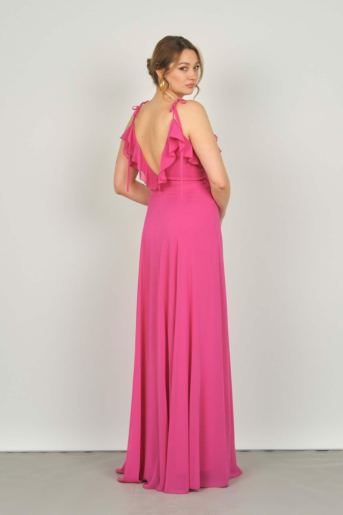 Detay: V yaka, sırt detaylı, uzun astarlı abiye elbise ;